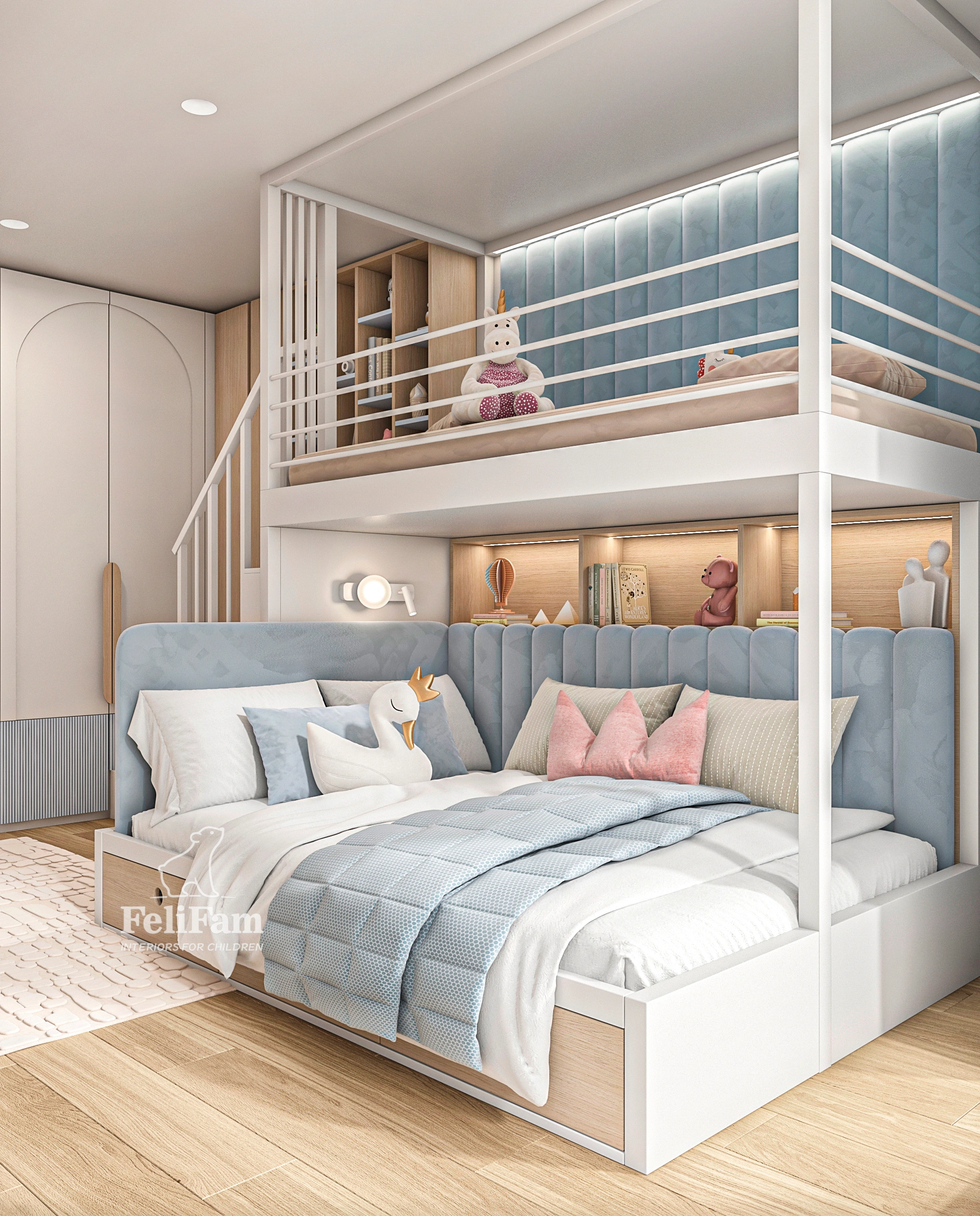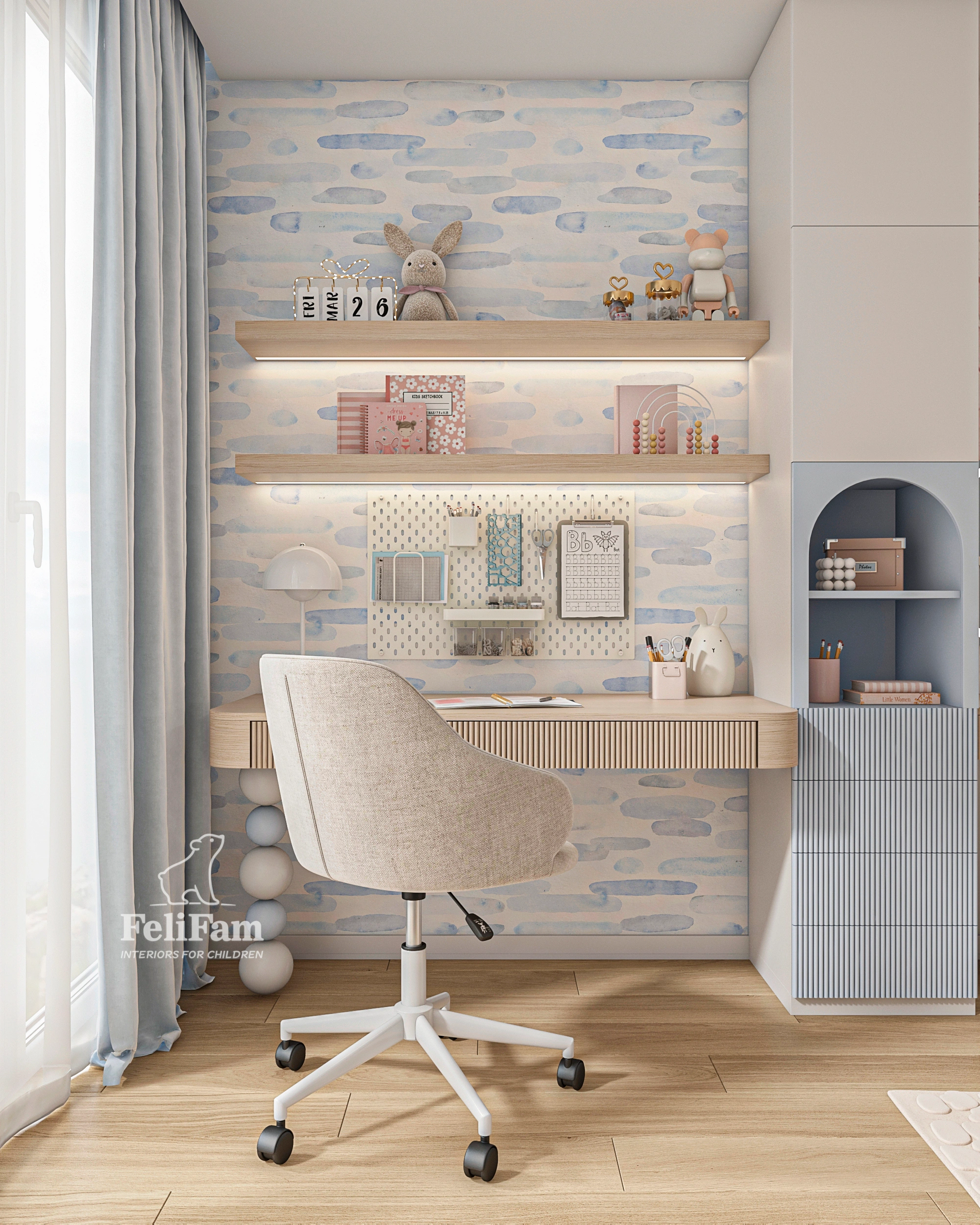 This girl’s bedroom design is executed in a soft light blue palette with a focus on contemporary Scandinavian style. The space feels light and airy thanks to bright tones, natural materials, and carefully planned lighting.
