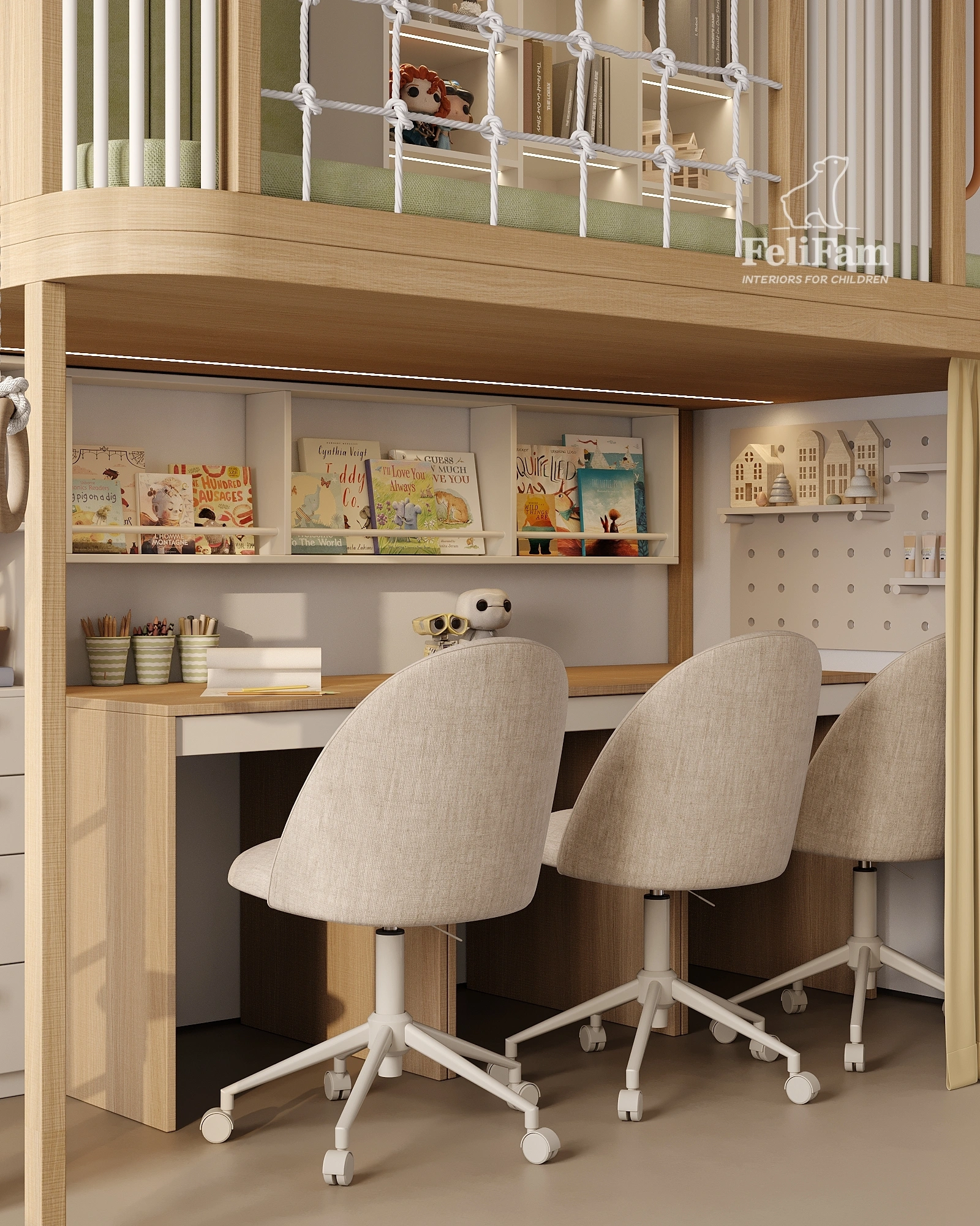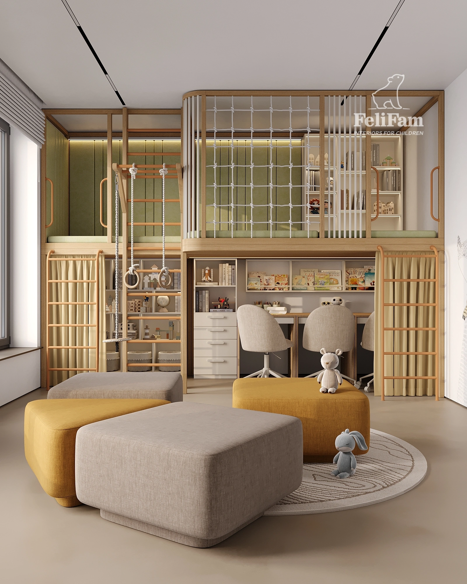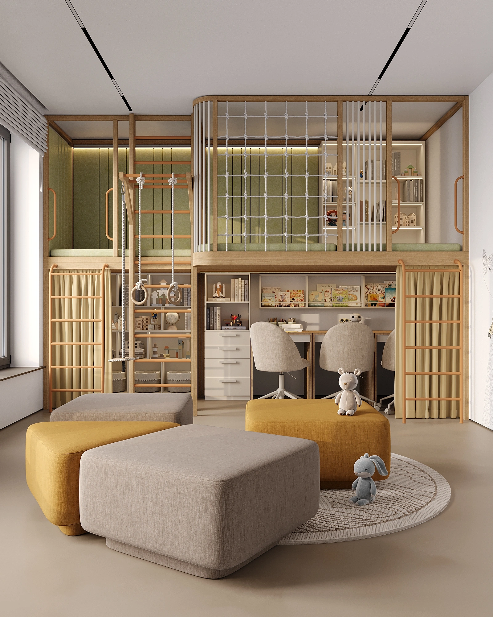 The room also includes a spacious shared study area with ergonomic seating, practical storage, and dedicated lighting for creative activities. This toddler playroom design maximizes every inch of space while balancing functionality with comfort, creating an inspiring interior tailored for growing children.