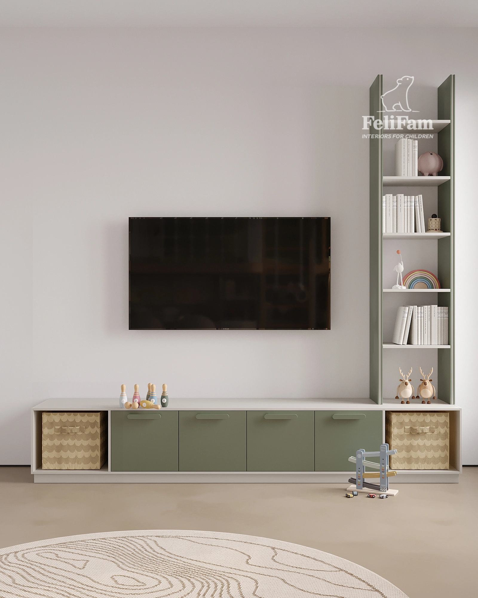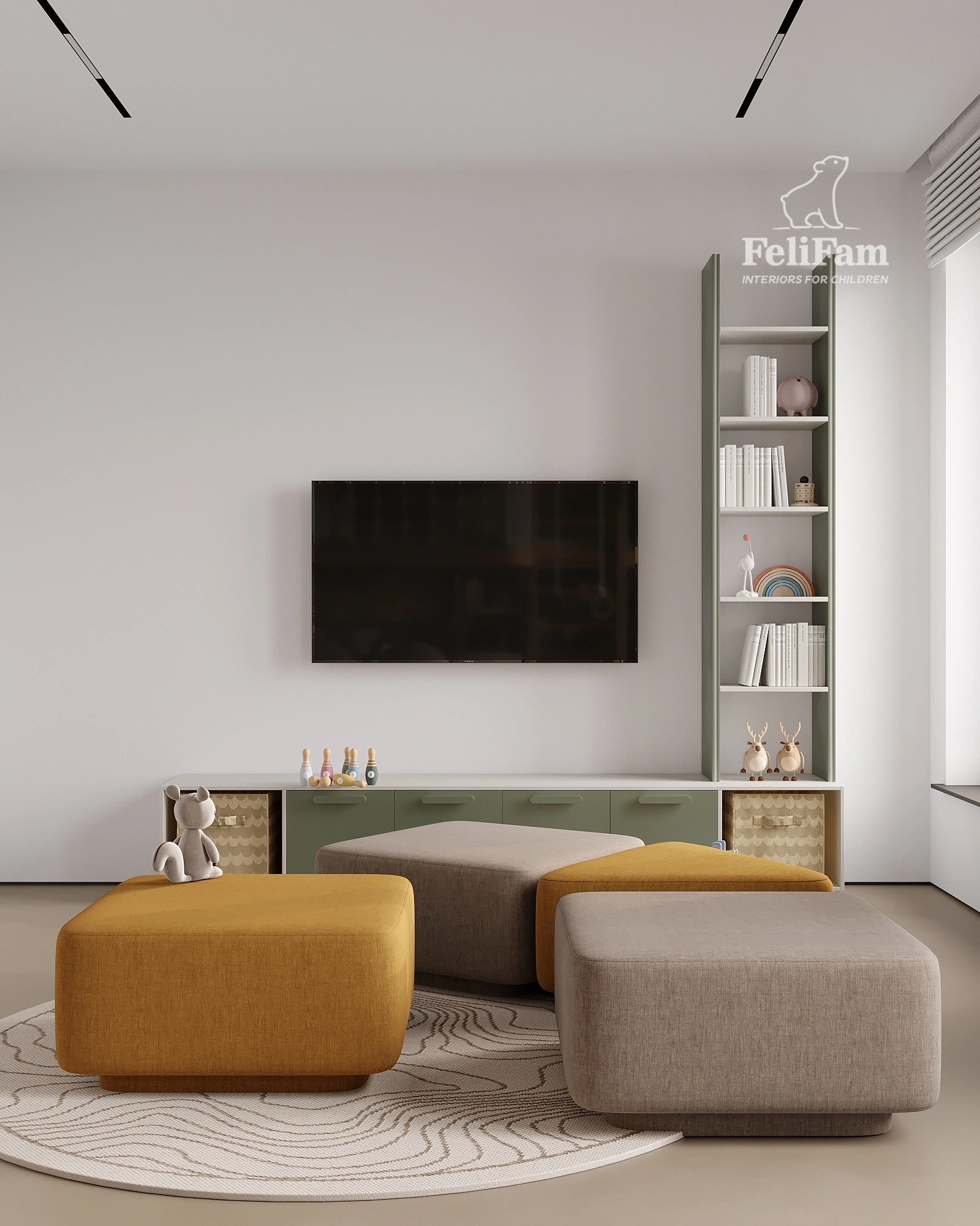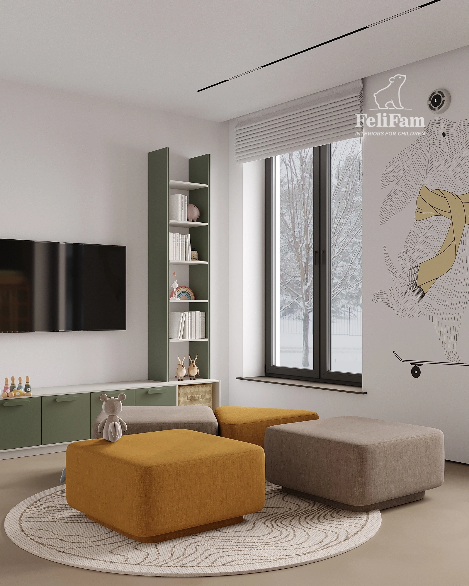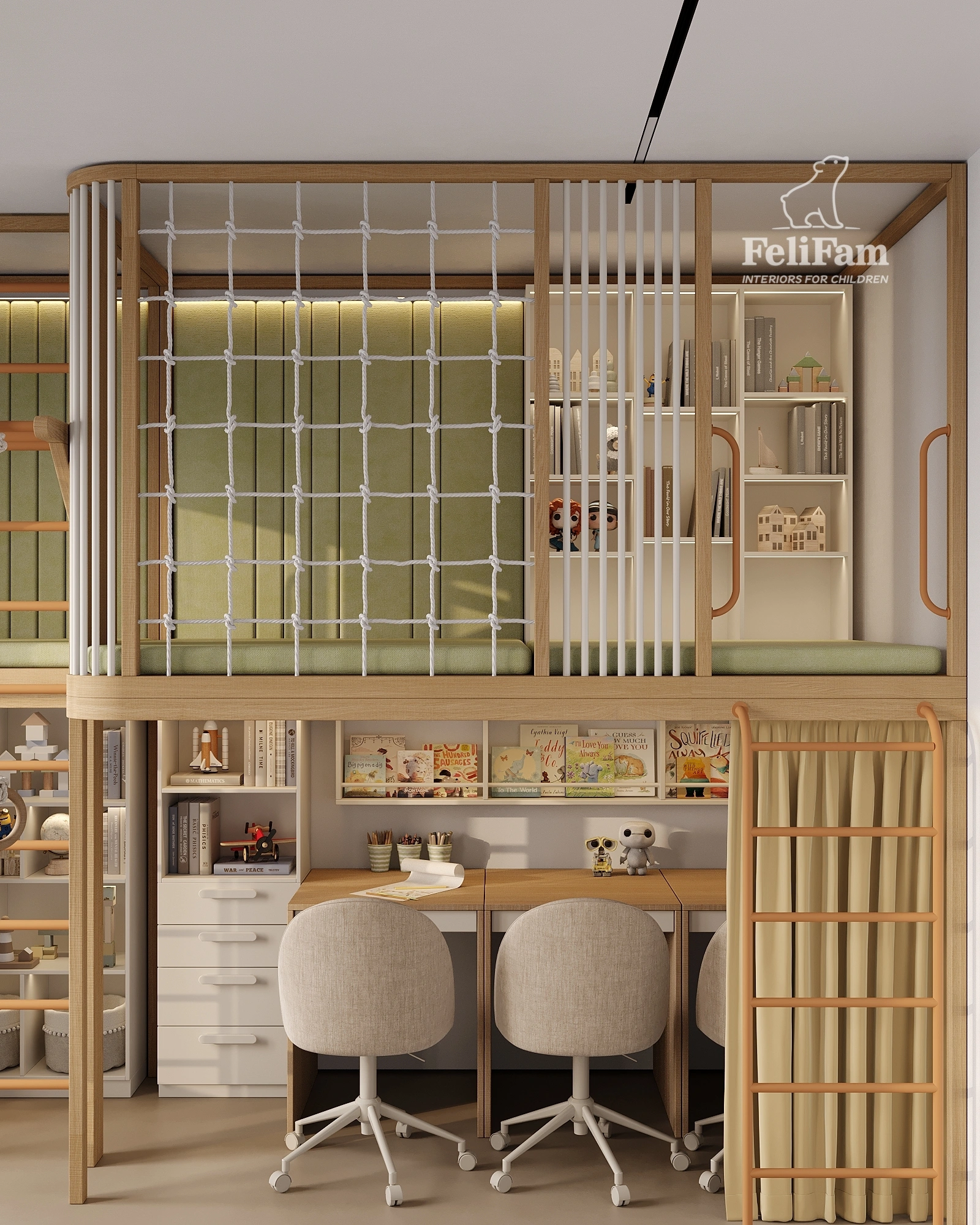 The room also includes a spacious shared study area with ergonomic seating, practical storage, and dedicated lighting for creative activities. This toddler playroom design maximizes every inch of space while balancing functionality with comfort, creating an inspiring interior tailored for growing children.