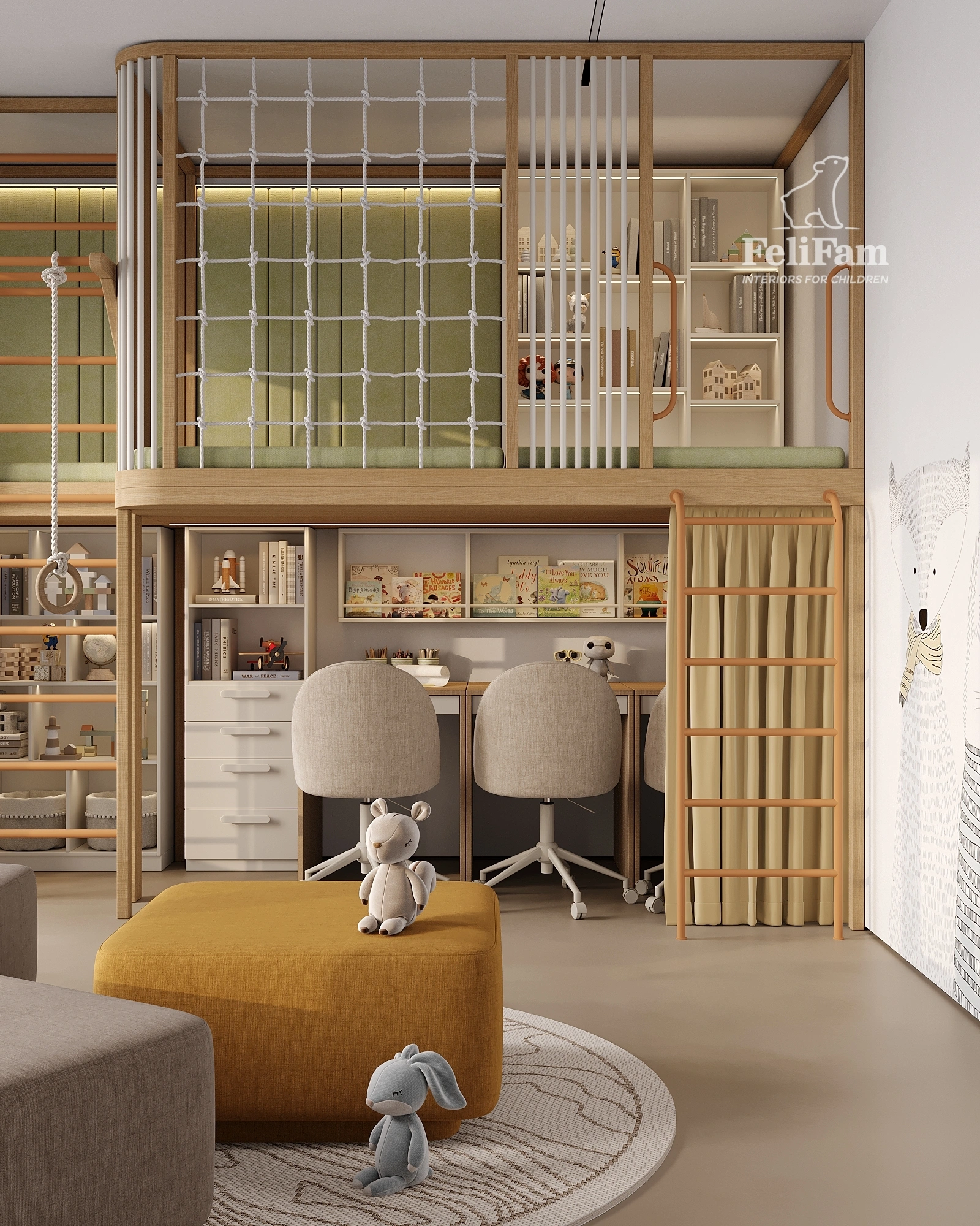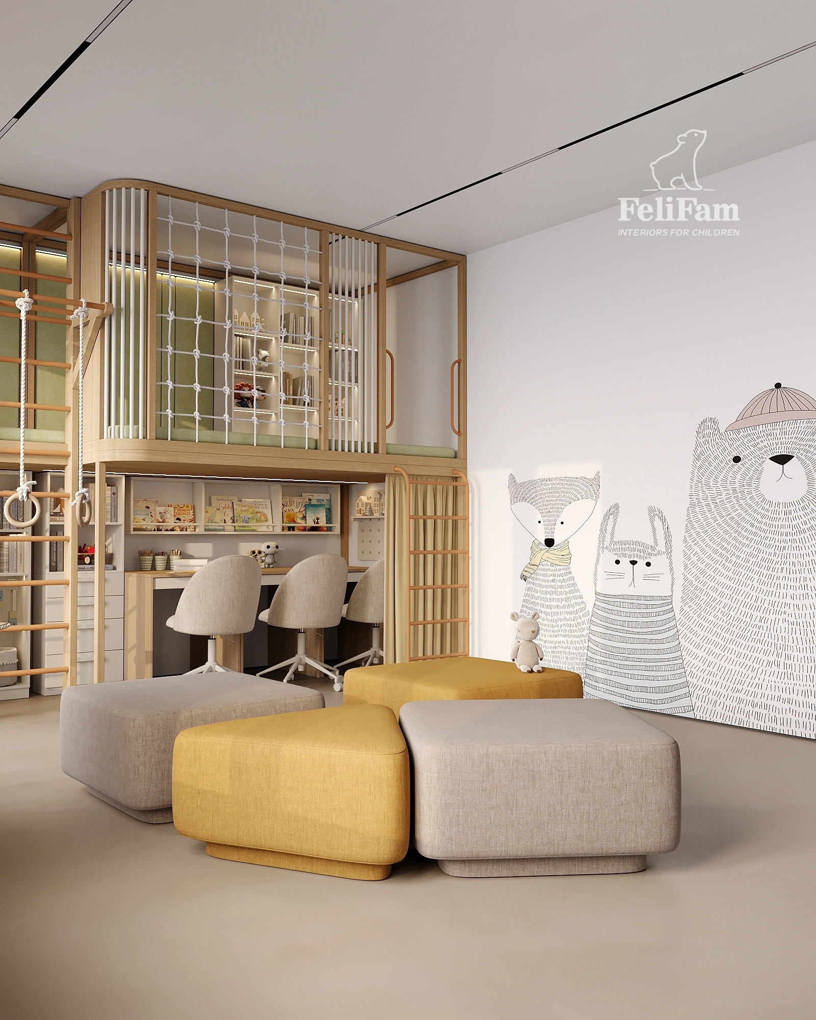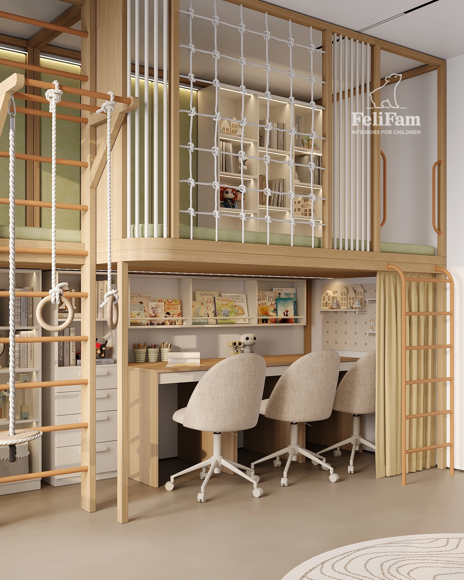 This thoughtfully designed toddler playroom combines play, learning, and rest in one beautifully organized space for three children. A custom multi-level structure features cozy sleeping areas, climbing elements, and interactive play zones that encourage creativity, movement, and independence. Soft natural tones, warm wood textures, and safe design solutions create a calm yet engaging environment.