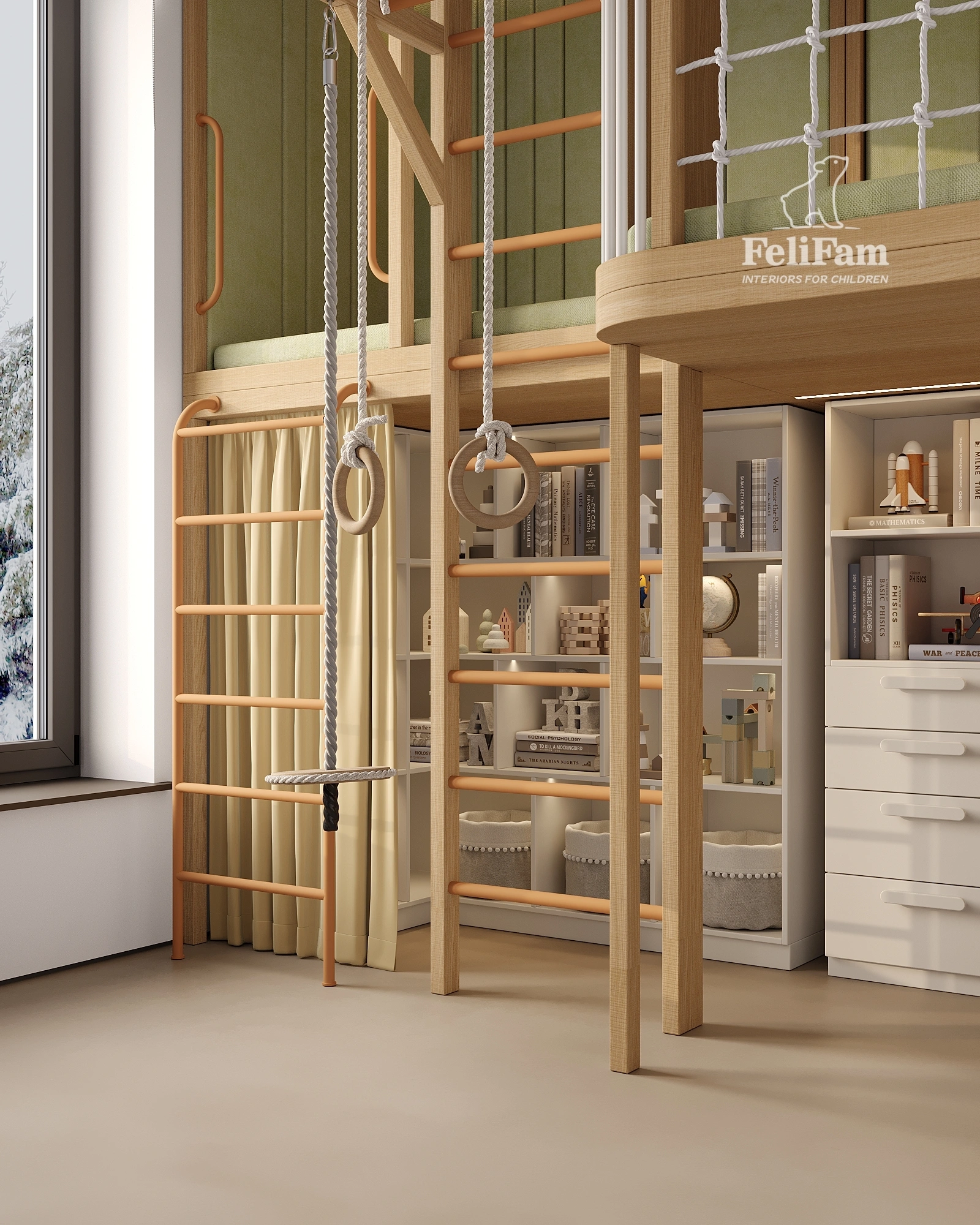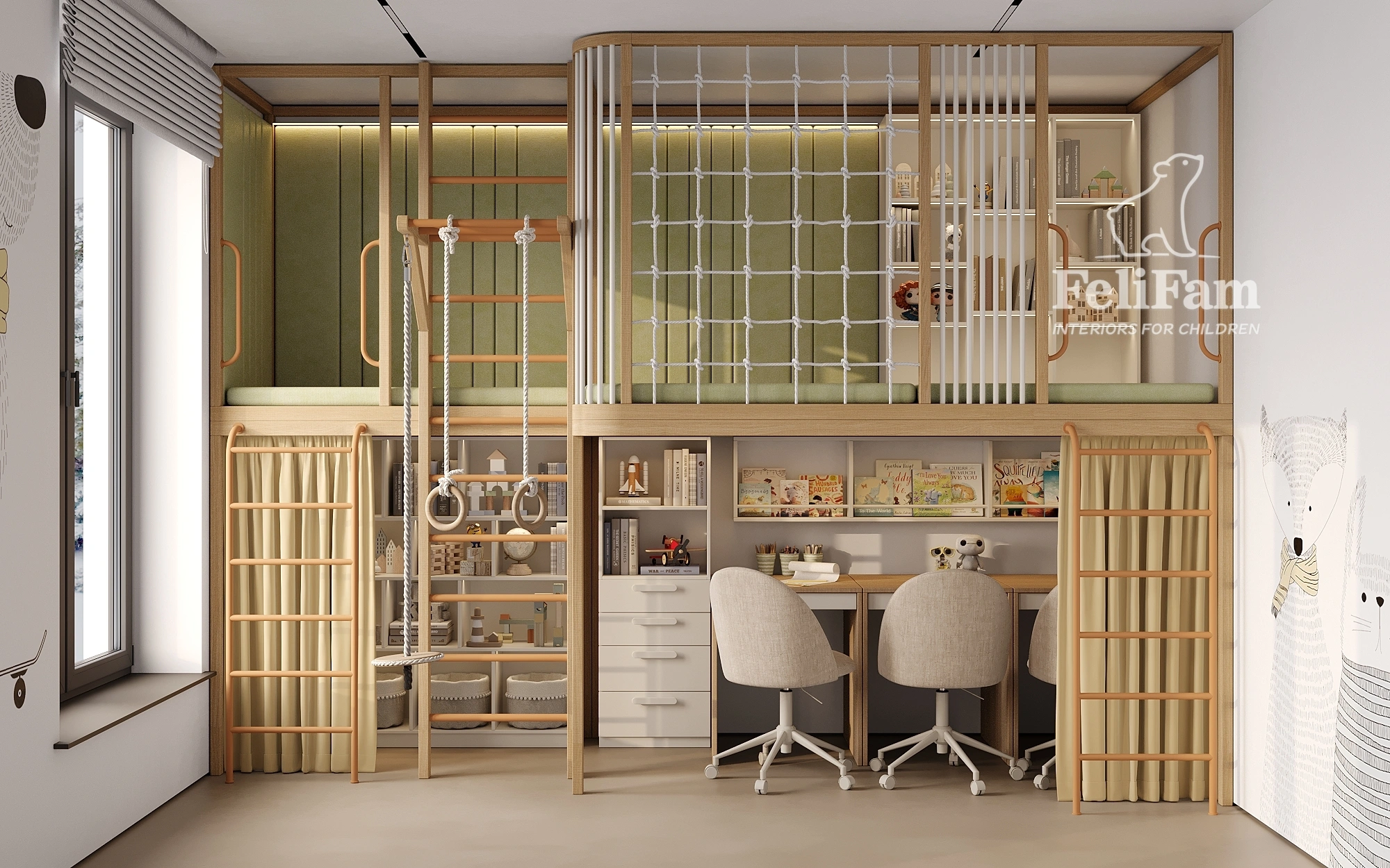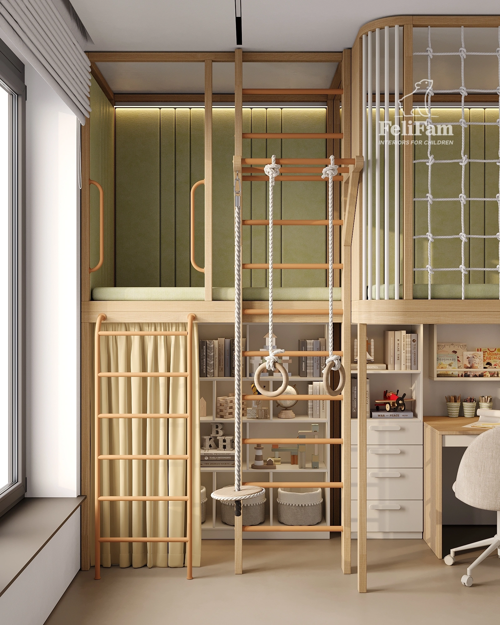 This thoughtfully designed toddler playroom combines play, learning, and rest in one beautifully organized space for three children. A custom multi-level structure features cozy sleeping areas, climbing elements, and interactive play zones that encourage creativity, movement, and independence. Soft natural tones, warm wood textures, and safe design solutions create a calm yet engaging environment.