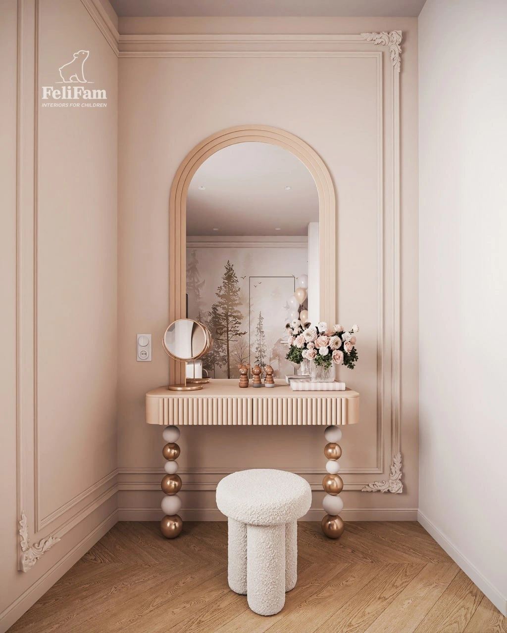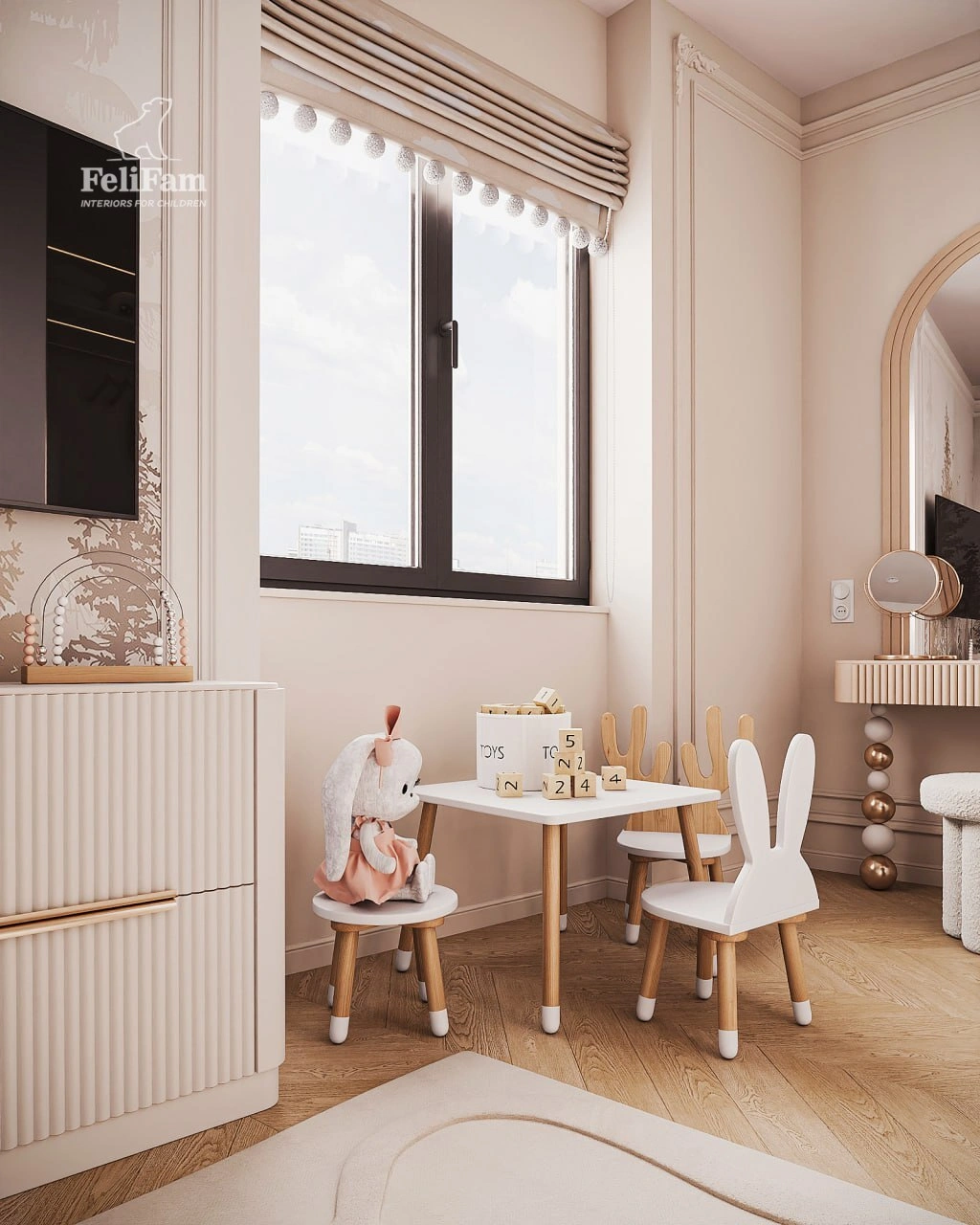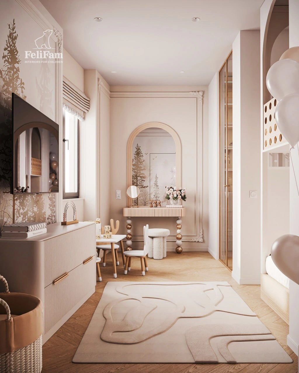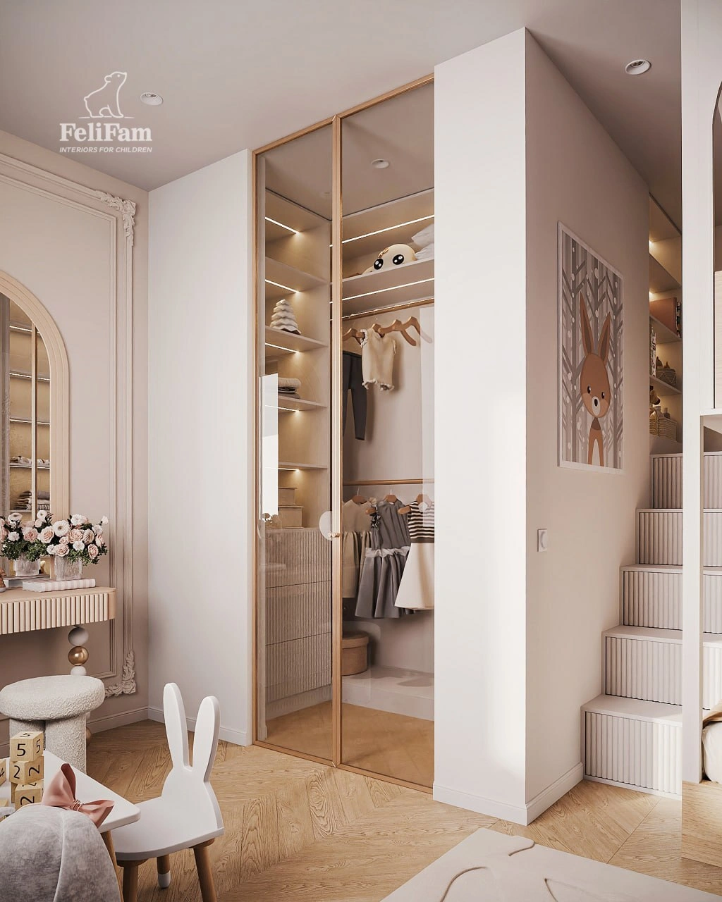 The space is divided into five distinct zones. The sleeping and relaxation area features a bunk bed and convenient bookshelves. Separately, there is a TV with a cabinet, a vanity table with a large mirror, a wardrobe with glass doors, and a dedicated area for play and creativity in the form of a separate table. All of this creates a harmonious space where every item has its place.