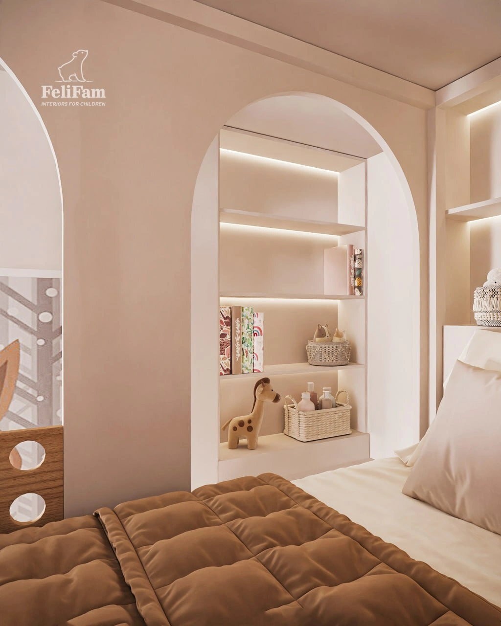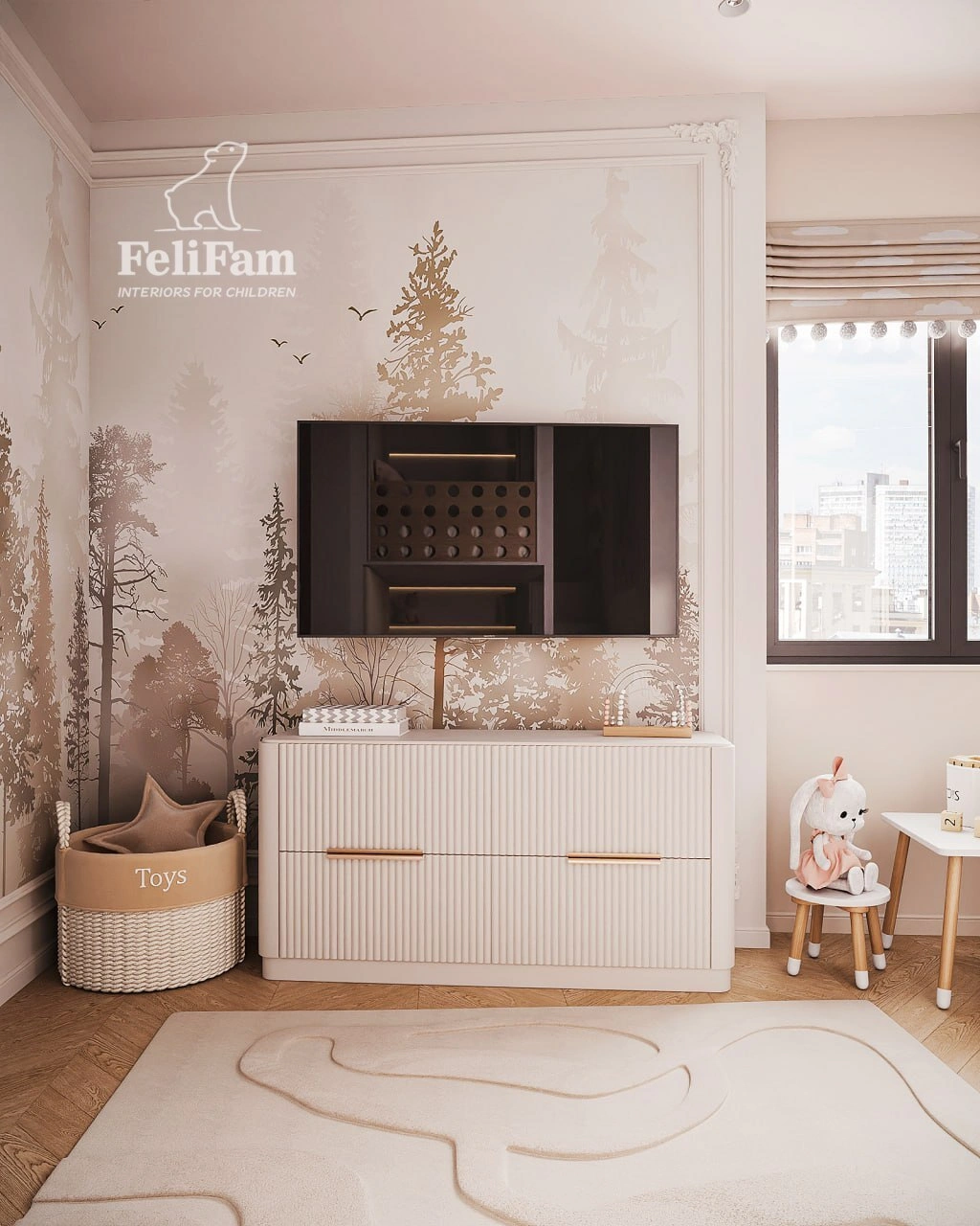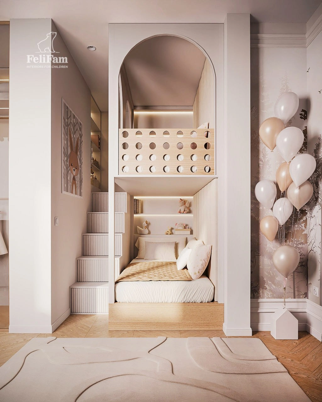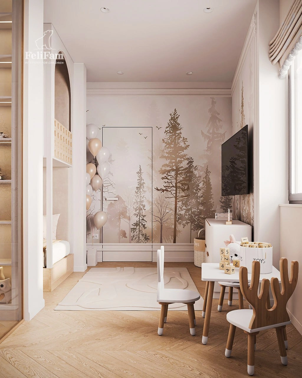 A beautiful room for two girls aged 2 and 8, where every square meter is carefully thought out. The 15 m² space has been skillfully zoned to create a comfortable, functional, and at the same time cozy environment for living, learning, and relaxing. Despite its modest size, the room feels light and not overloaded.