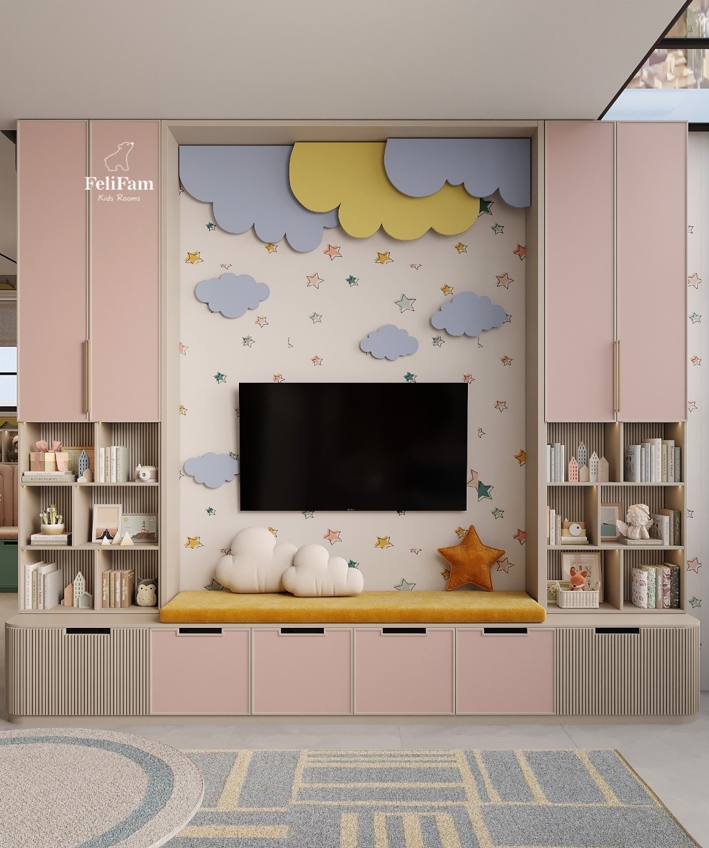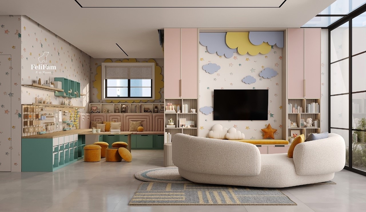 The room is styled in a modern design with bright details that stimulate imagination without overwhelming the space. A cozy sofa in front of the TV creates a corner for relaxation and quiet activities, while modern technologies are integrated to both entertain and develop.