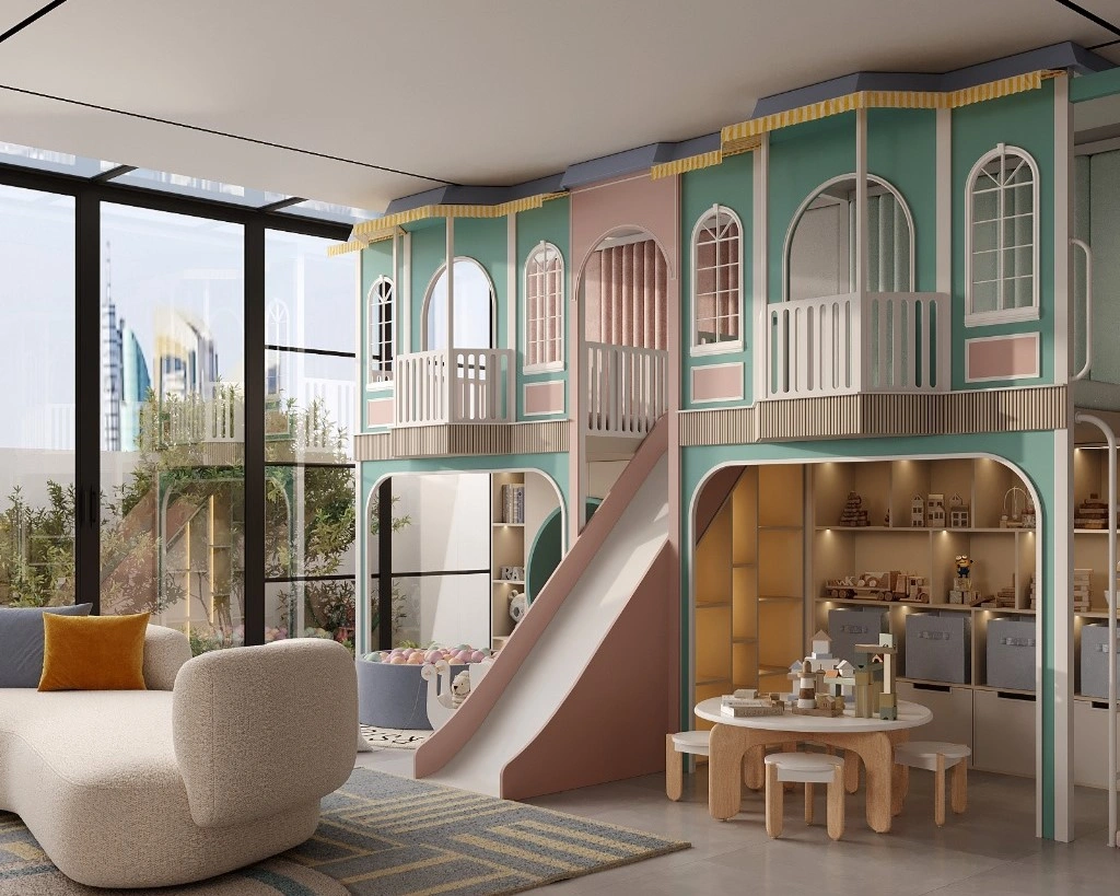 The central element of the interior is a two-level play structure with a slide, which defines the architecture of the room and creates a sense of adventure. The lower level integrates areas for imaginative play and creative activities, while the upper level adds dynamism and encourages physical activity.