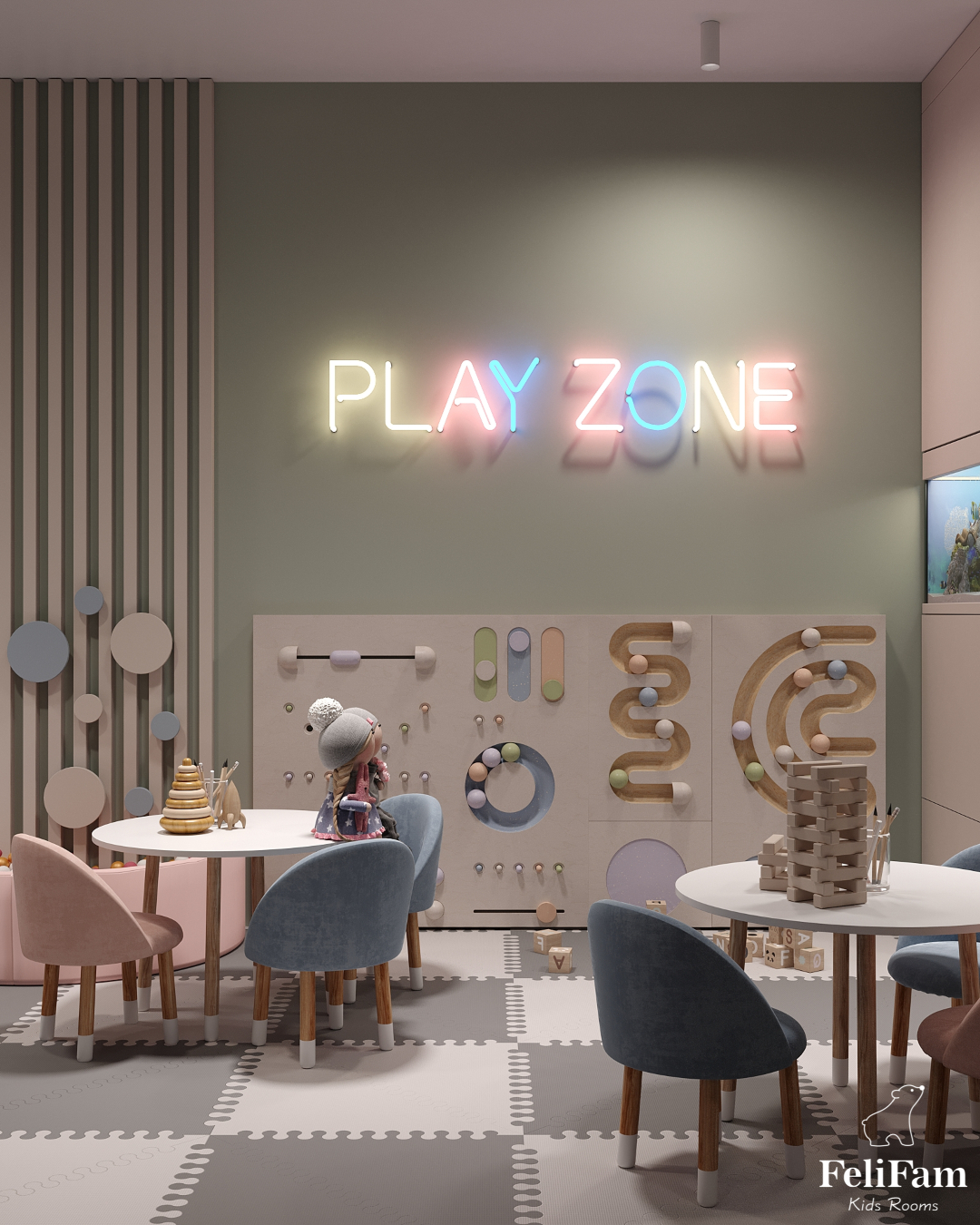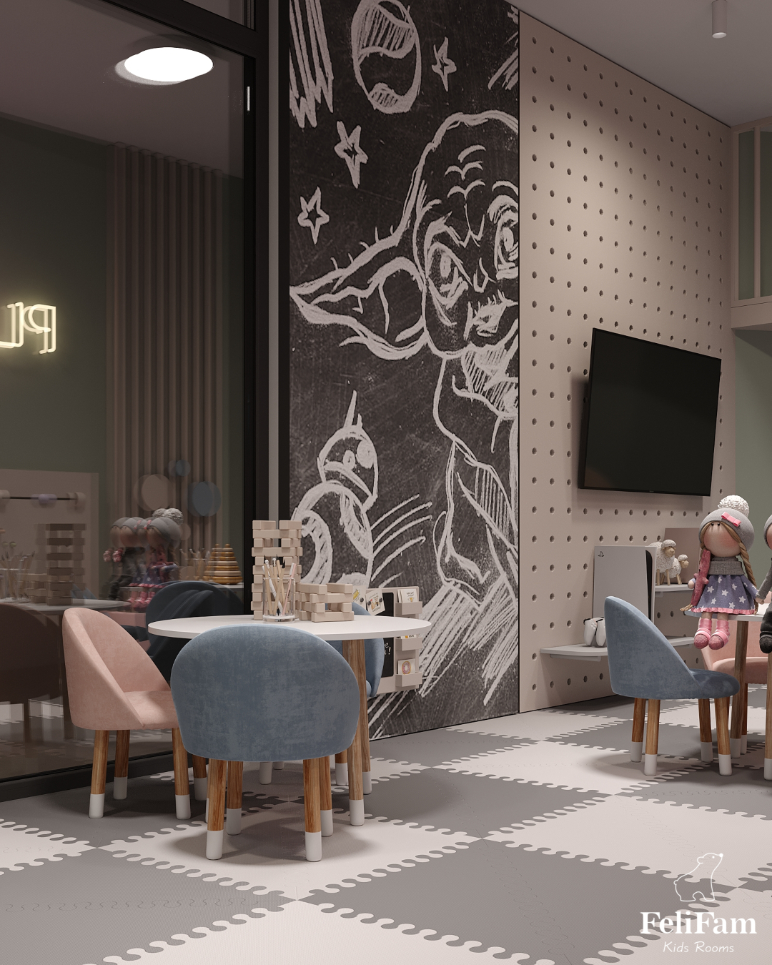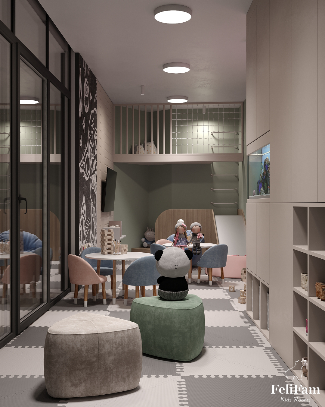 Highlights include a second-floor play area, a slide into a ball pit, a busy board, a creativity board, a TV corner, and tables with comfortable chairs.