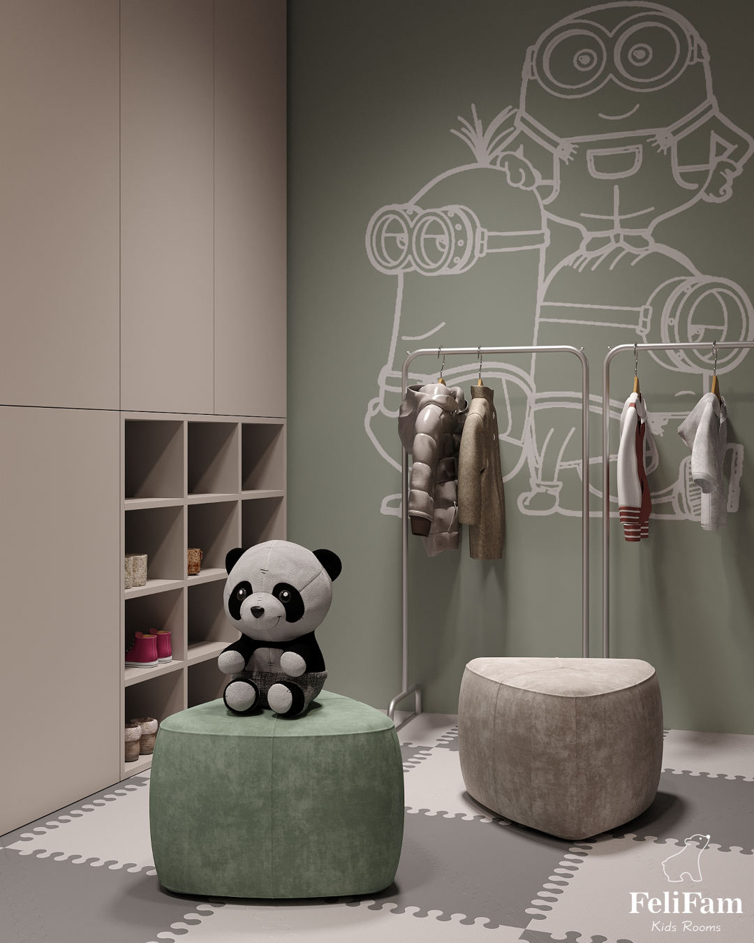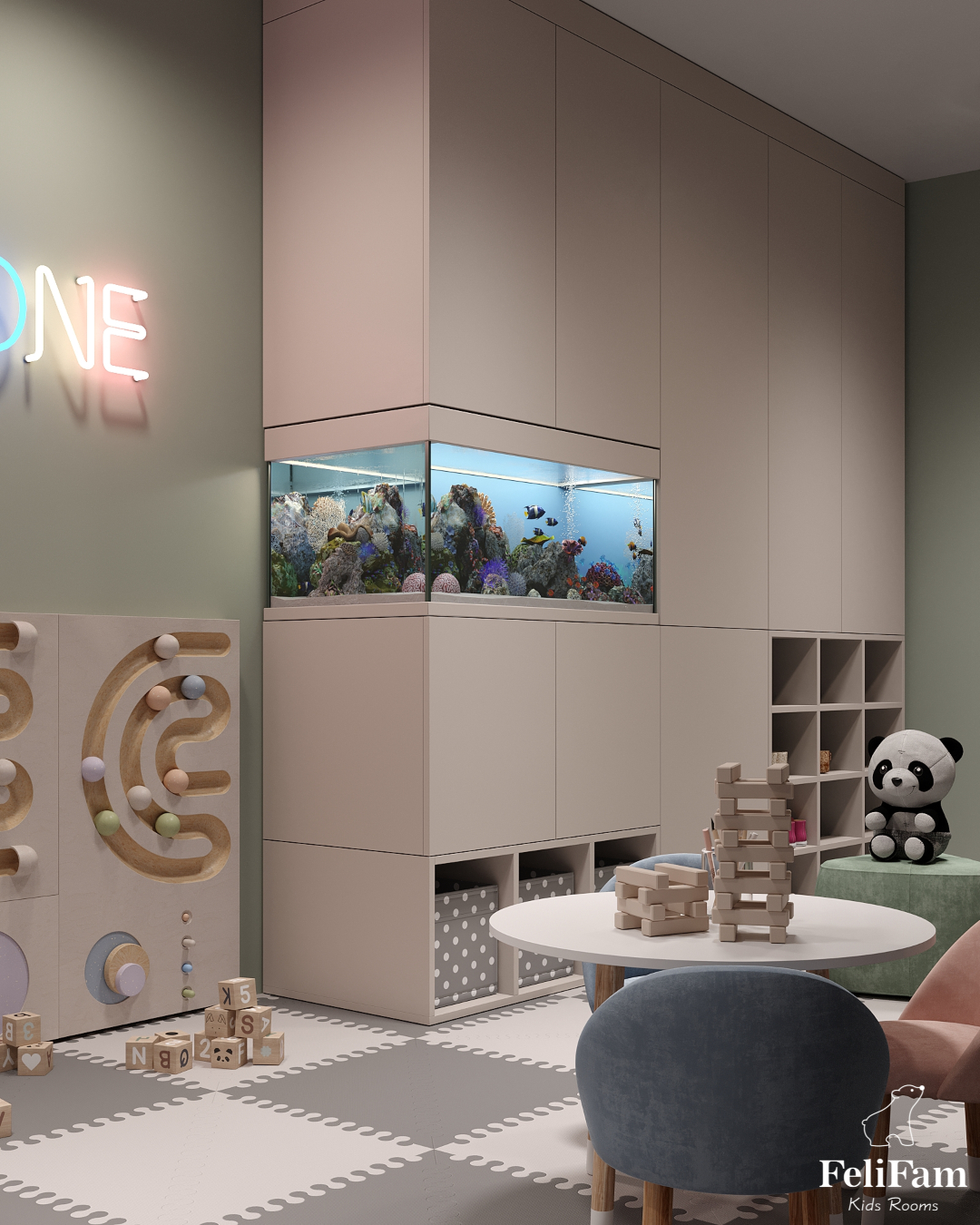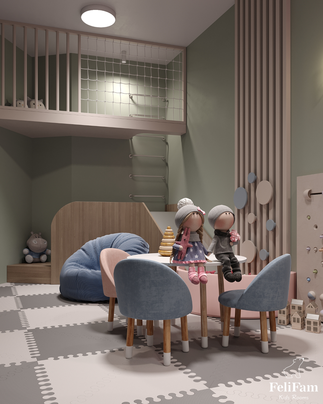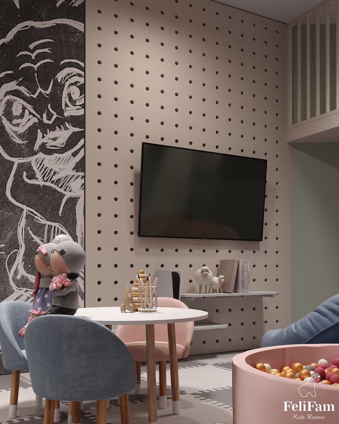 Highlights include a second-floor play area, a slide into a ball pit, a busy board, a creativity board, a TV corner, and tables with comfortable chairs.
