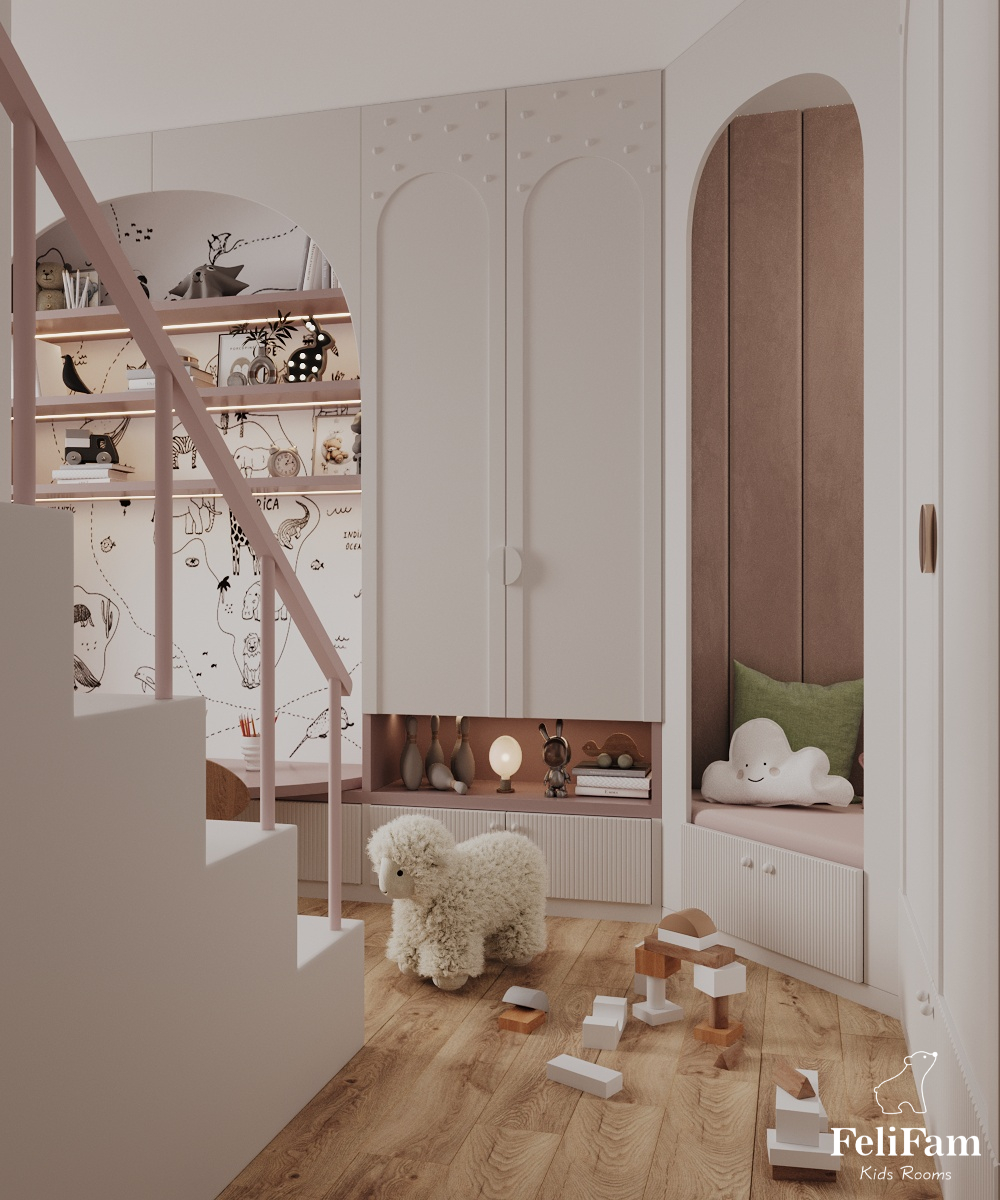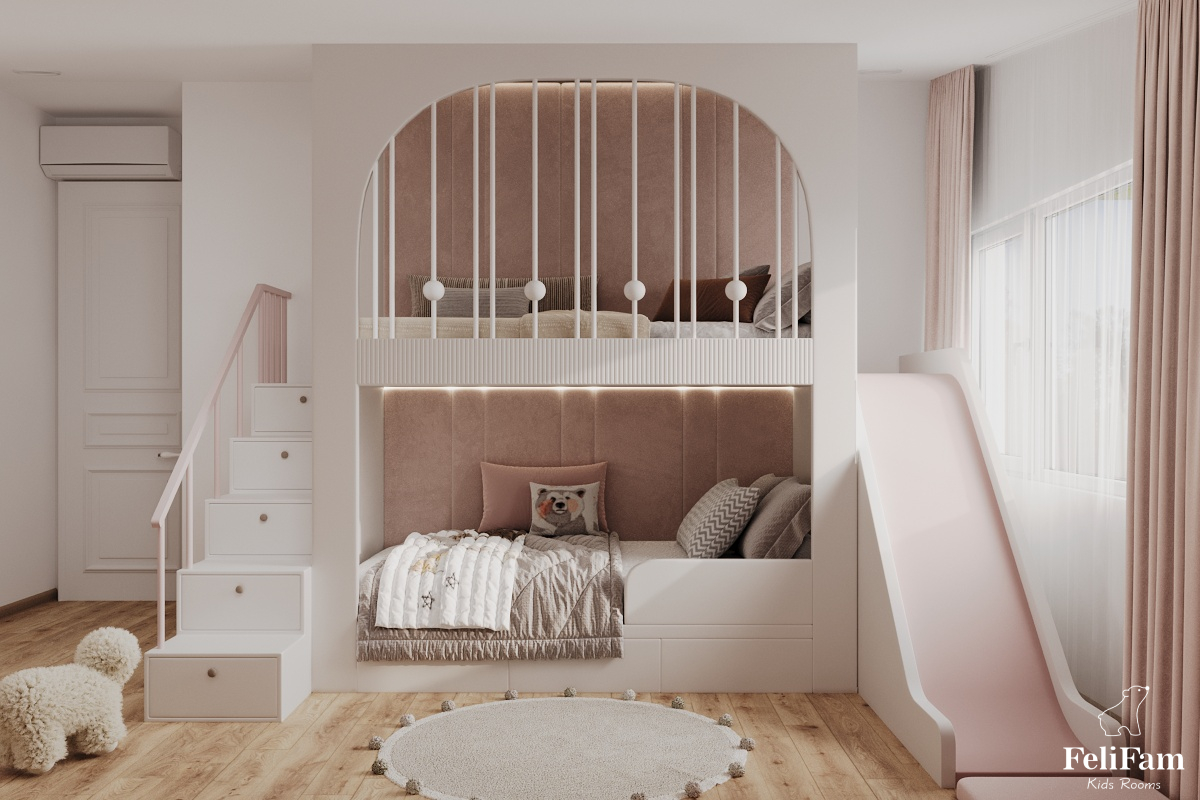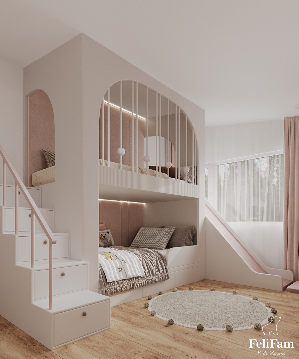 The room area is 16m2, so we successfully placed a bunk bed with a play area on top, a large number of wardrobes for storing clothes, an area for games, development and relaxation. The space is completely safe for the child, we added soft panels at the bottom of the slide and on the top floor of the structure.