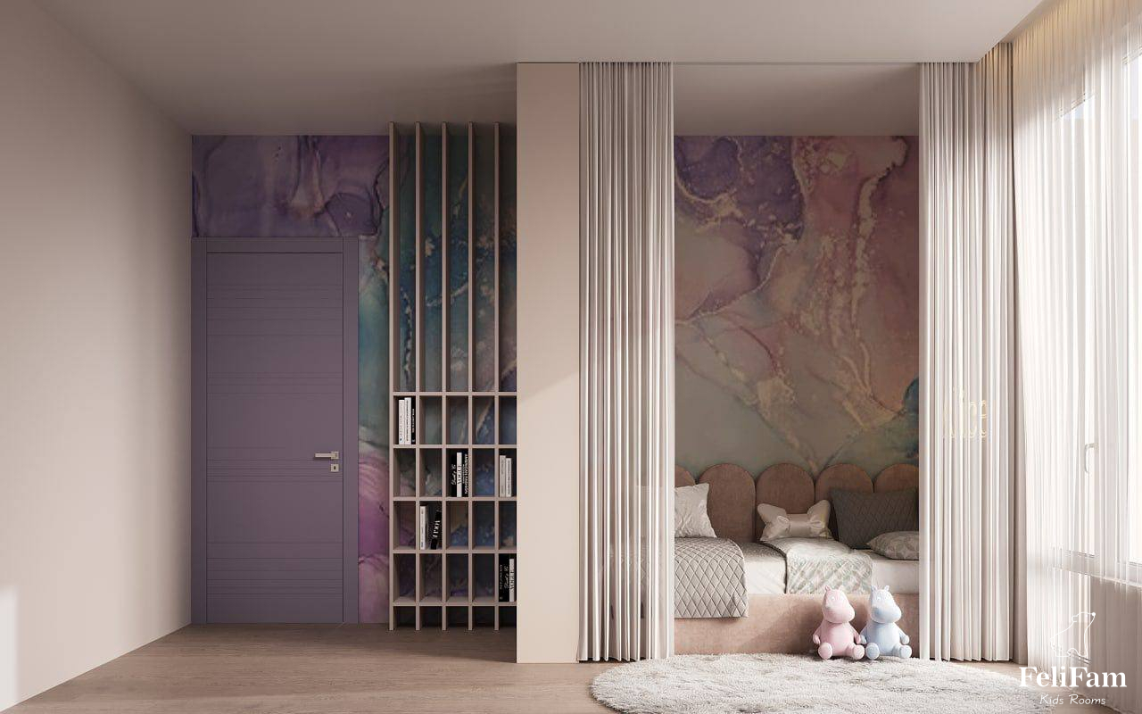 It is dominated by delicate, pastel colors, and such interesting photo wallpapers were used as an accent.