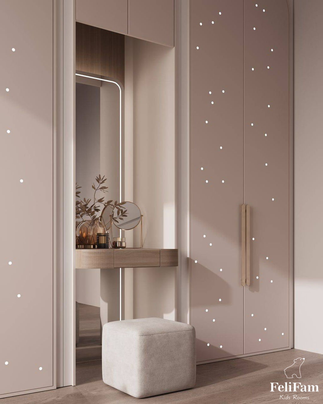 The room strikes a delicate balance between a child’s room and a space for a young girl.