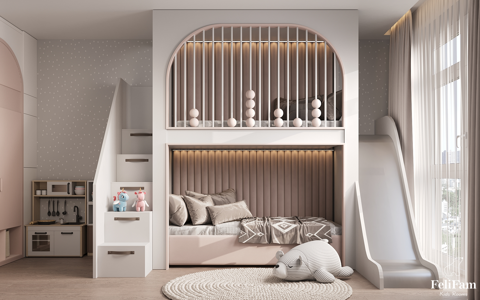 The main character of this space is a luxurious bed with a slide.