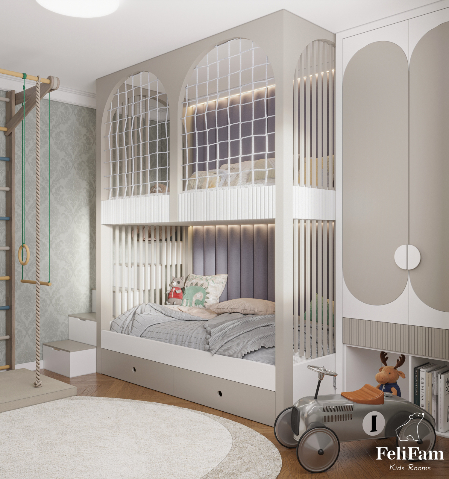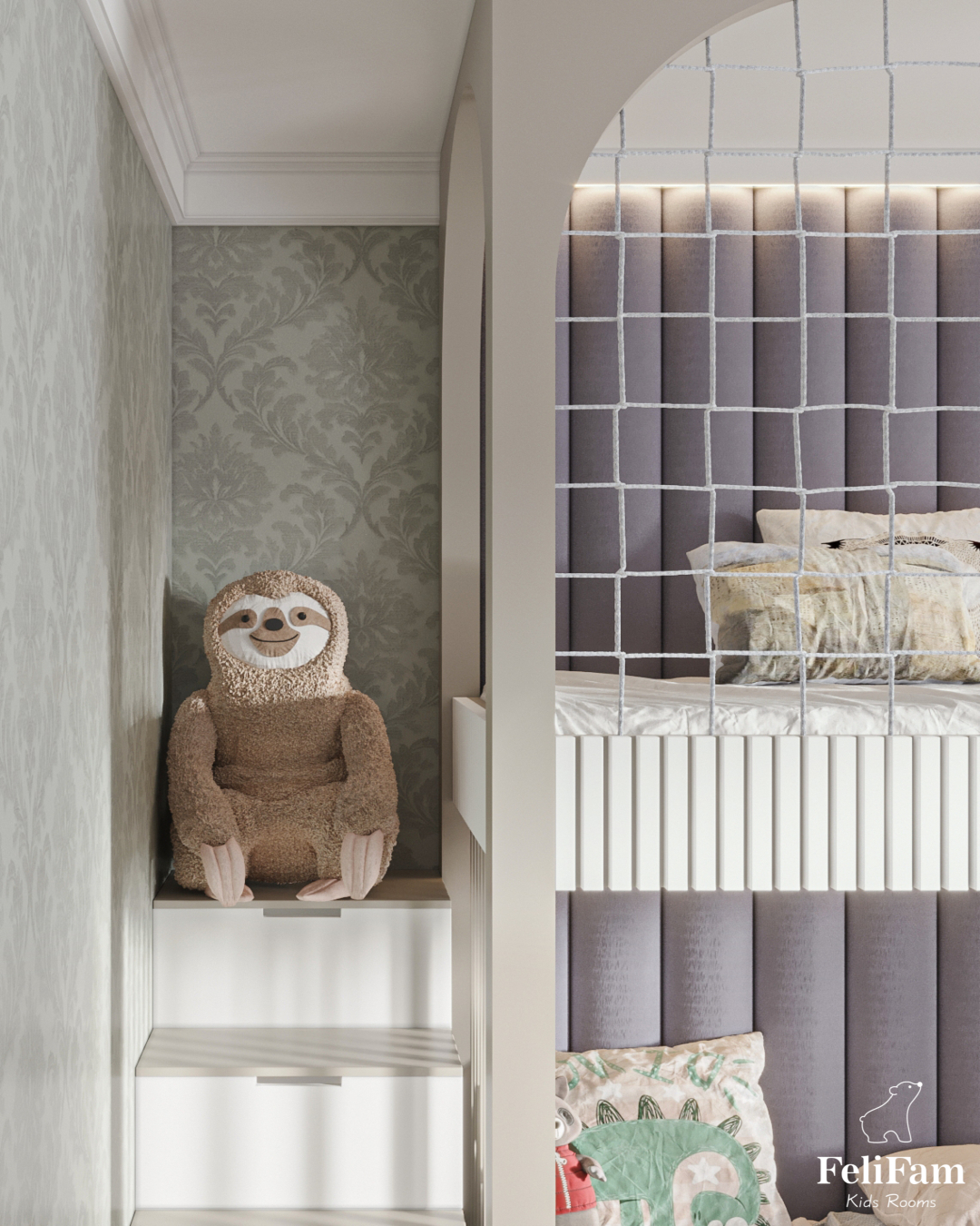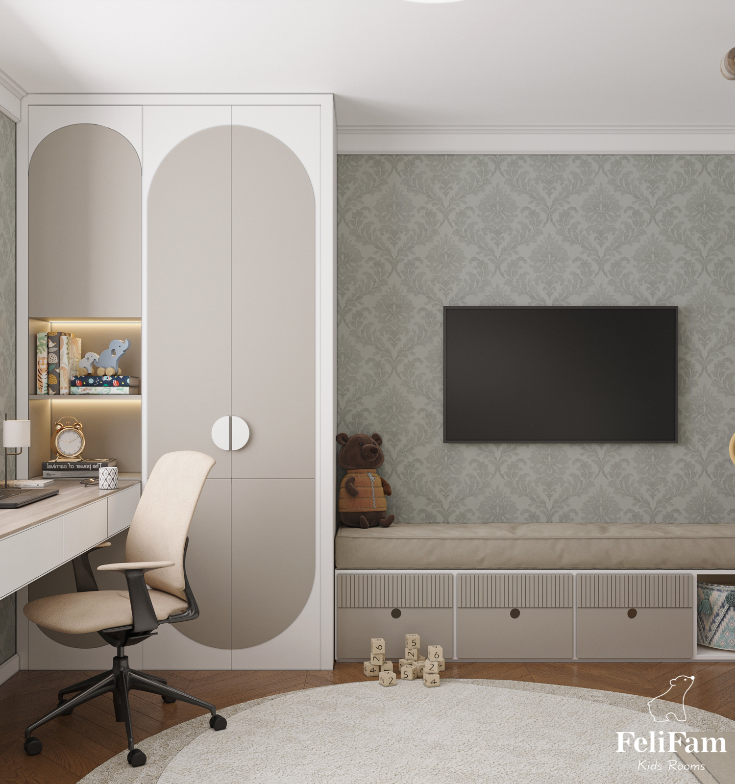 The design of the furniture was developed in the existing renovation, the room turned out to be quite functional, comfortable and stylish under the existing wallpaper color.
