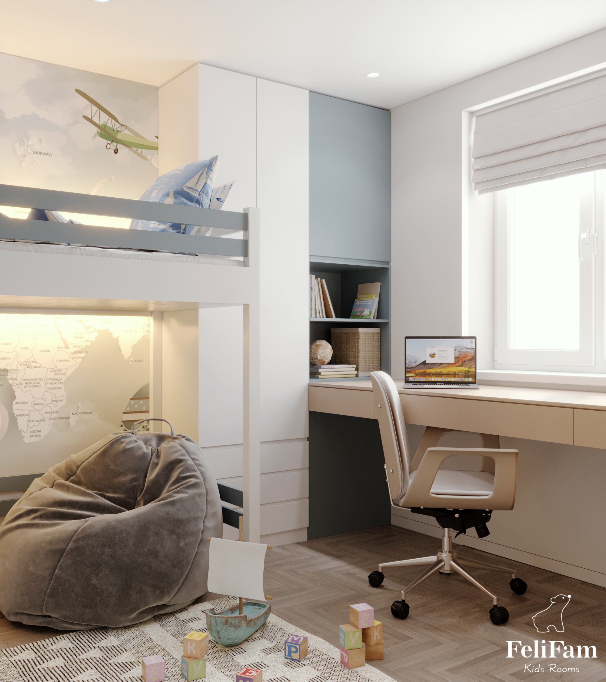 Do you want to create something similar? Then we advise you to be especially careful when choosing furniture for children’s rooms, because it should “grow” and transform with your child, be as functional and high-quality as possible.