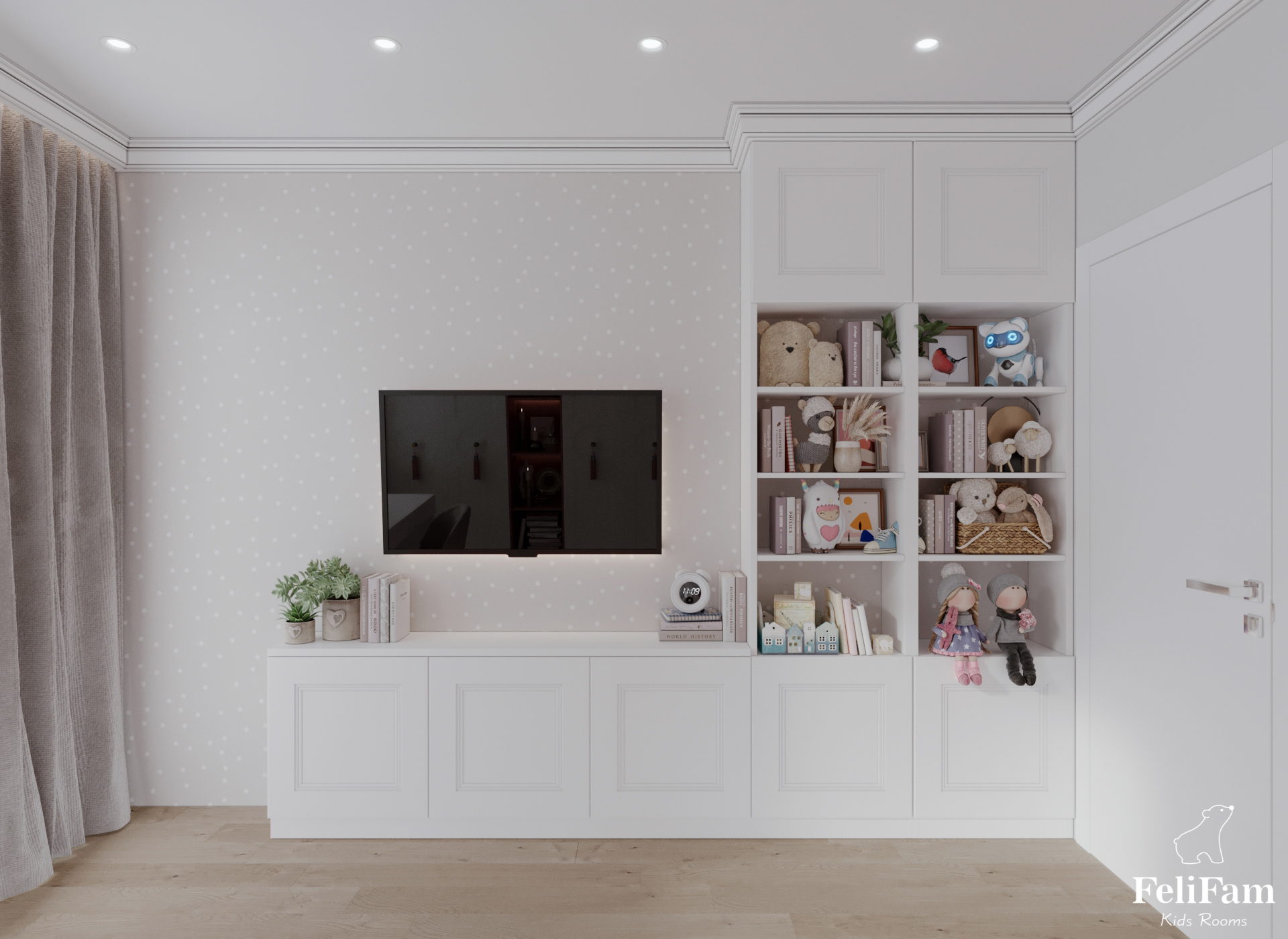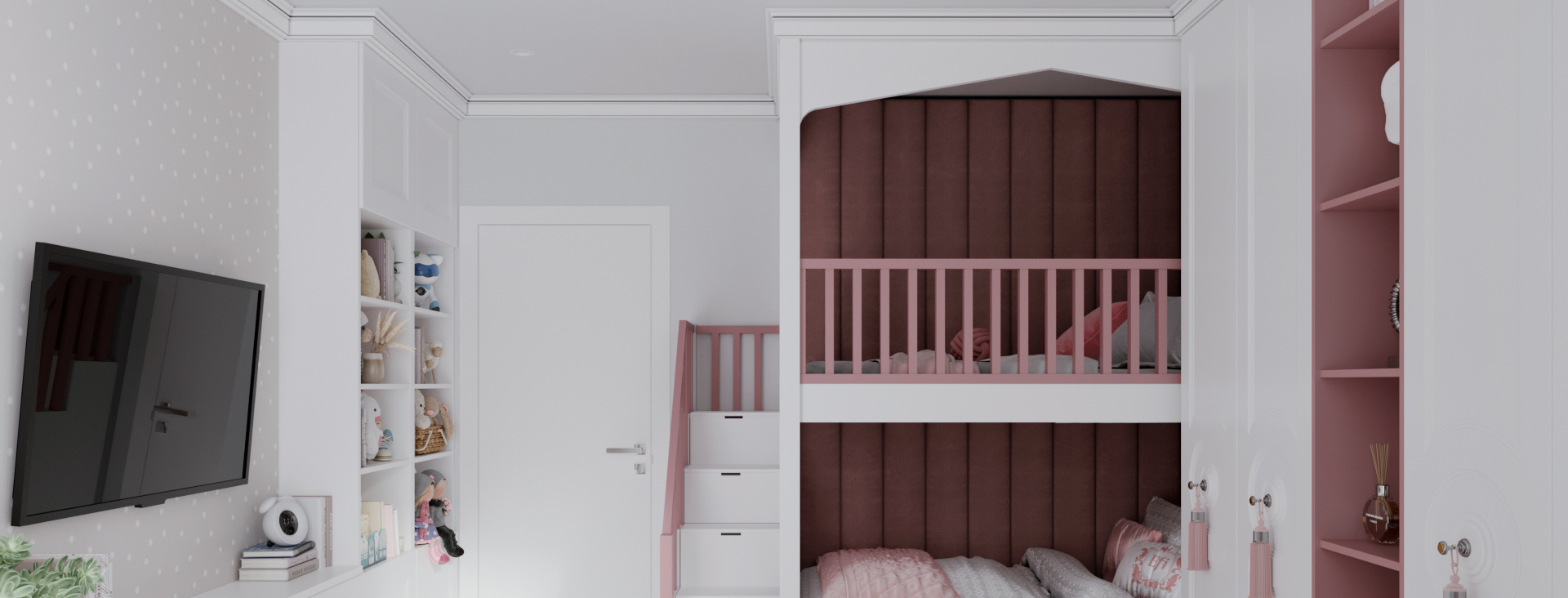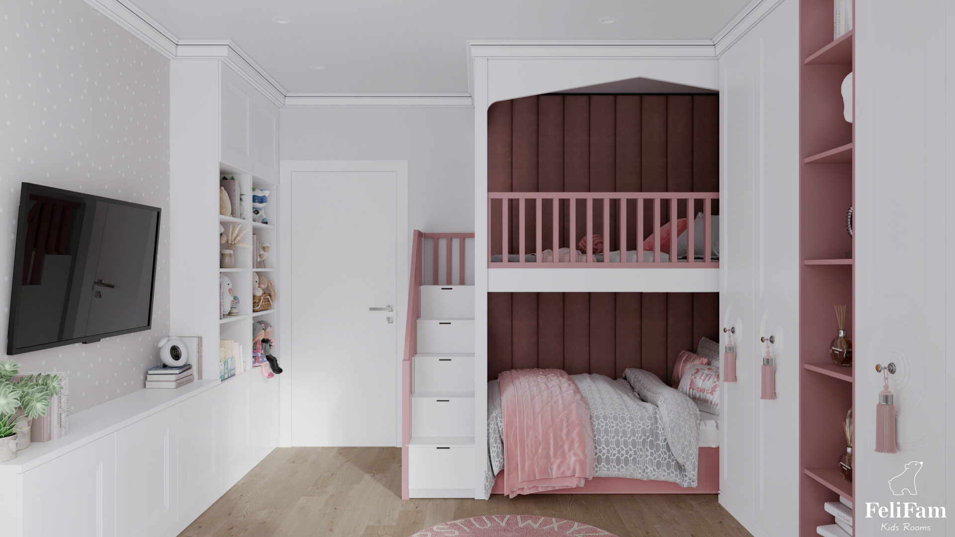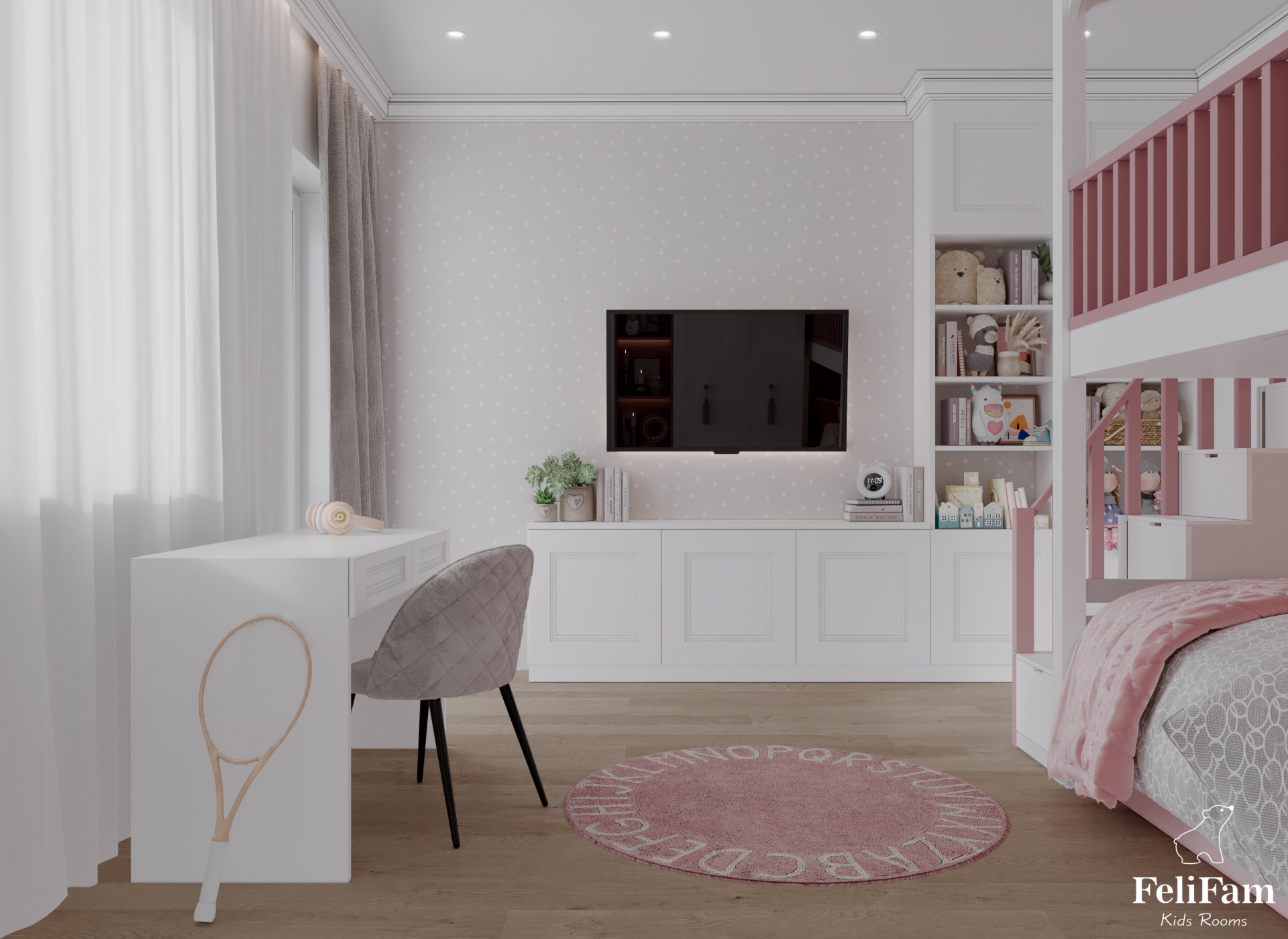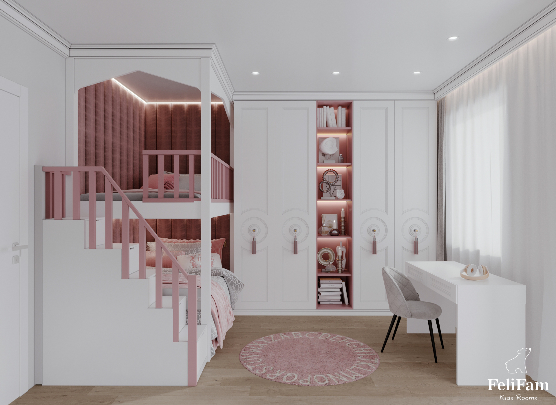 The children’s bedroom is designed in a modern style with bright pink details that all girls love so much.