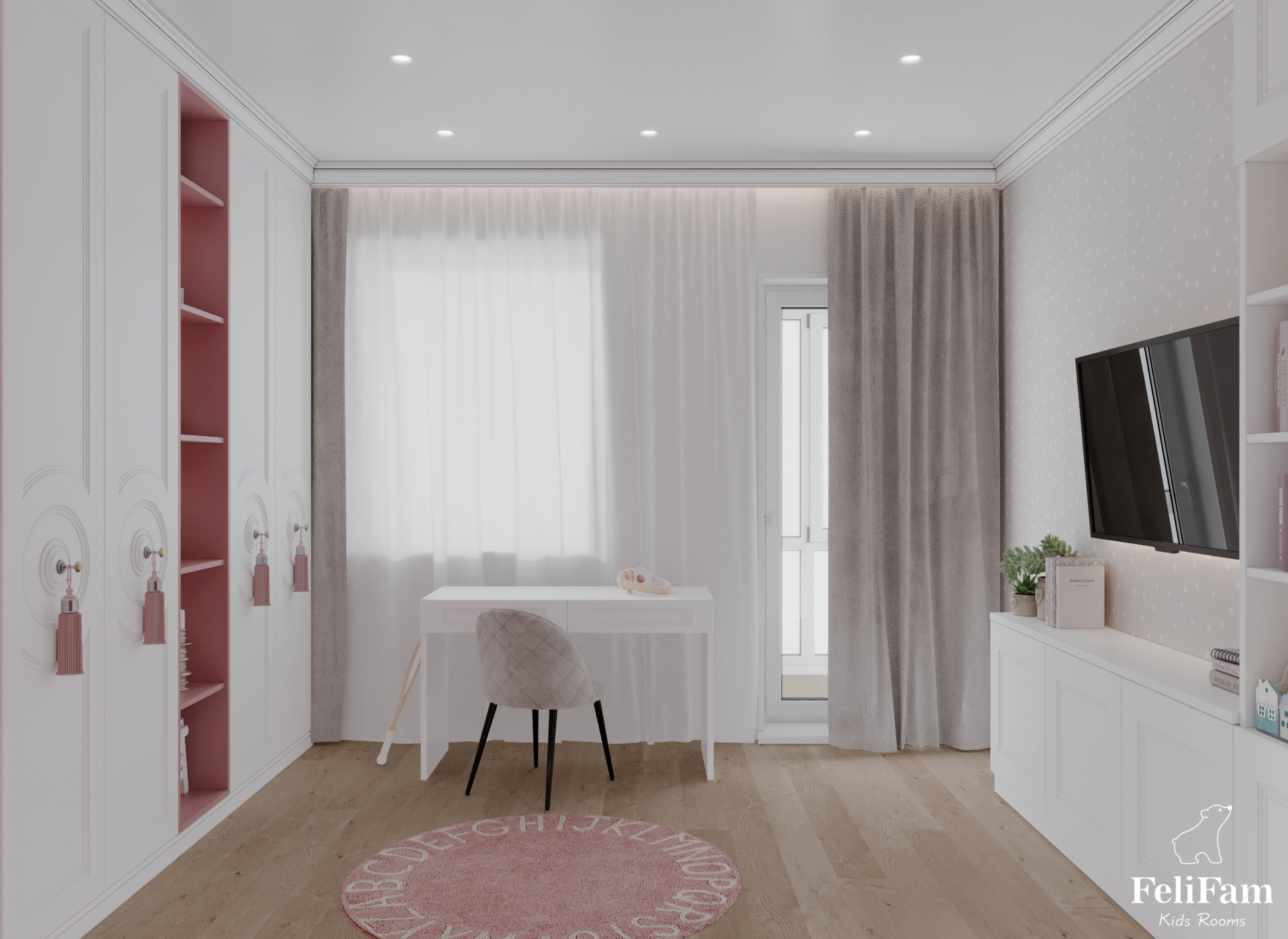A little lady will feel comfortable studying, playing and relaxing in this bedroom.