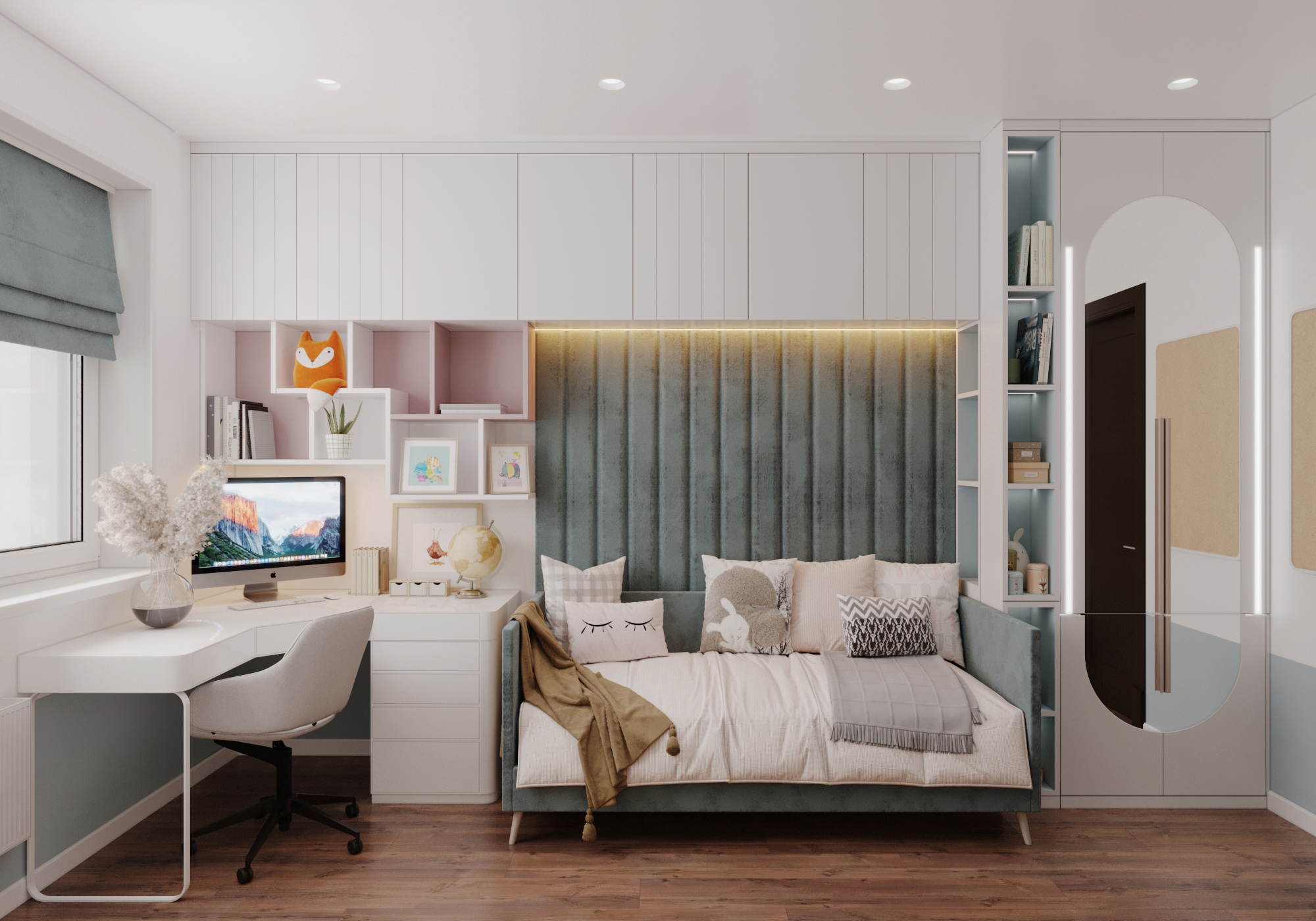 The room has plenty of storage space and a comfortable work area.
