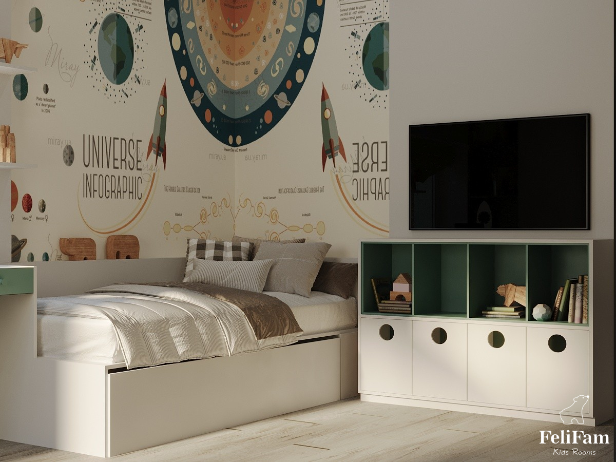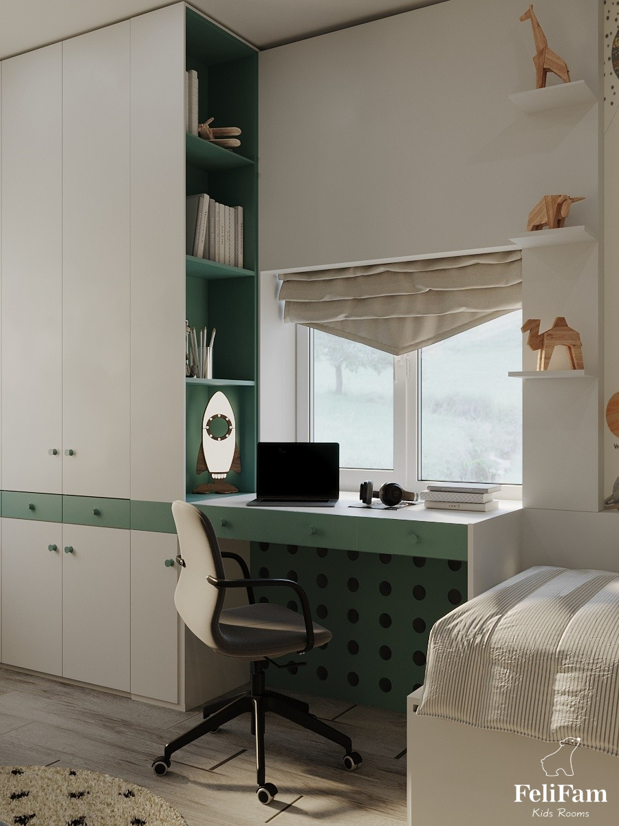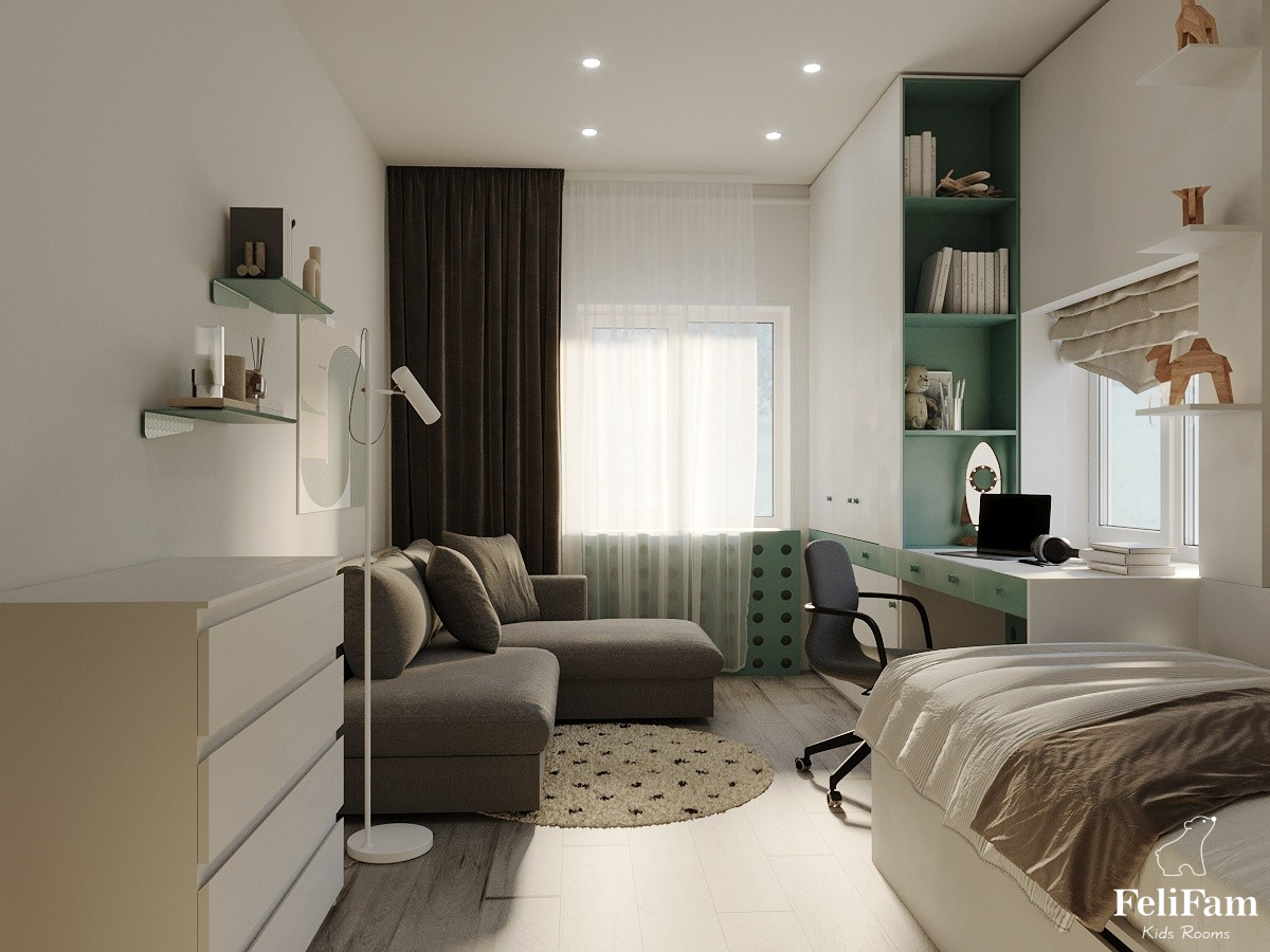A room in a country house for a boy with an extra bed for his mother. In a small space, we have placed a TV area, a study area, a large wardrobe and an additional cabinet for things.