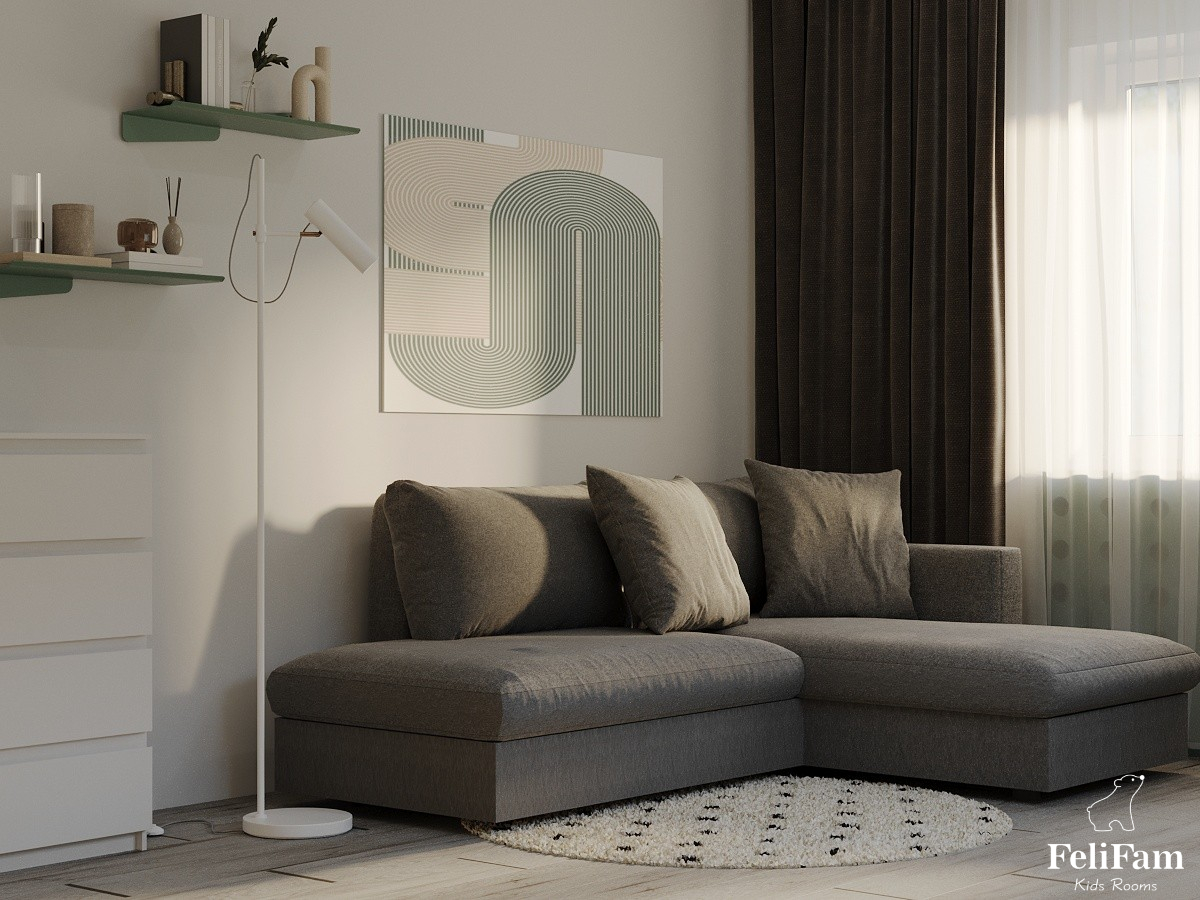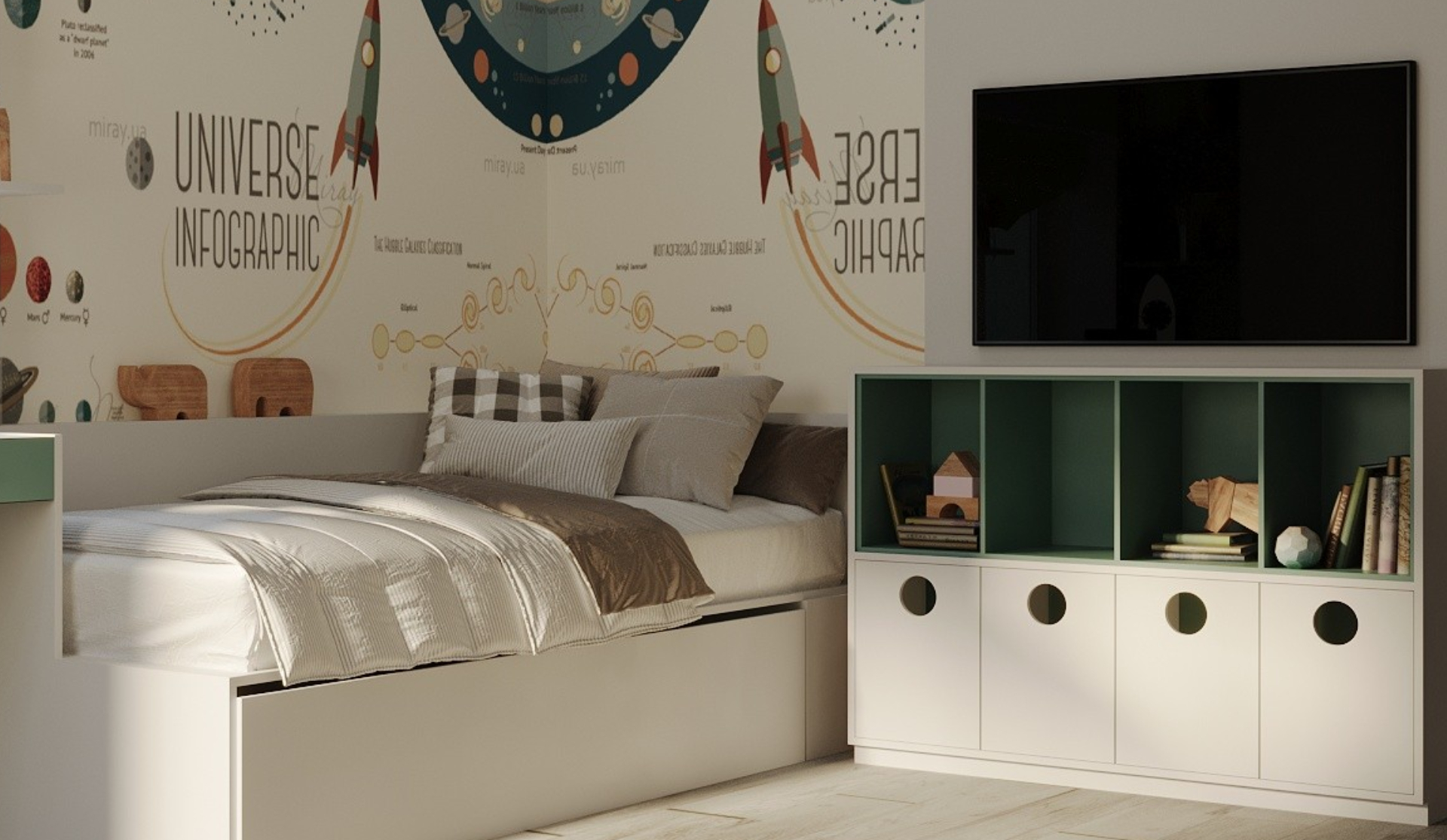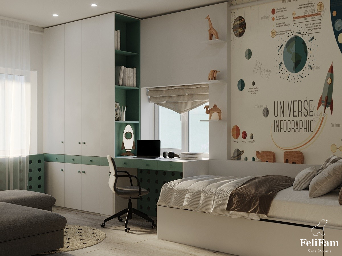 A room in a country house for a boy with an extra bed for his mother. In a small space, we have placed a TV area, a study area, a large wardrobe and an additional cabinet for things.