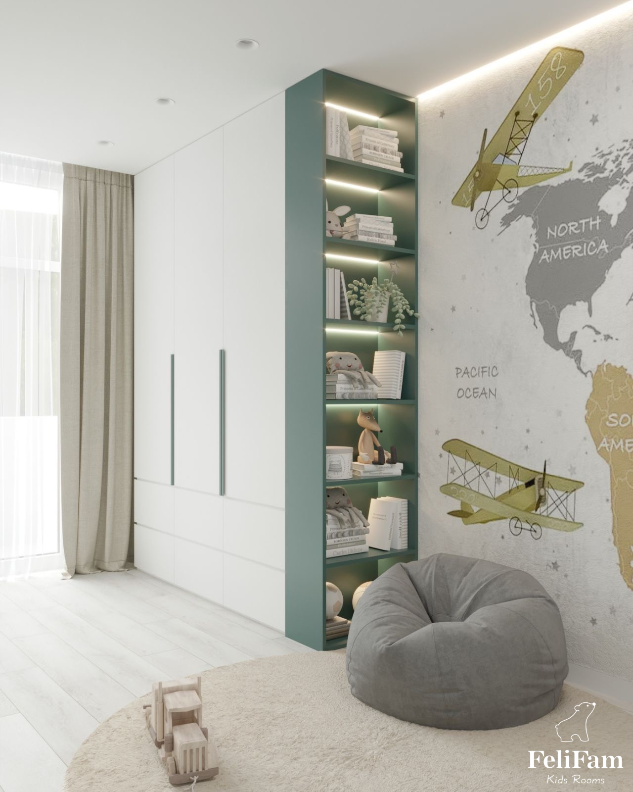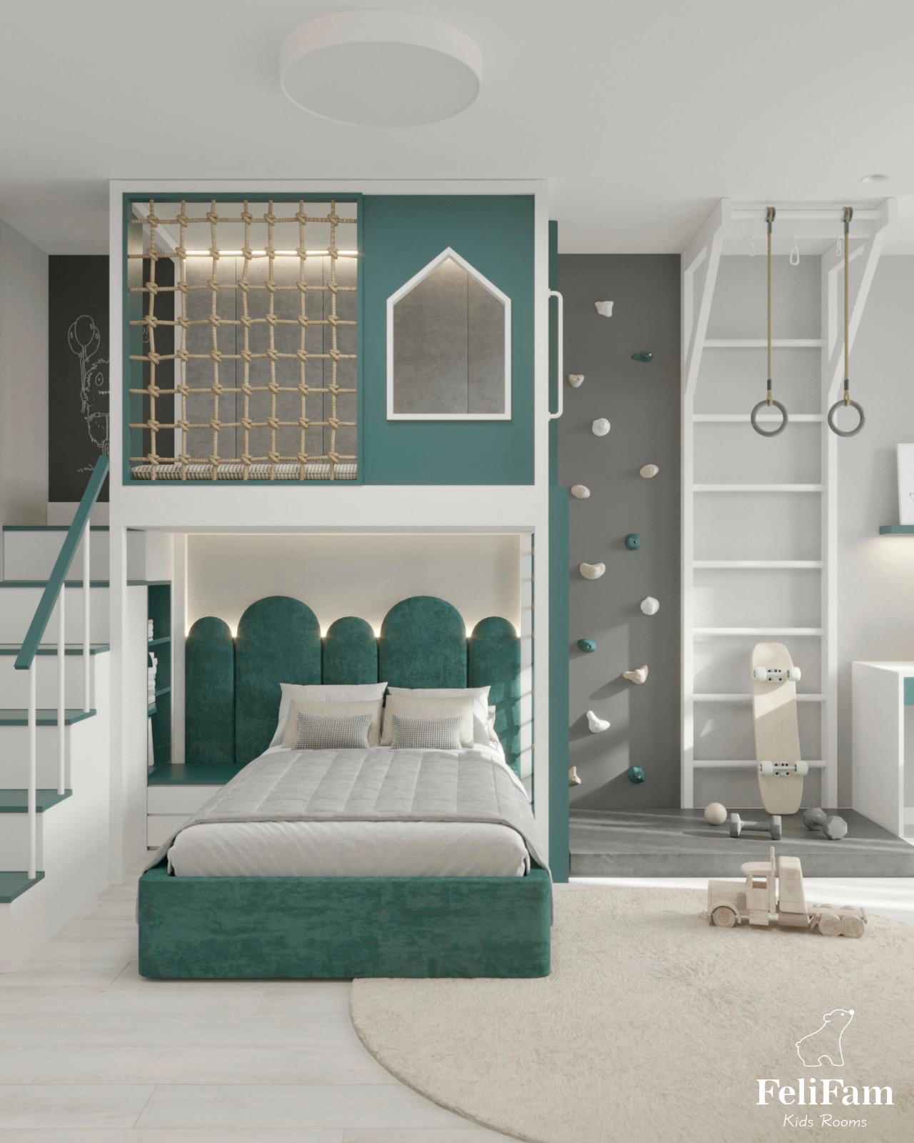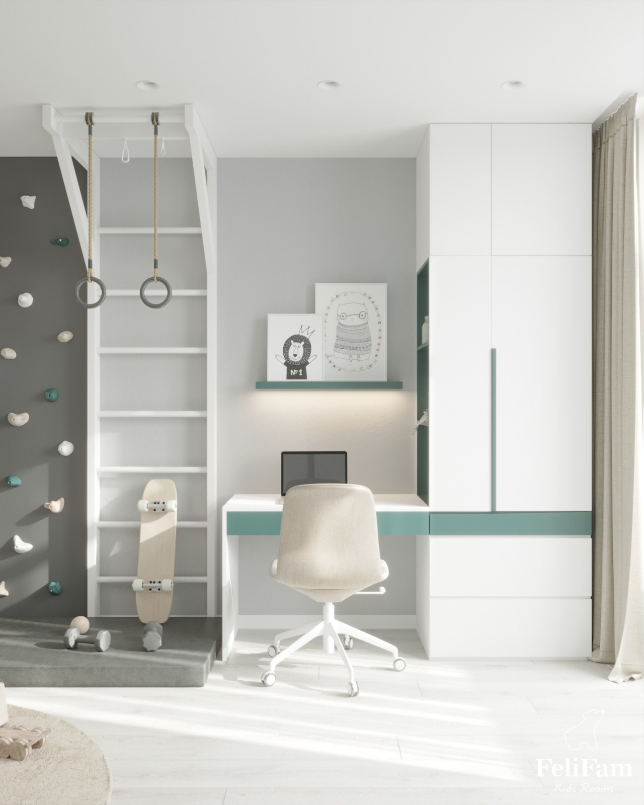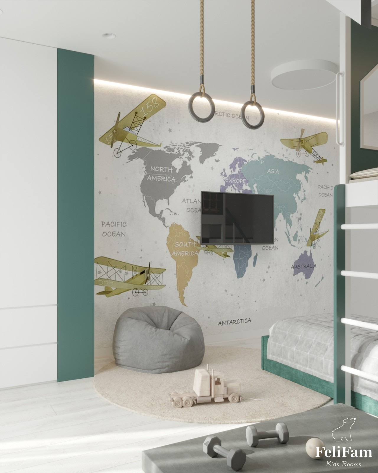A room for an active boy with an accent shade of emerald color. In addition to a sports corner with a wall bars and a climbing wall, we placed a play area on the second floor of the bed. The room also has everything you need – a study area, a TV area, and a large wardrobe. And there is a world map on the wall for the child’s education.