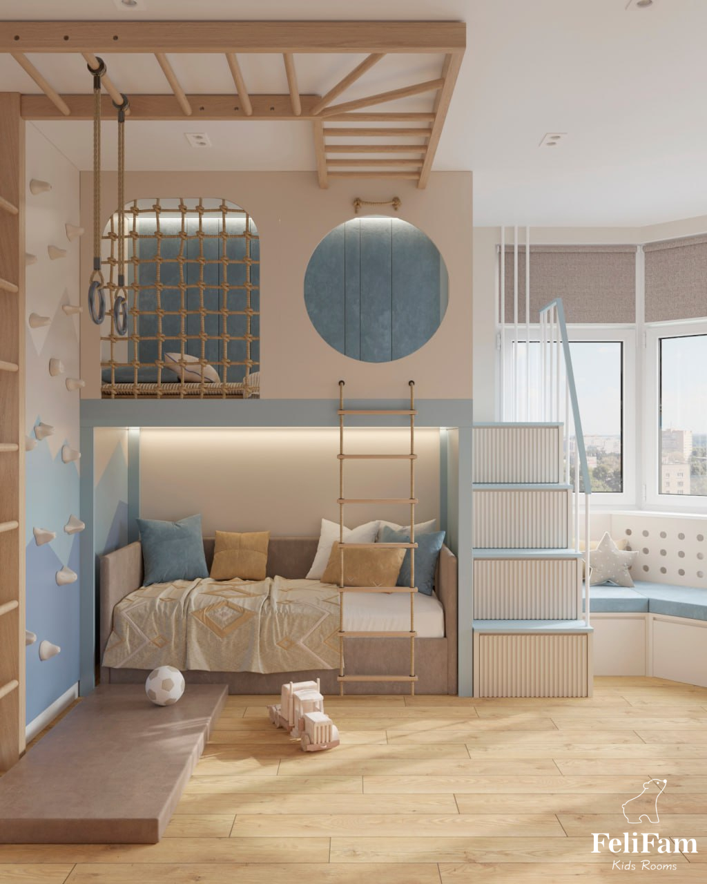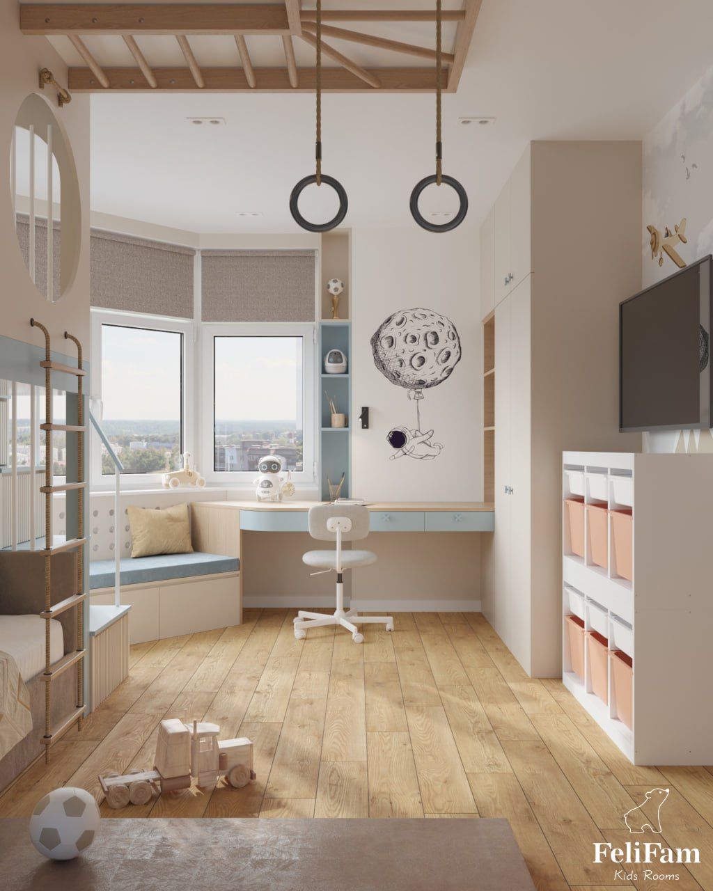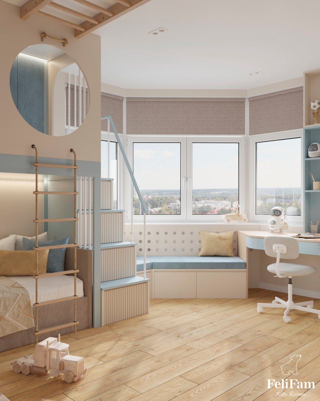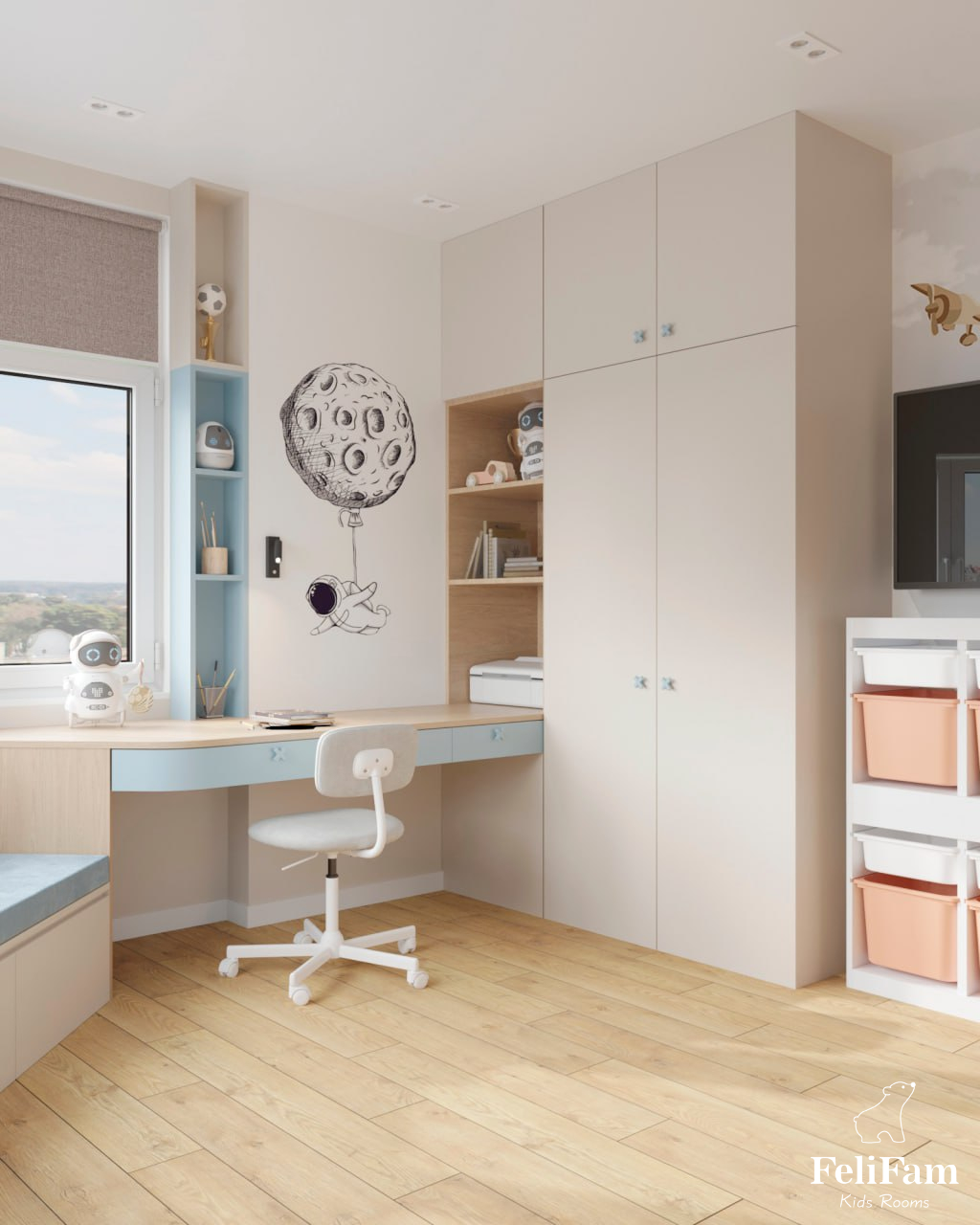 Space for a boy, and in the future for a second child. The room is not a simple shape, so the way we made the layout emphasizes this feature. And the sky blue color in combination with white and shades of natural wood makes the room look more spacious.