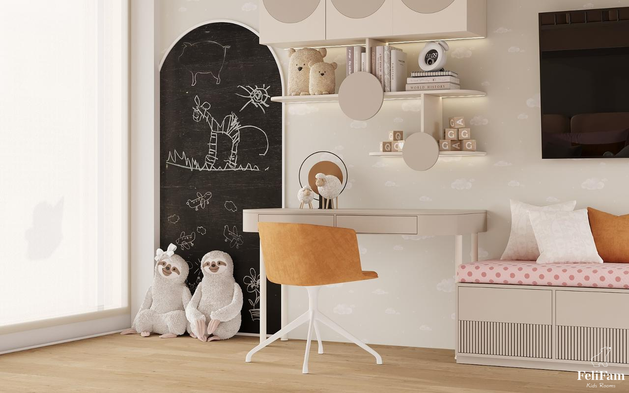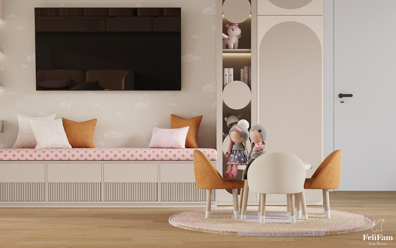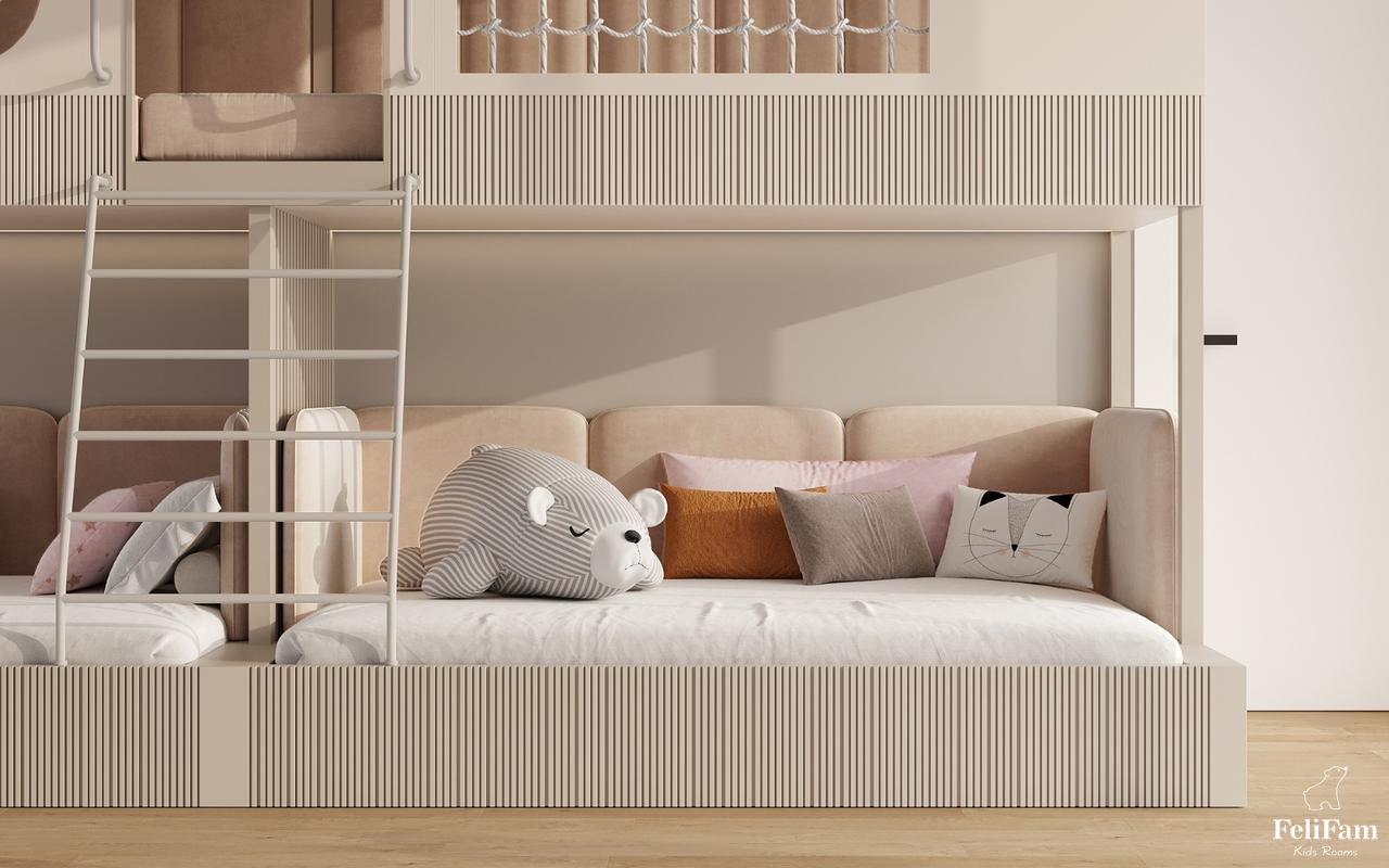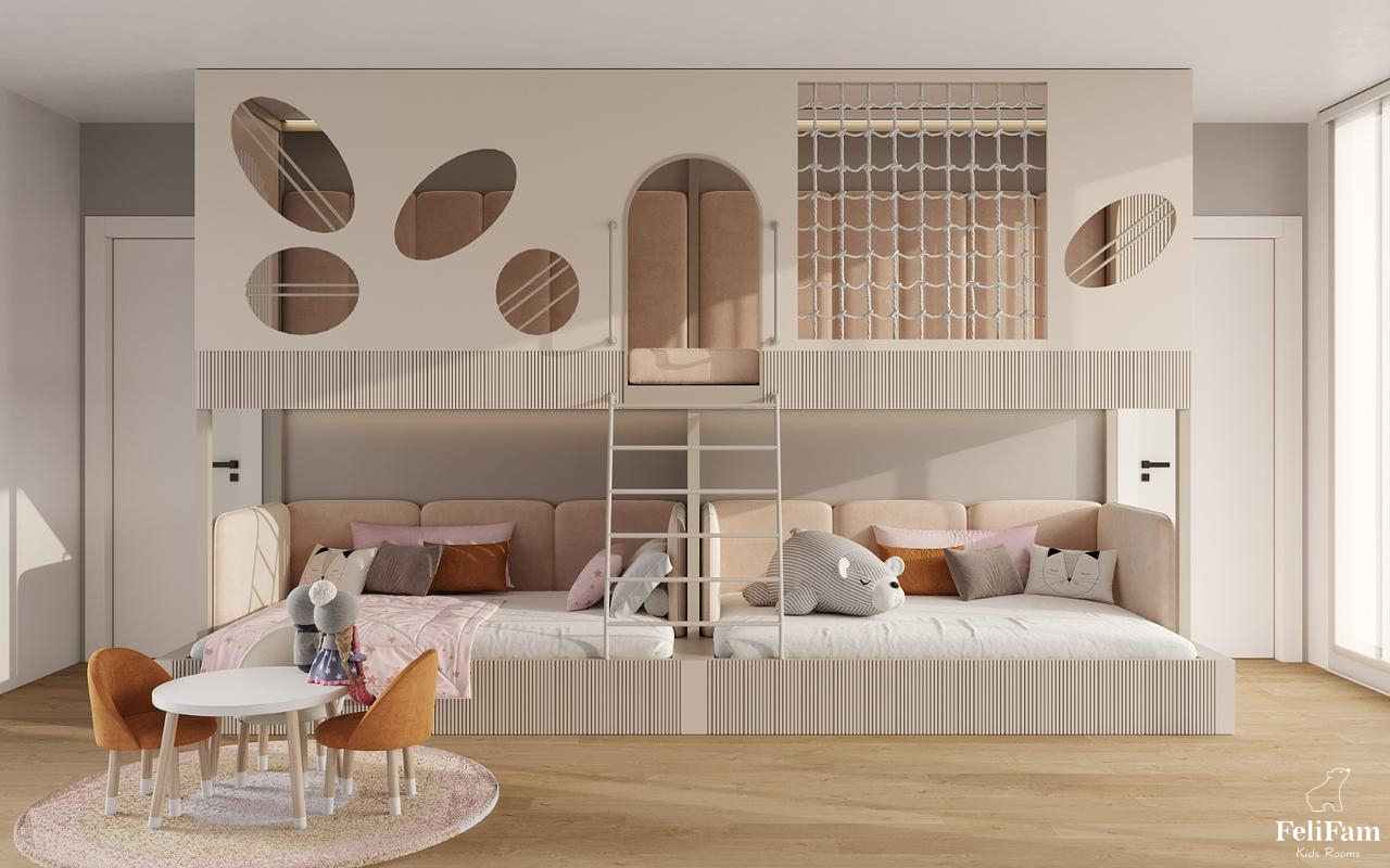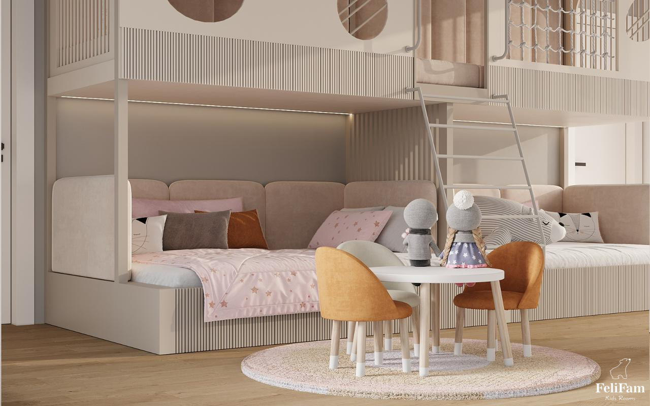 A project for two children from the province of Cadiz. The room has a separate dressing room, so we used the space properly, arranged a large bed for the children with a play area on top and provided additional beds for friends who come to visit.