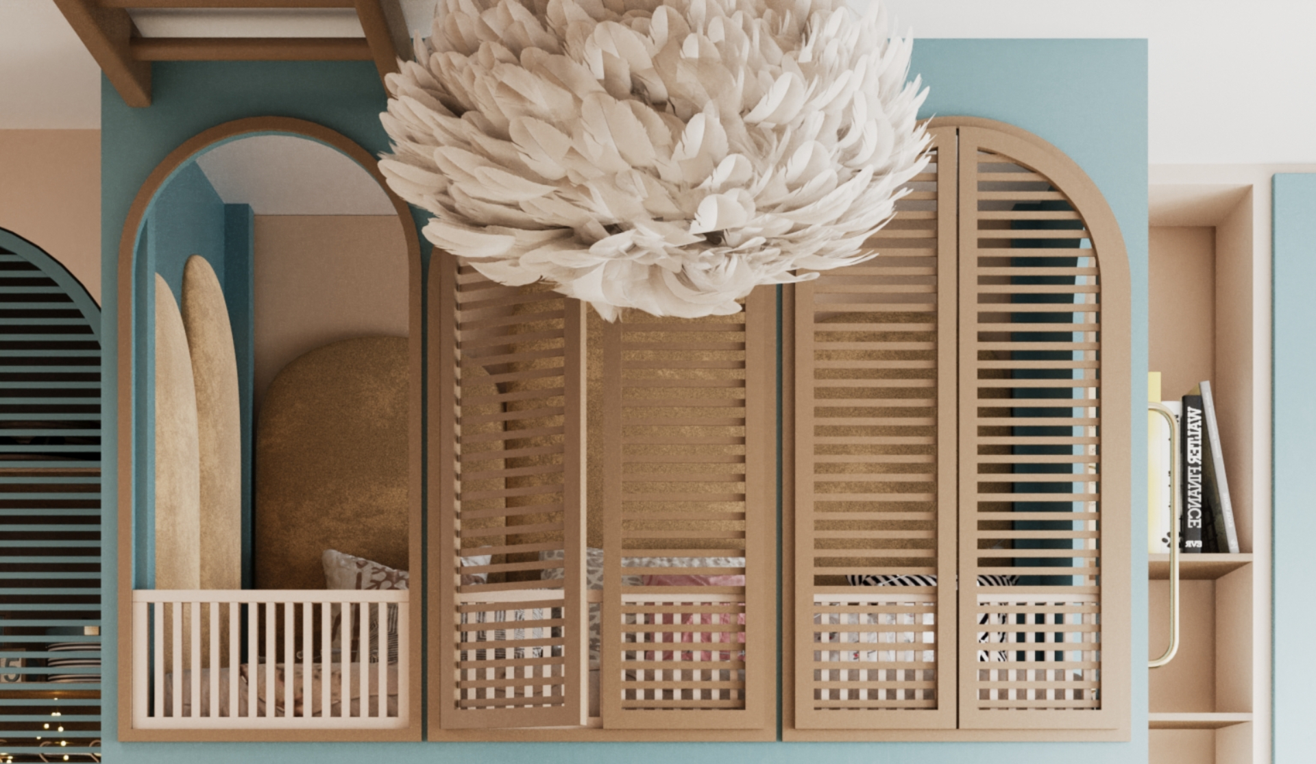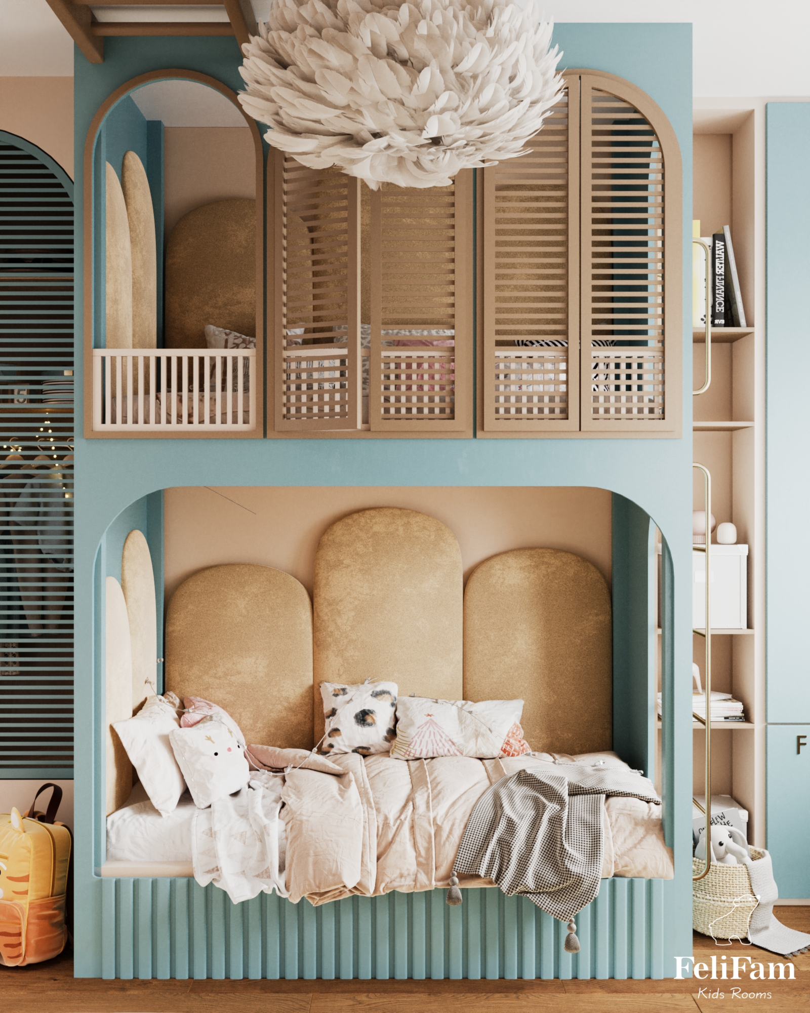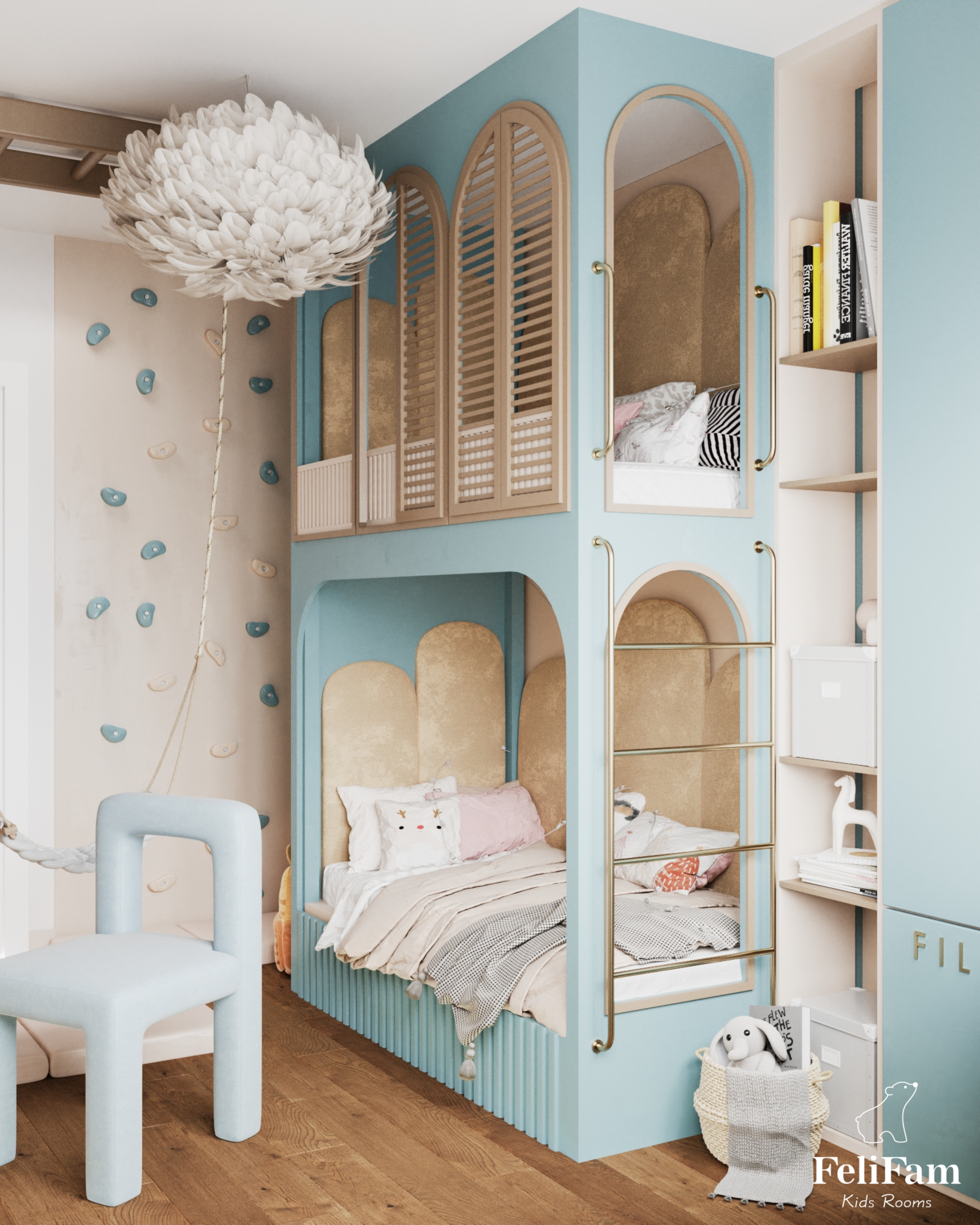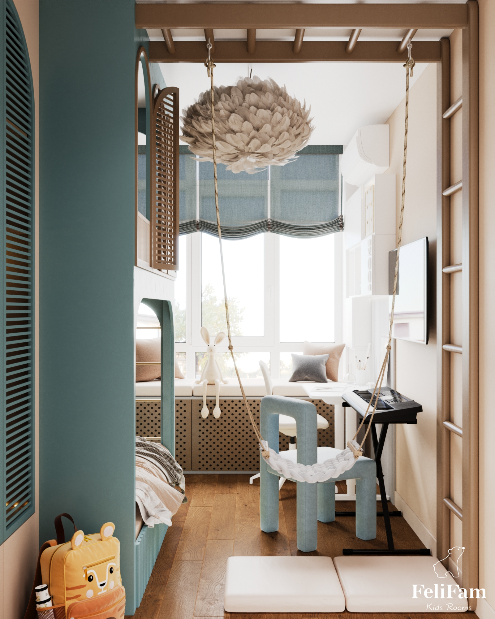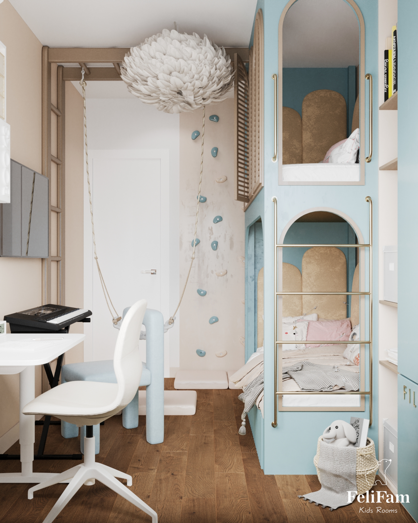 A children’s room in an unusual style for a 3-year-old girl. It has everything! A bunk bed with a play area on top, a climbing wall, a Swedish wall and a swing, a seating area on the windowsill, a desk, wardrobes for storing clothes and shelves for books!