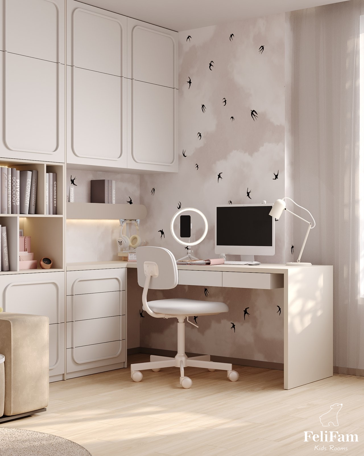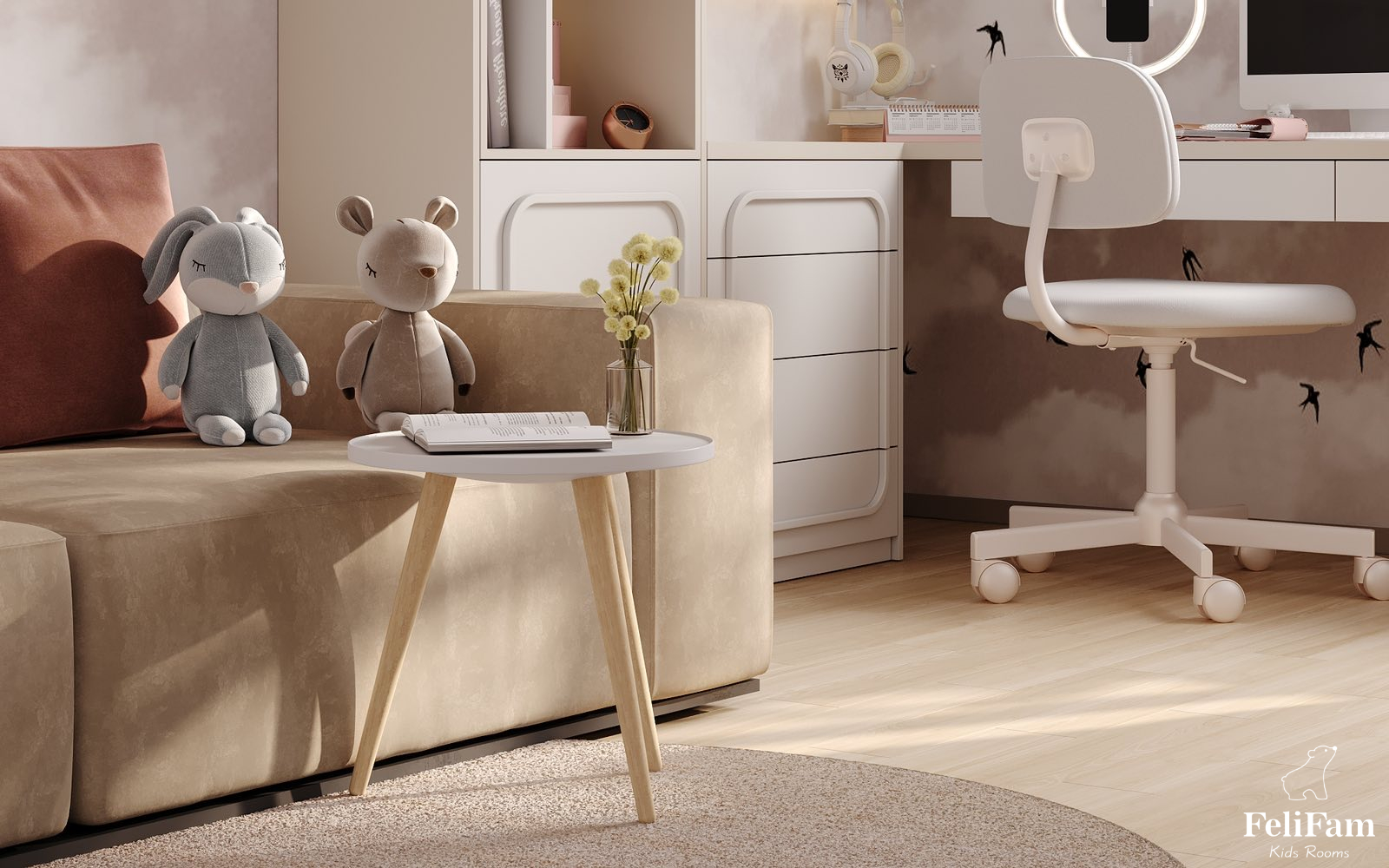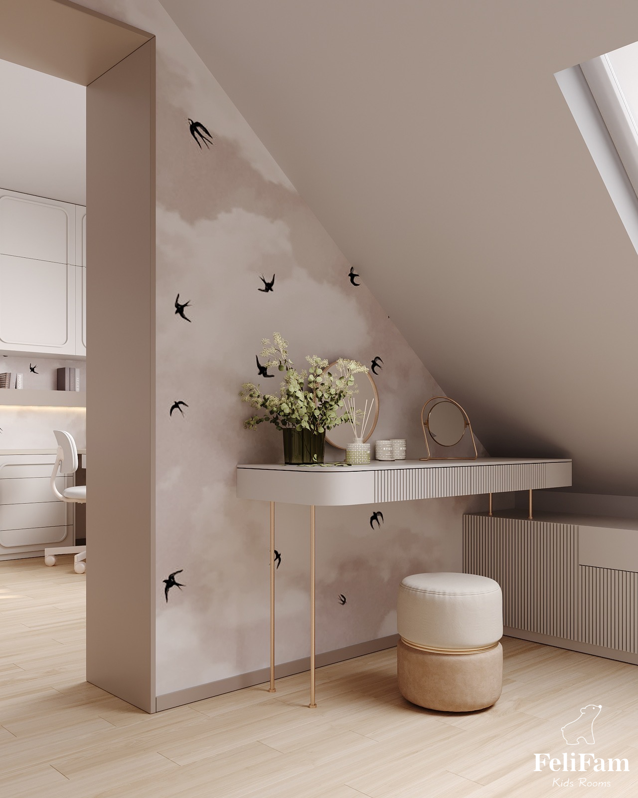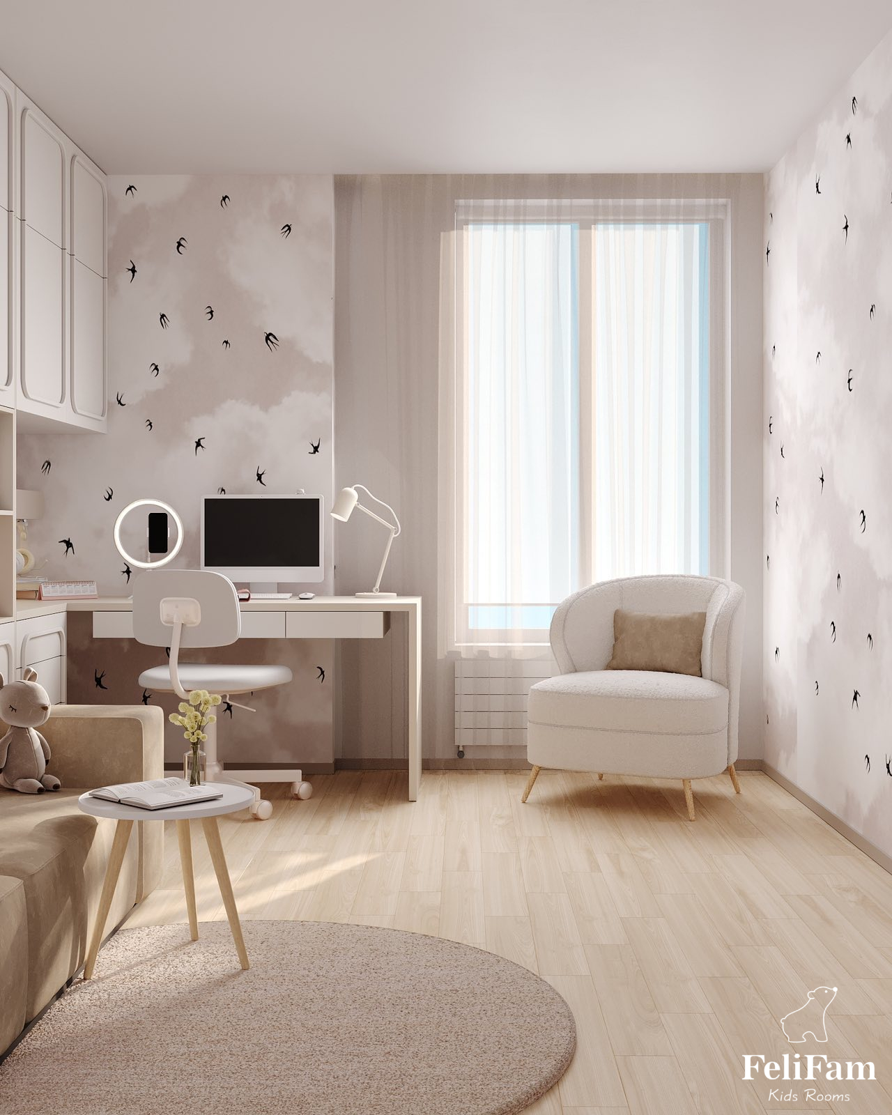The room is divided into two parts for a 12-year-old teenage girl and is decorated in soft pastel colors. The entrance area is a sofa for relaxing and meeting friends and a study area. The second one is a bedroom with a bed, wardrobe and a cosmetic table.