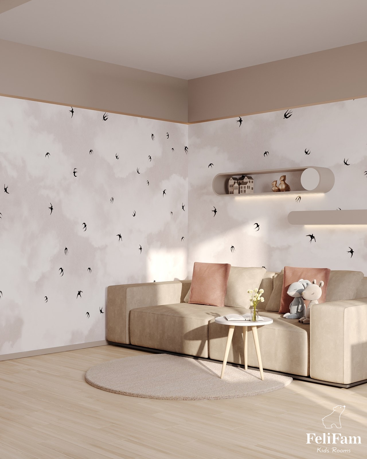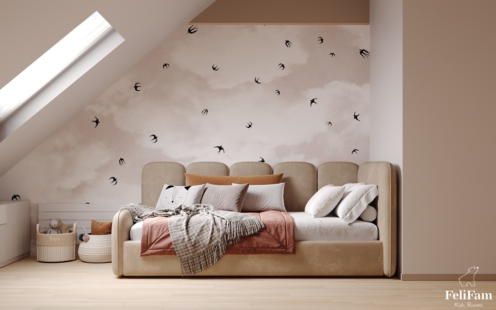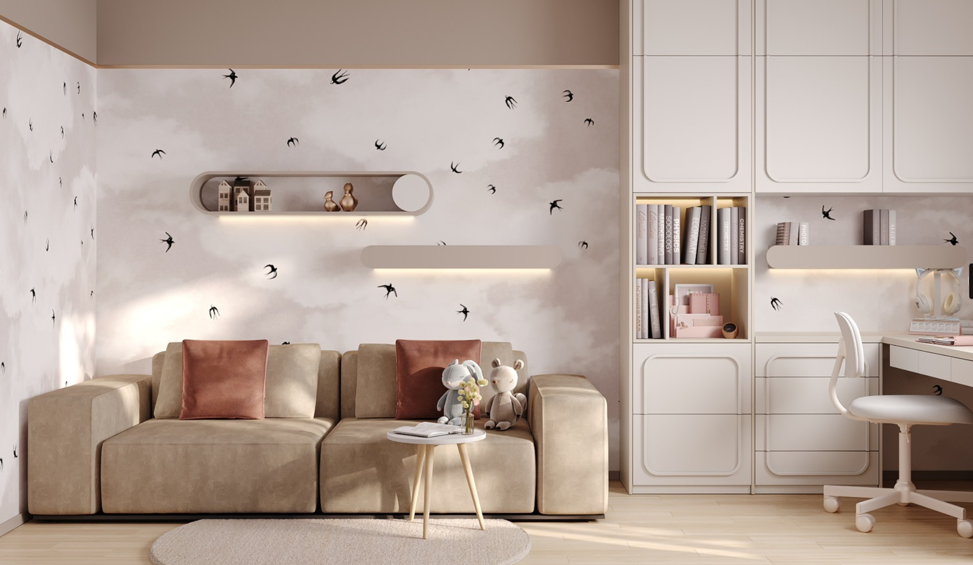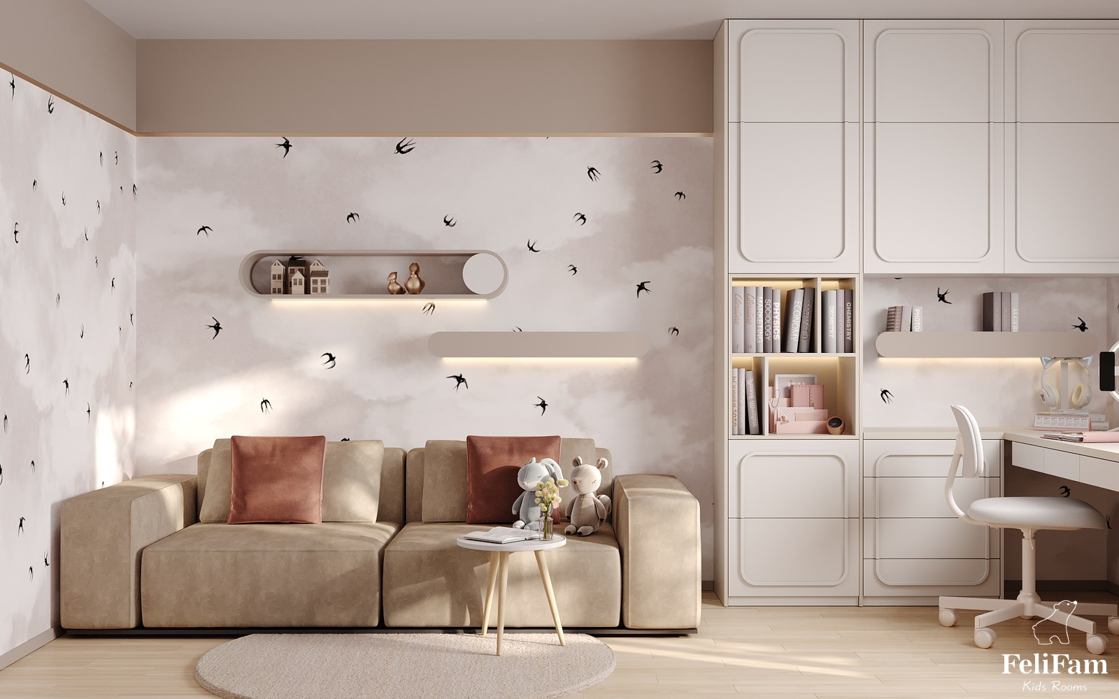 The room is divided into two parts for a 12-year-old teenage girl and is decorated in soft pastel colors. The entrance area is a sofa for relaxing and meeting friends and a study area. The second one is a bedroom with a bed, wardrobe and a cosmetic table.