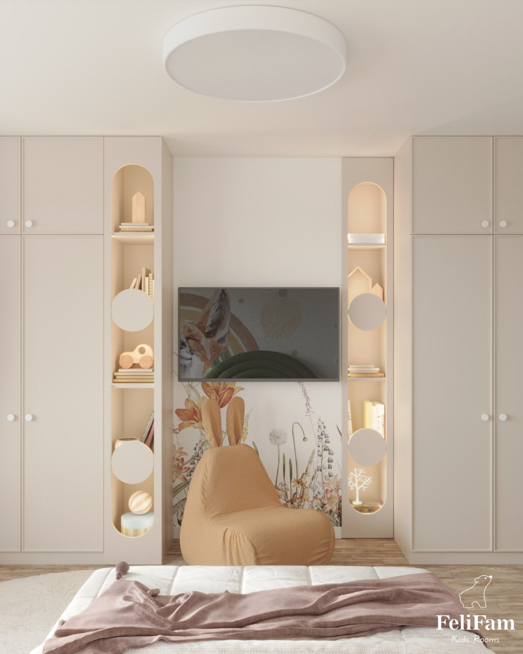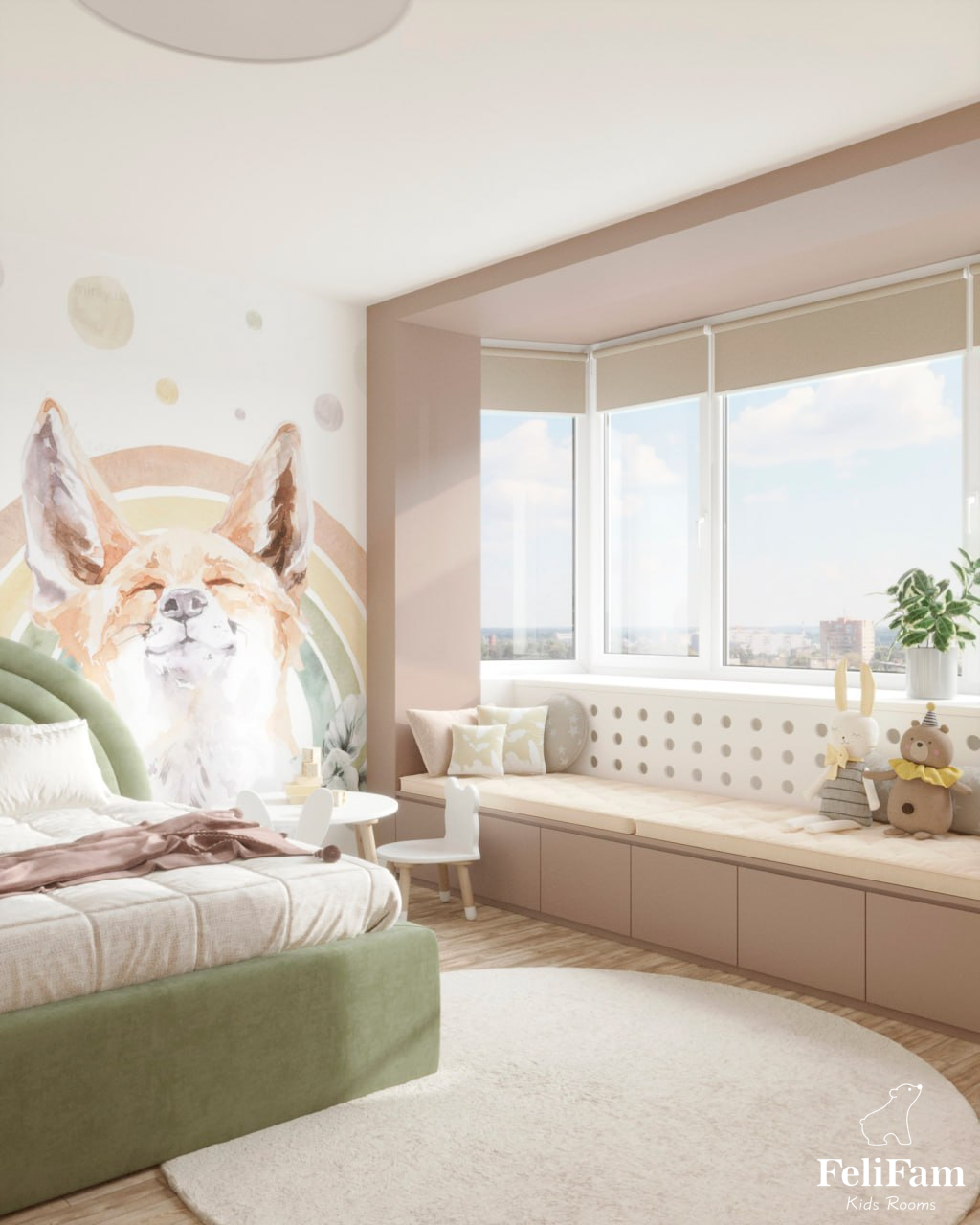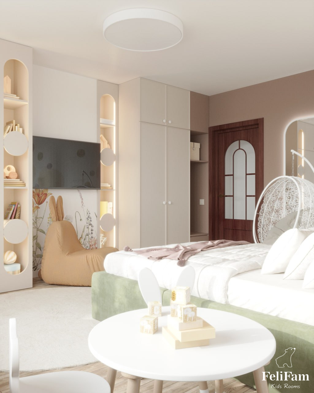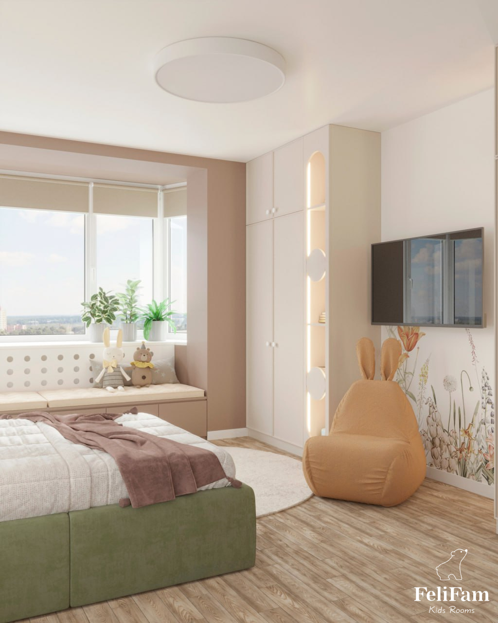 A girl’s room in light colors with an accent of olive. We made a cozy area near the window with a soft window sill and storage cabinets, as well as separate cabinets with milling and open shelves.