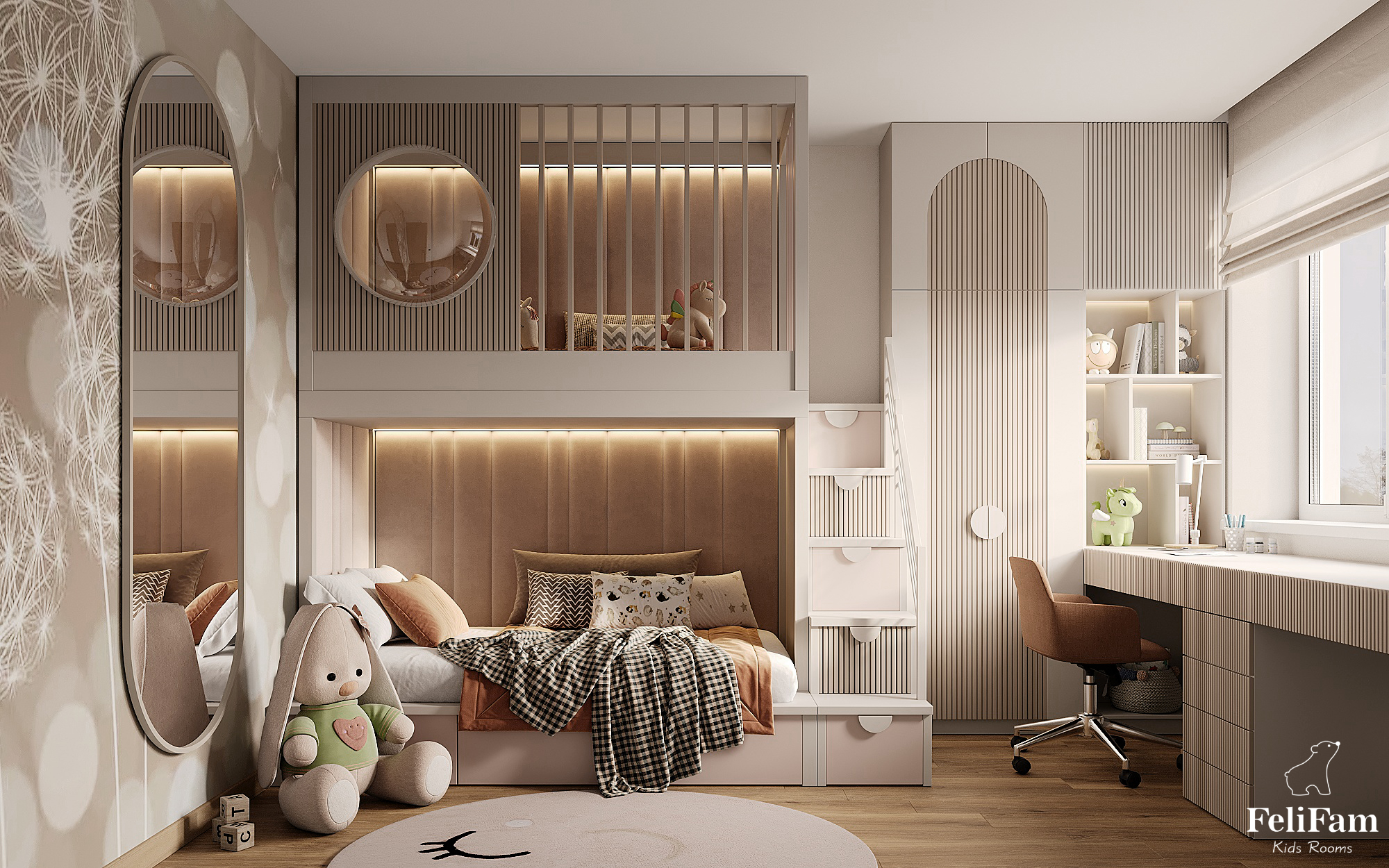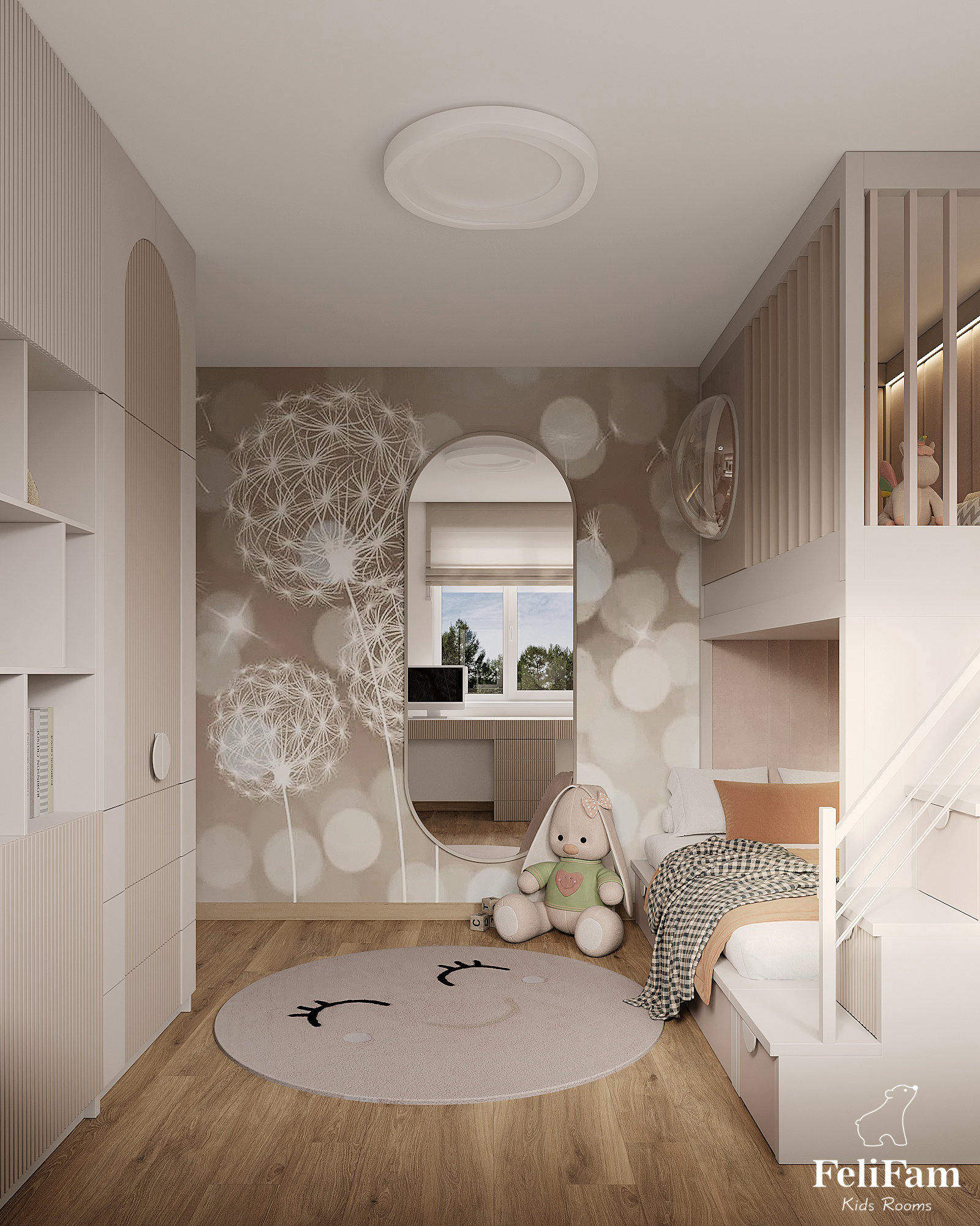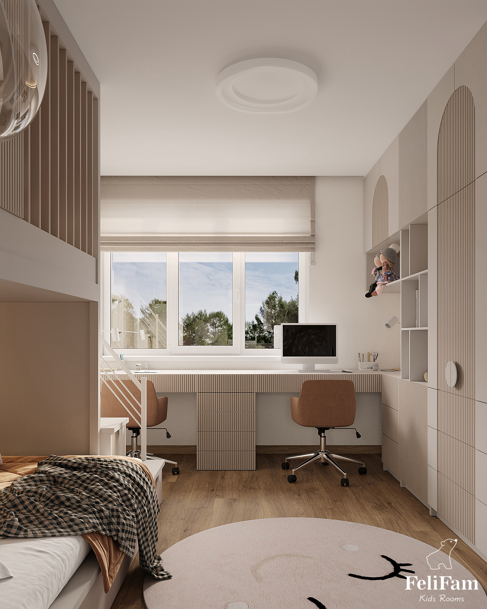 A room for two active girls, aged 4 and 6, in soft pastel colors. We chose a bunk bed with a ladder in the form of drawers and an adjacent bright work area by the window.