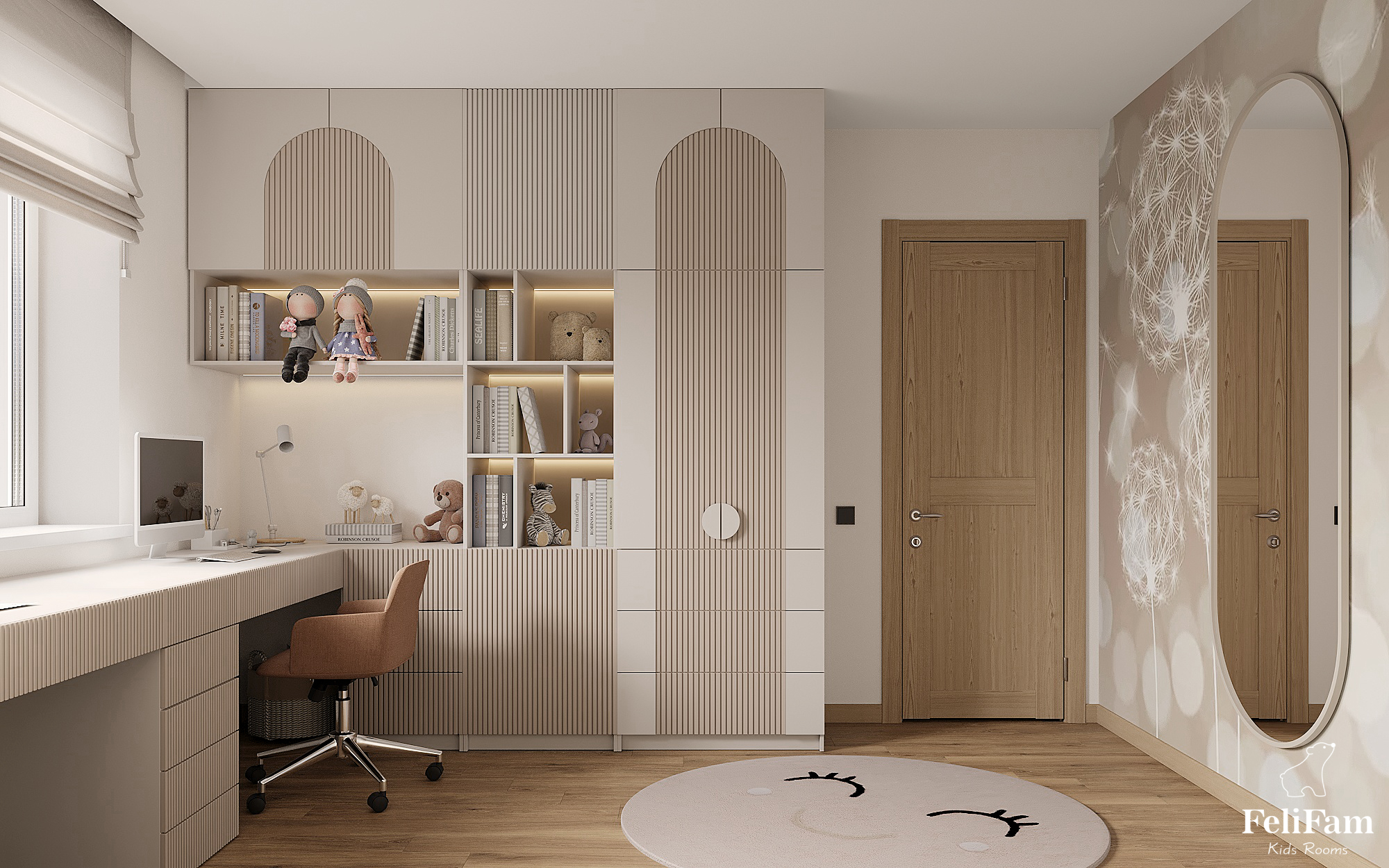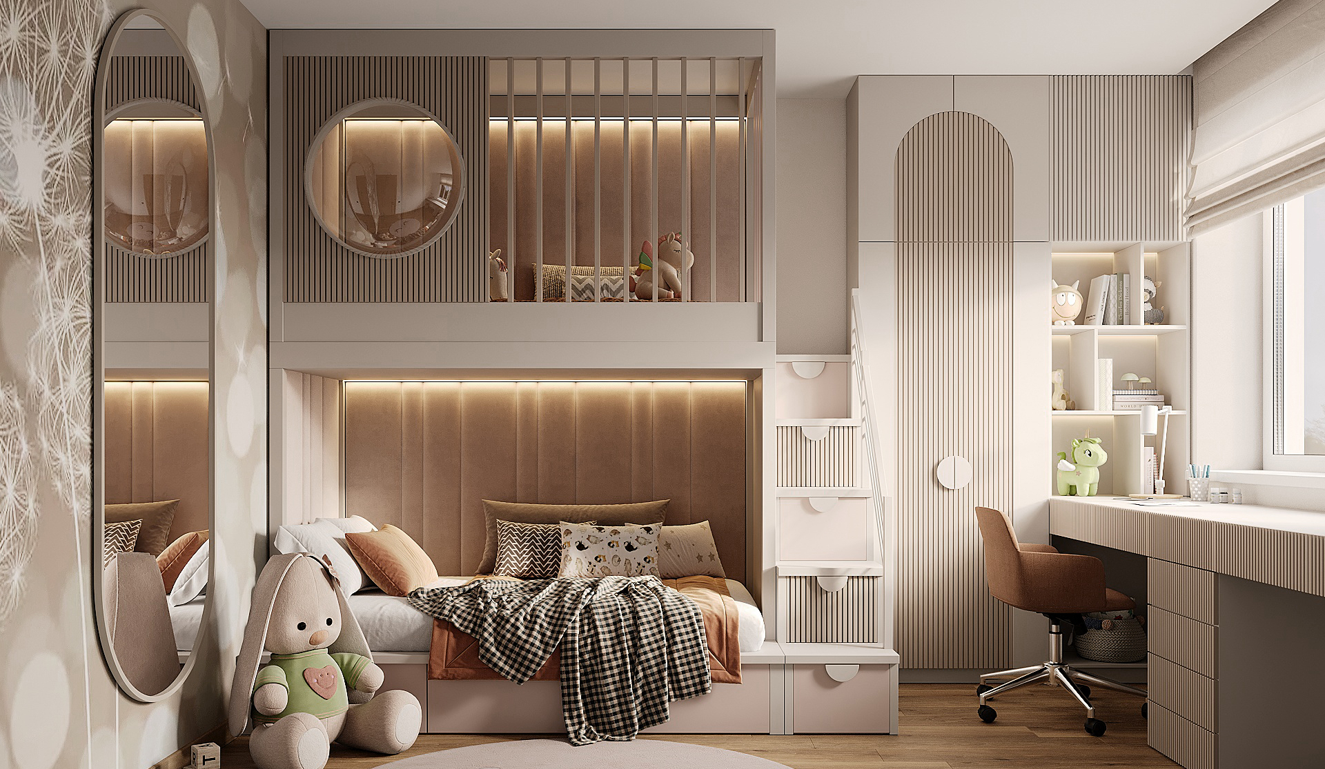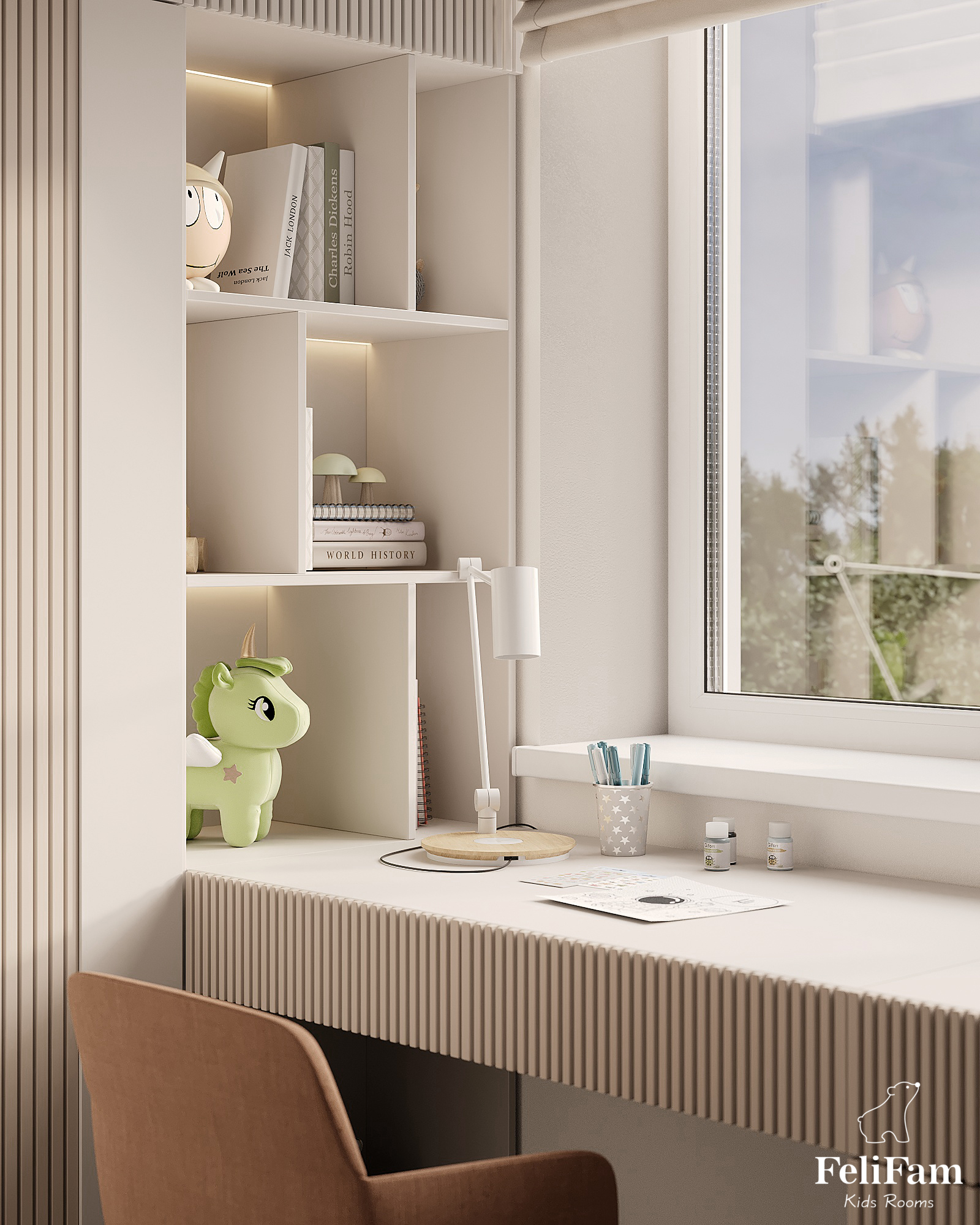 A room for two active girls, aged 4 and 6, in soft pastel colors. We chose a bunk bed with a ladder in the form of drawers and an adjacent bright work area by the window.