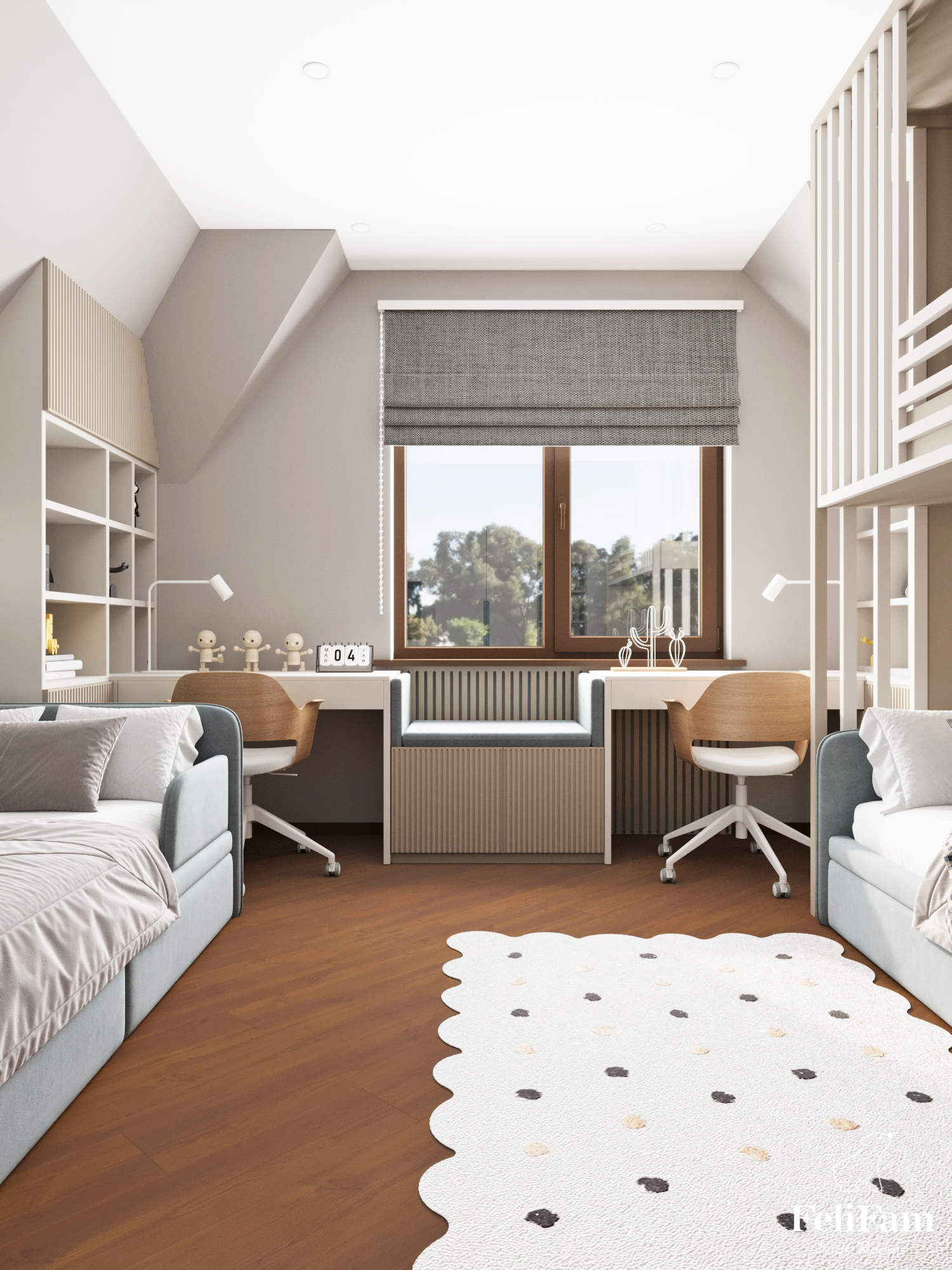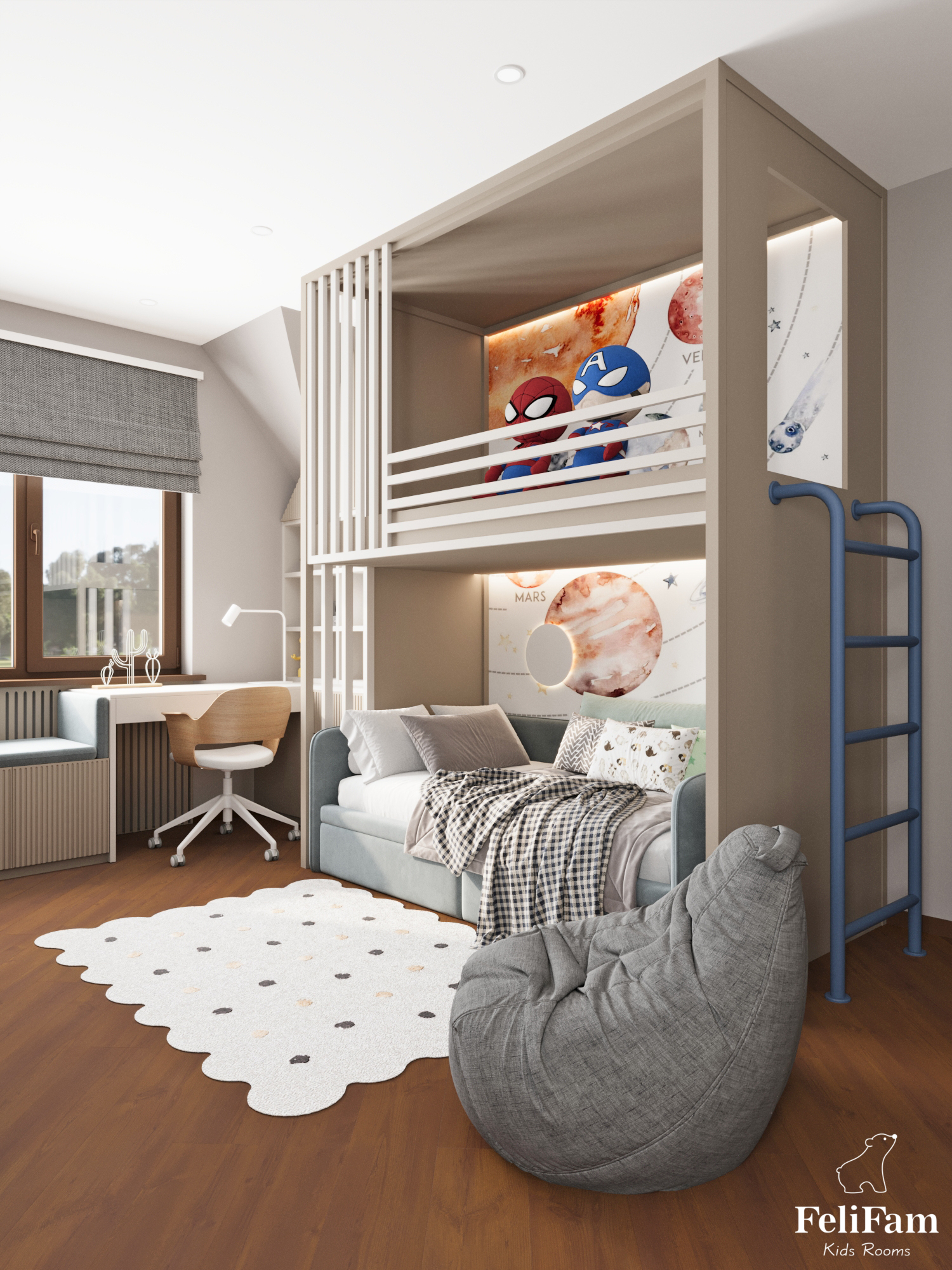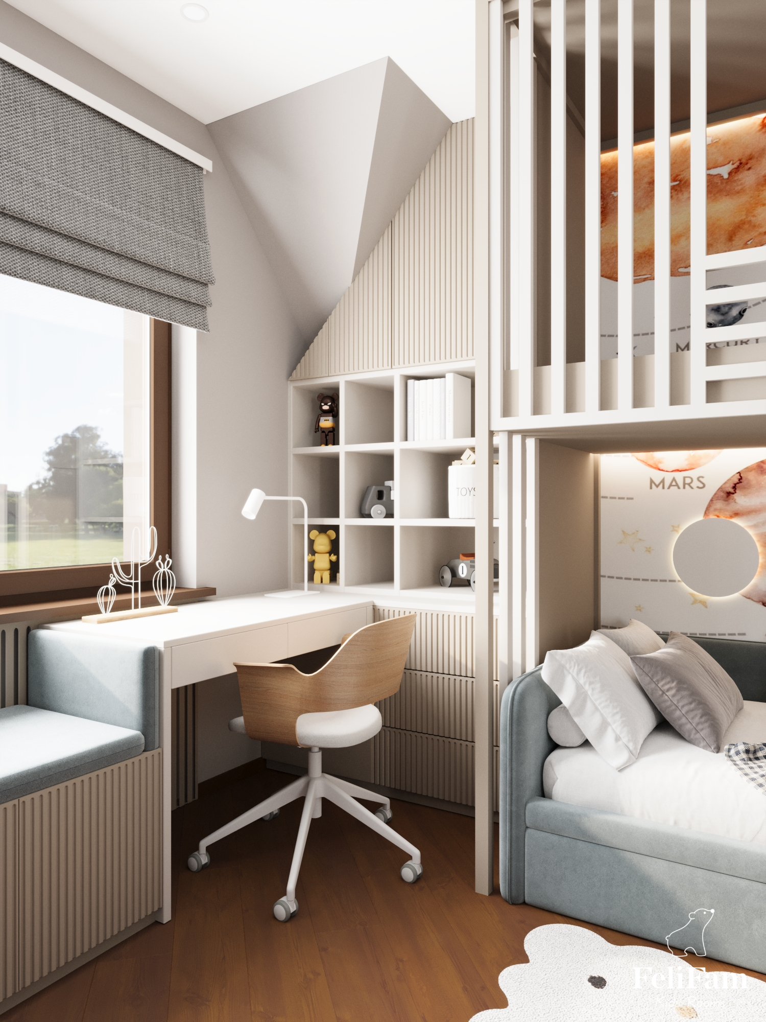 A non-standard attic room for 2 boys. In addition to two beds, the room has a second floor of bunk beds that can be used as a play area. There is also a spacious study area and a large wardrobe for storing things.
