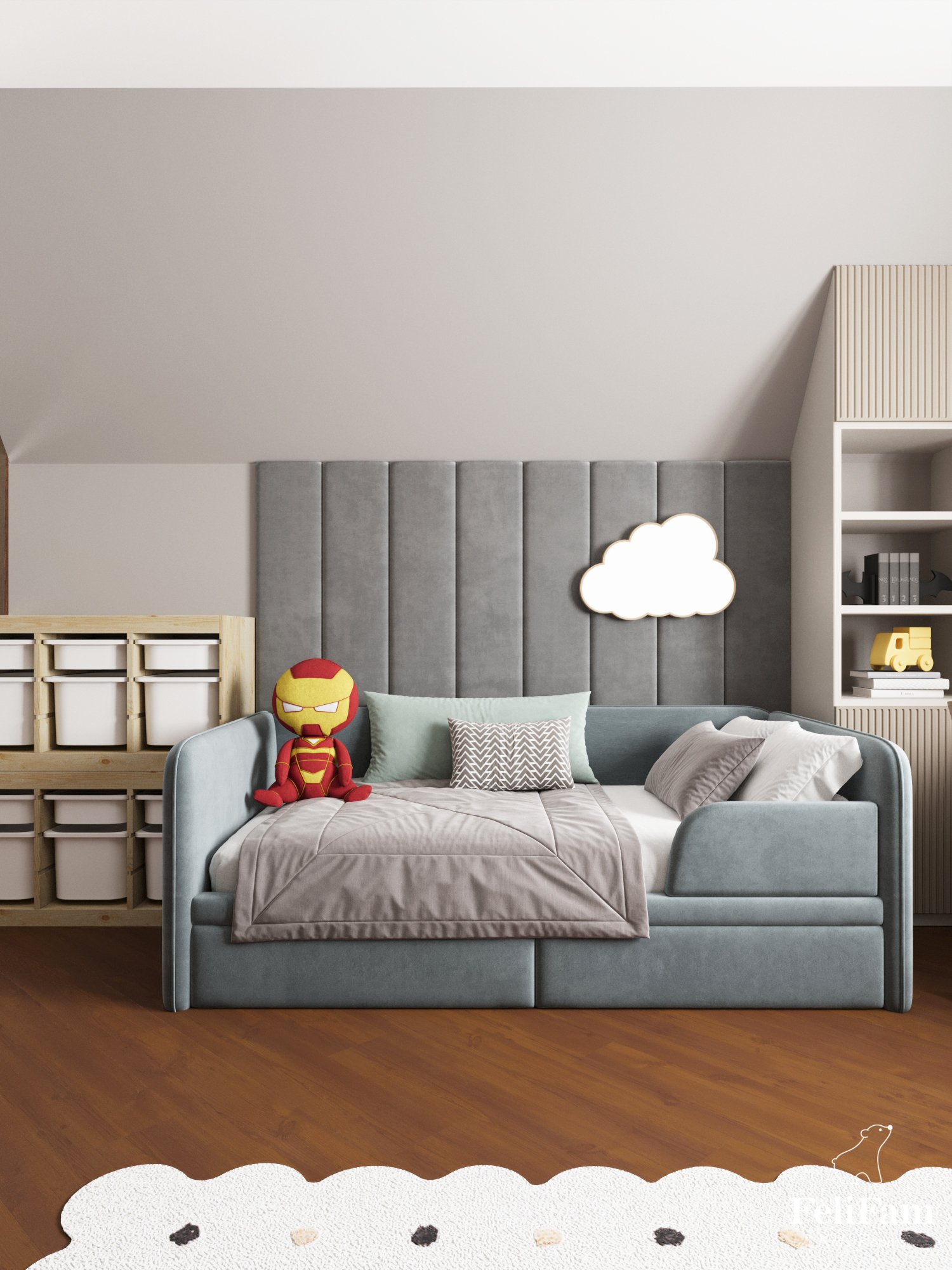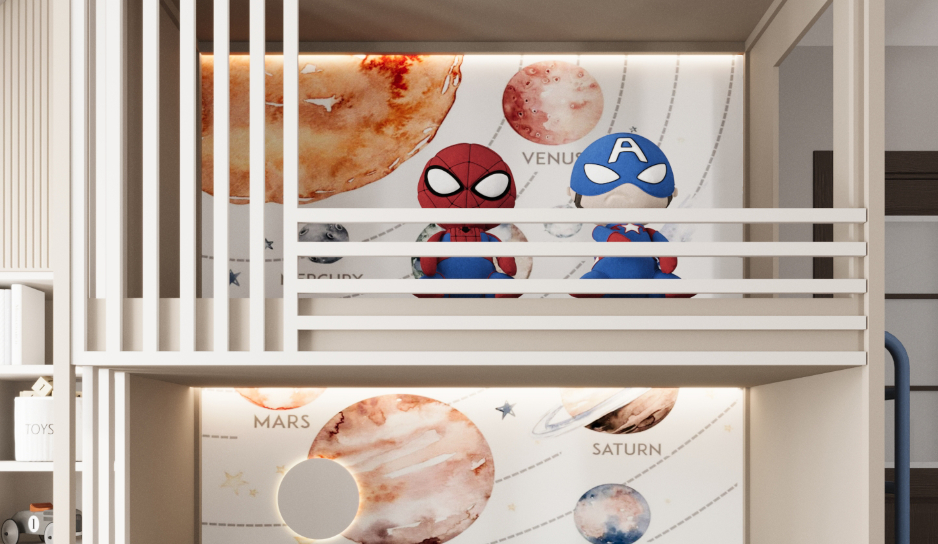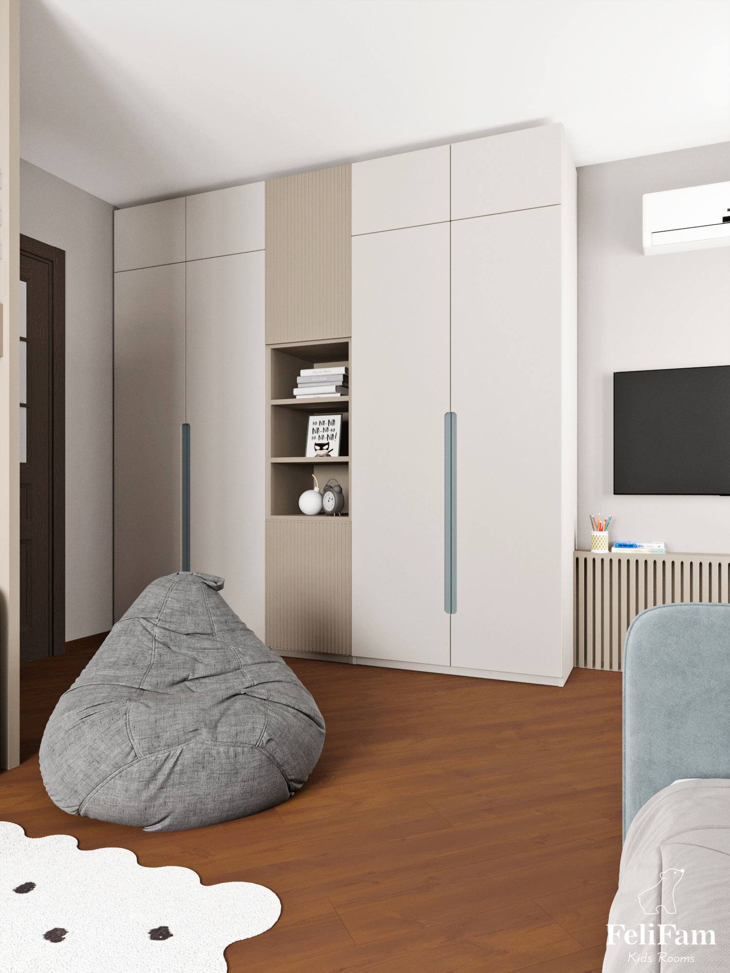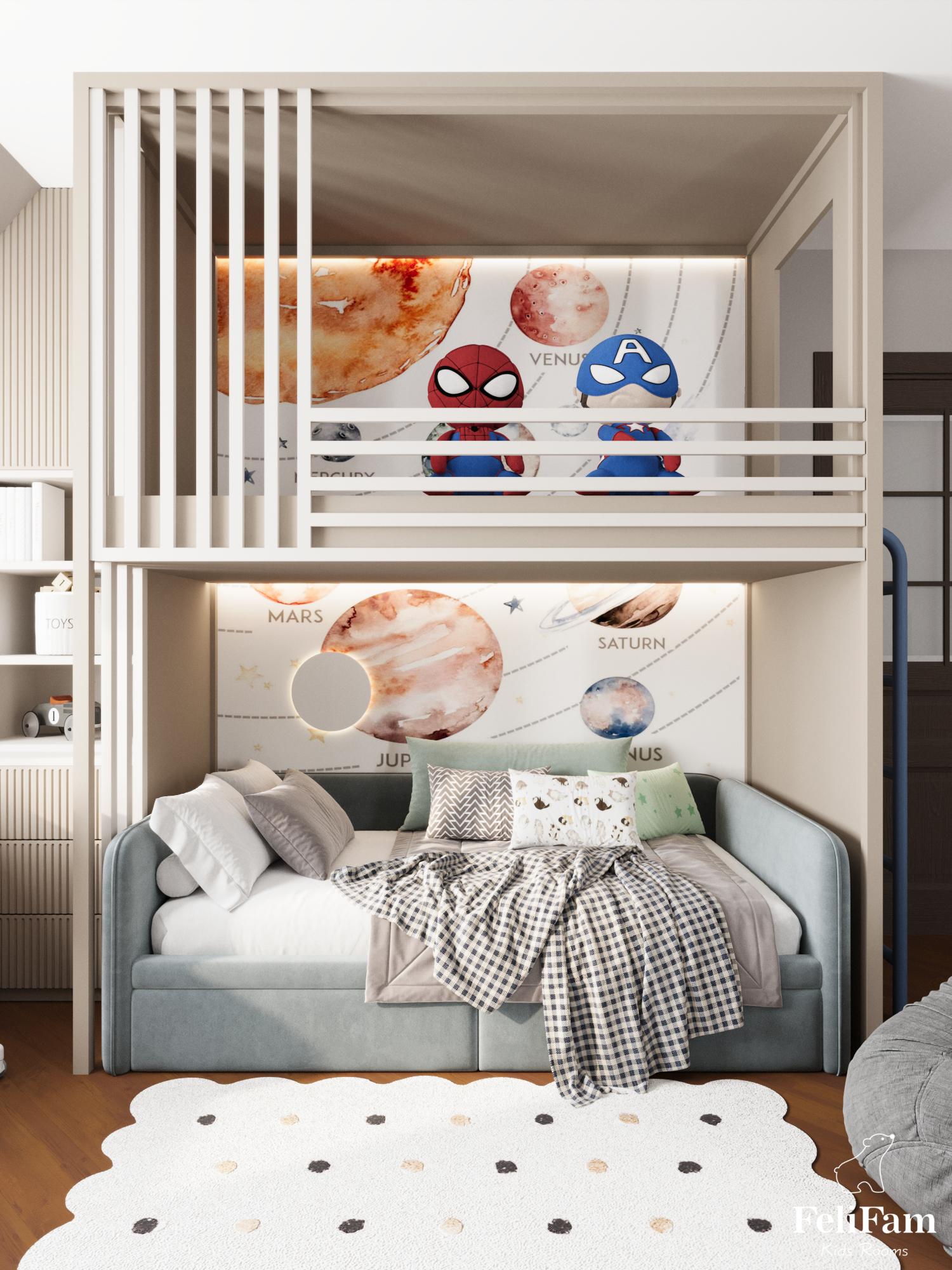 A non-standard attic room for 2 boys. In addition to two beds, the room has a second floor of bunk beds that can be used as a play area. There is also a spacious study area and a large wardrobe for storing things.