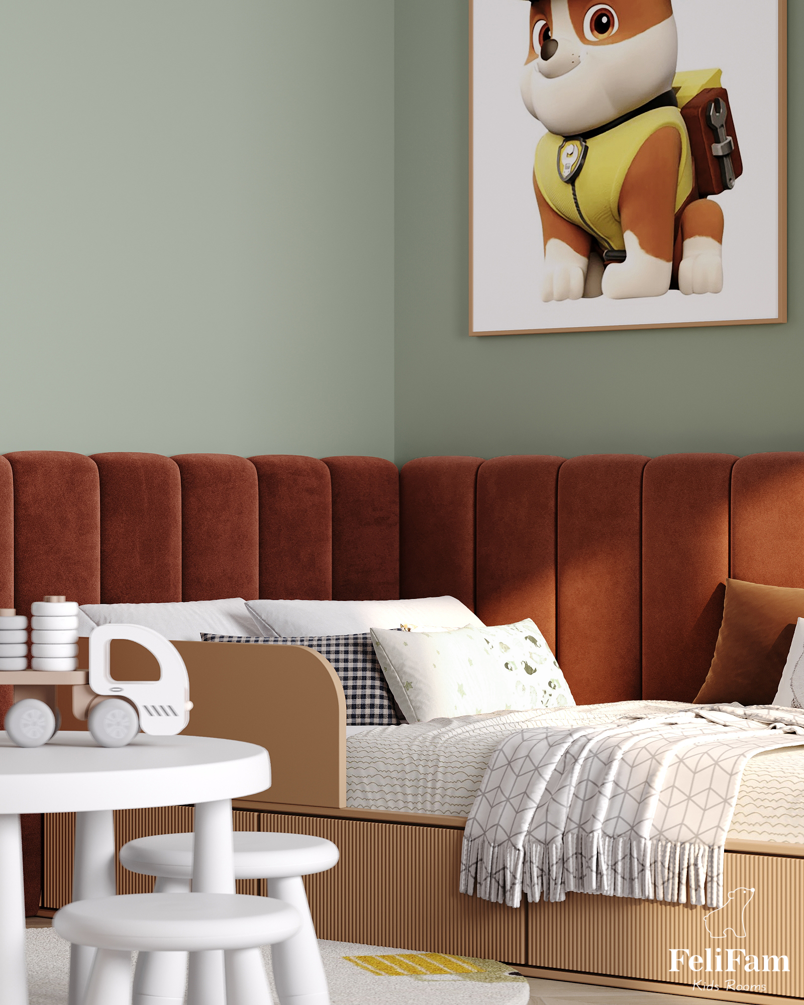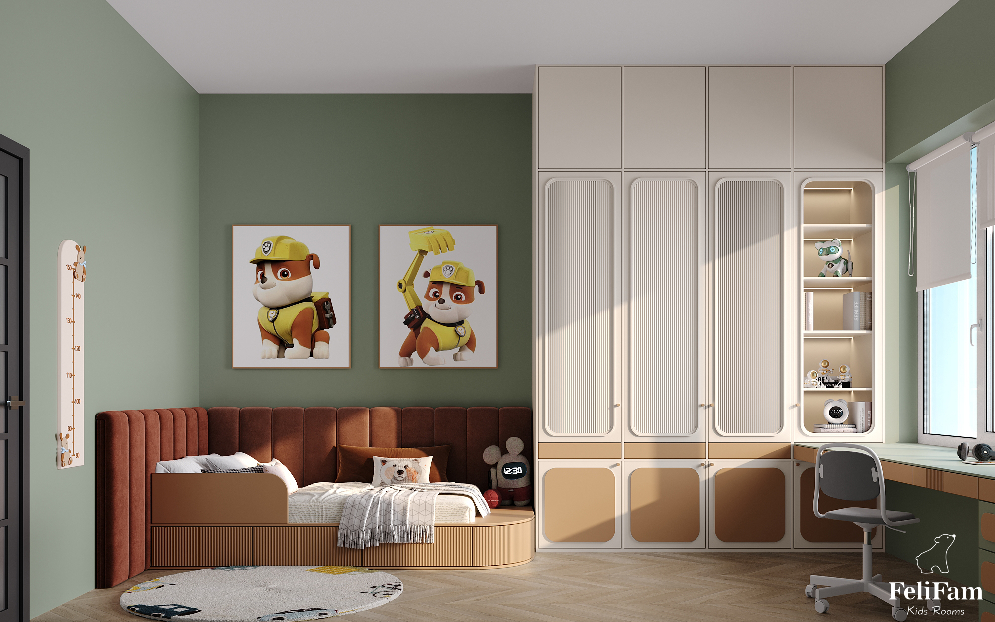 A room in interesting colors and shades for a boy. The non-standard shapes of the furniture make the room special, and the layout is functional and cozy!
