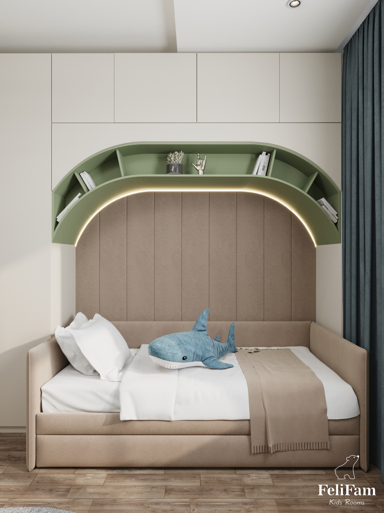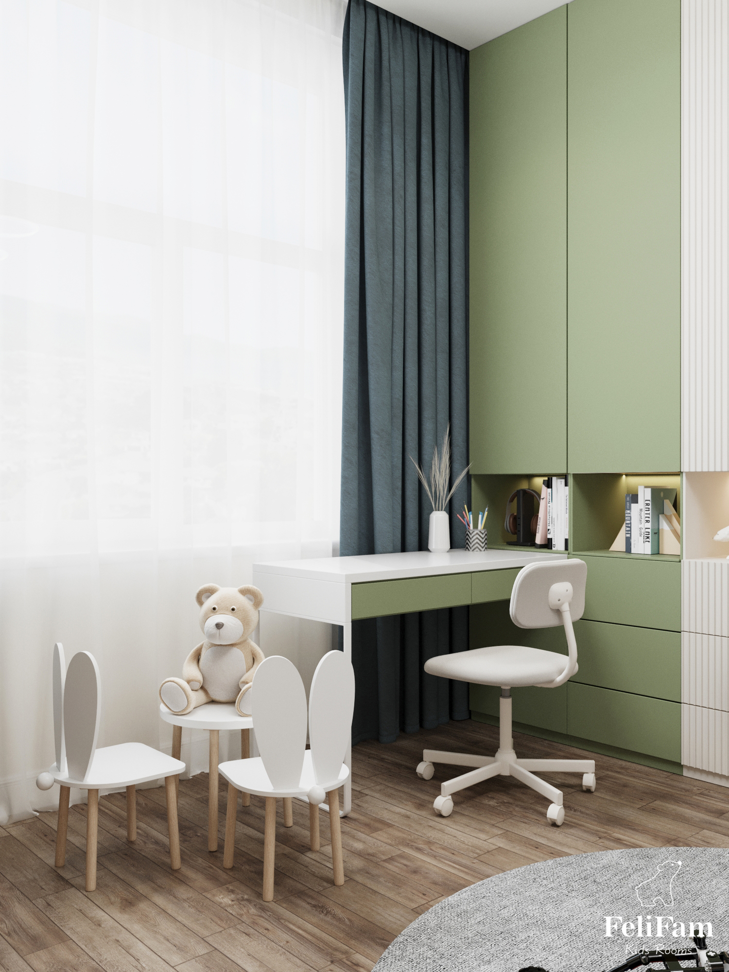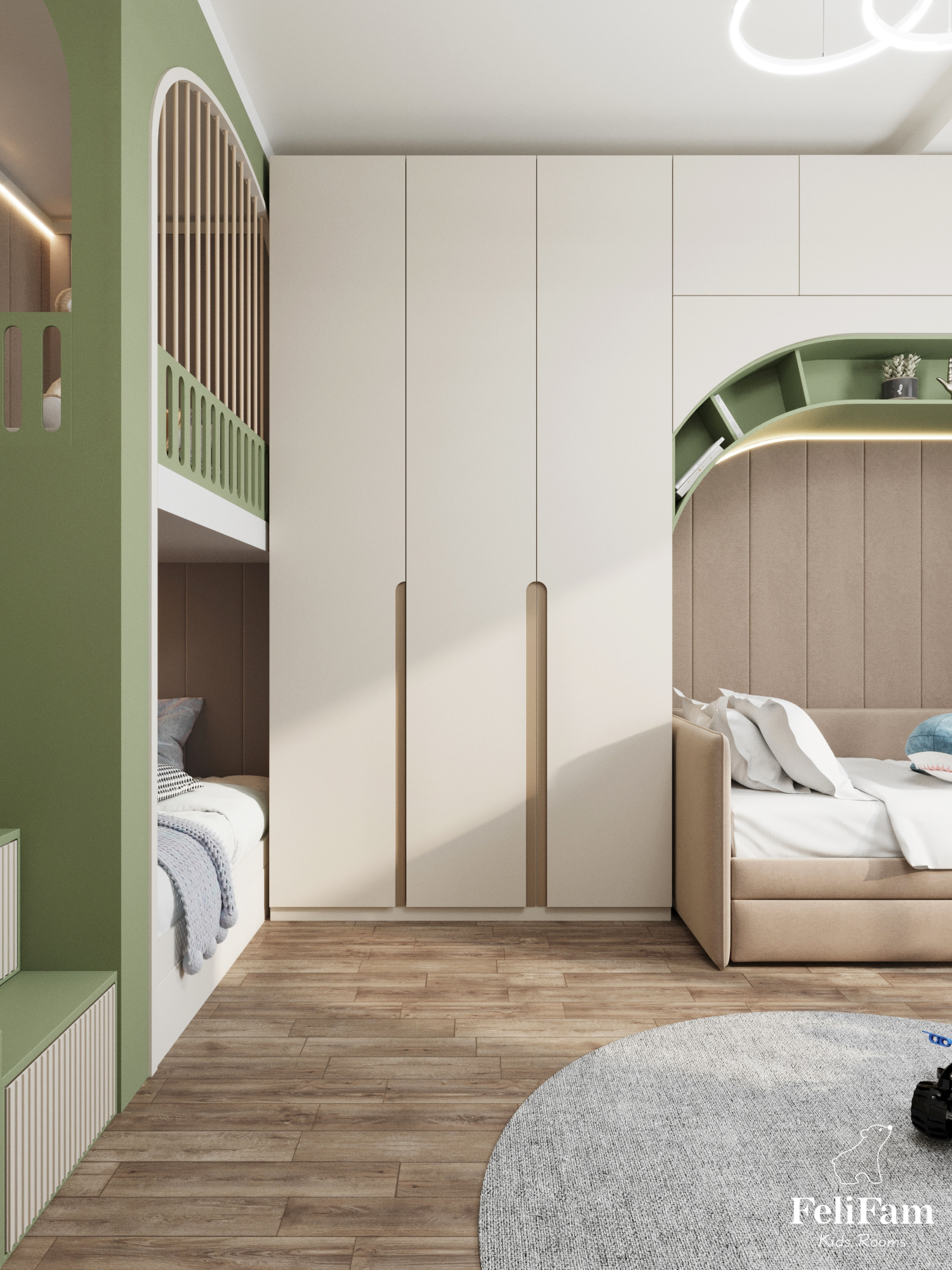 Shared bright and spacious room for 3 children. The room has a lot of storage space for things and clothes and separate sleeping areas – a sofa for the girl and a bunk bed for the boys. There is also a separate study area and a table for games and development.
