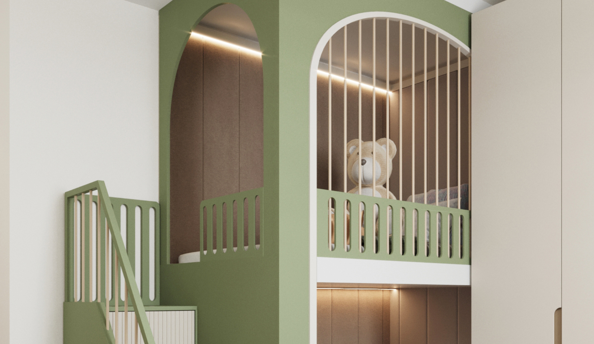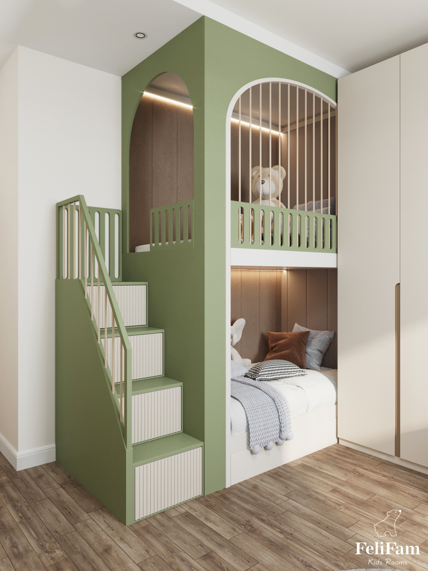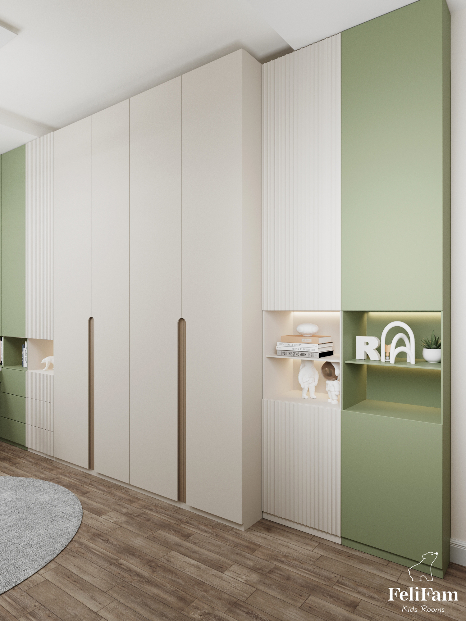 Shared bright and spacious room for 3 children. The room has a lot of storage space for things and clothes and separate sleeping areas – a sofa for the girl and a bunk bed for the boys. There is also a separate study area and a table for games and development.
