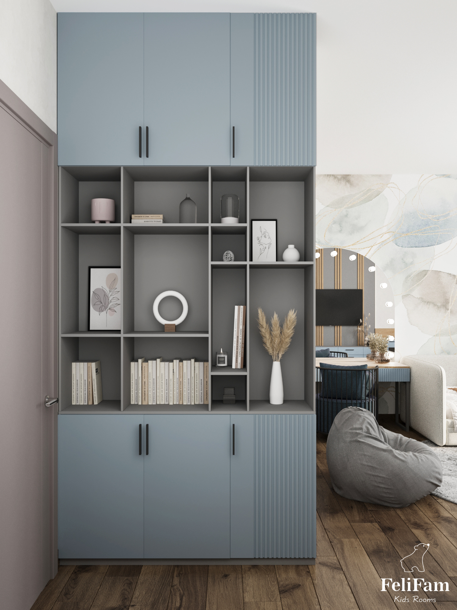 A stylish room for a teenage girl in a country house. The project has all the necessary zones – there is a study area, a rest area, a cosmetic table with milling, a shelf for things at the entrance to the room and a separate dressing room.