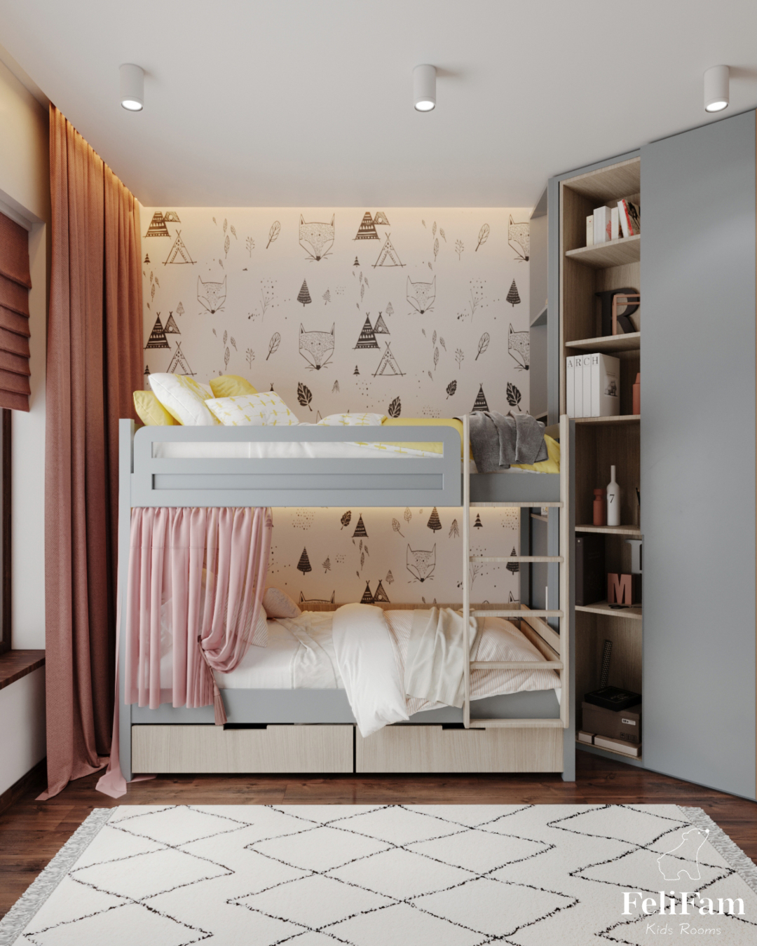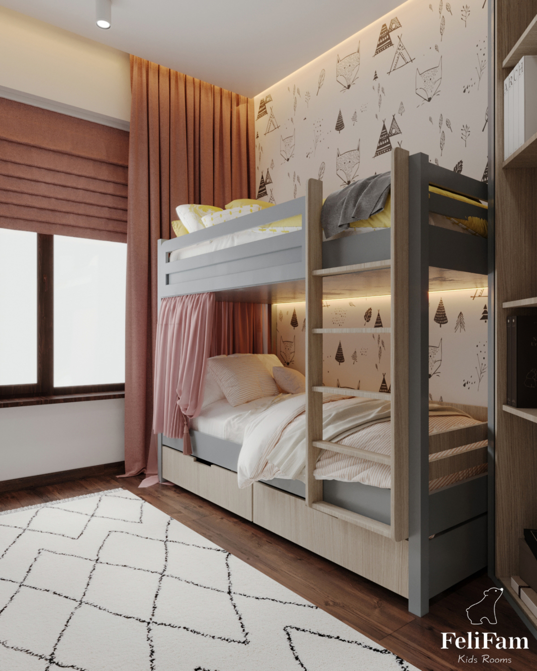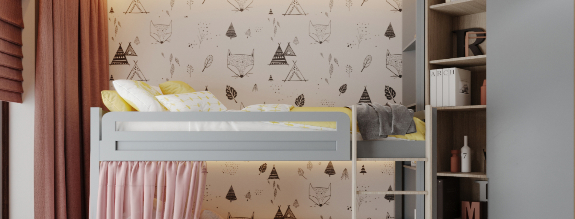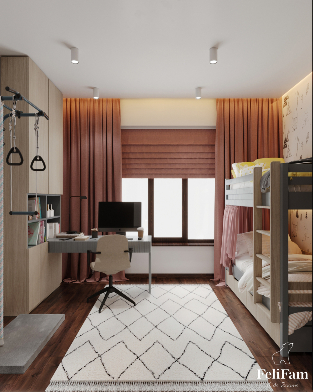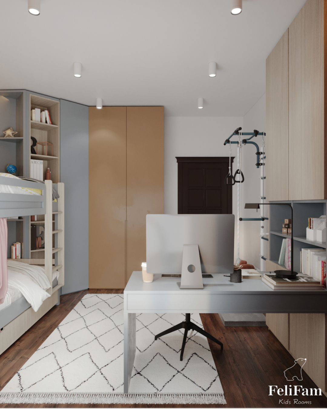 A sleeping area with high, soft panels along the entire wall; a work area with storage and a desk that is harmoniously placed next to the window; a small but cozy sports corner!