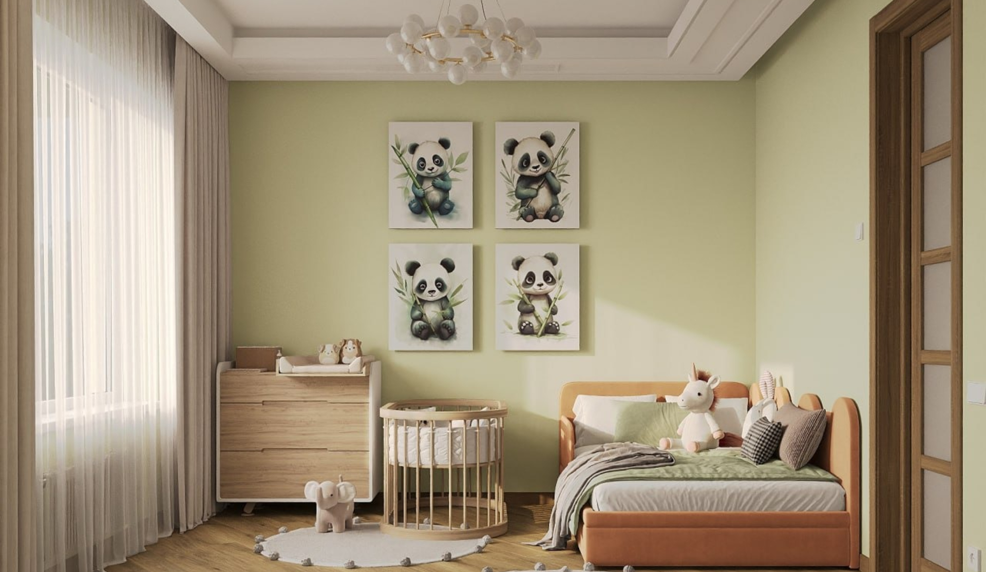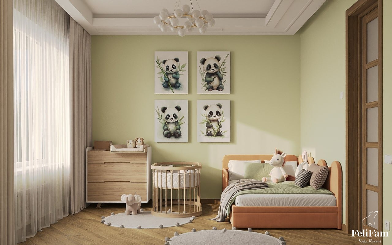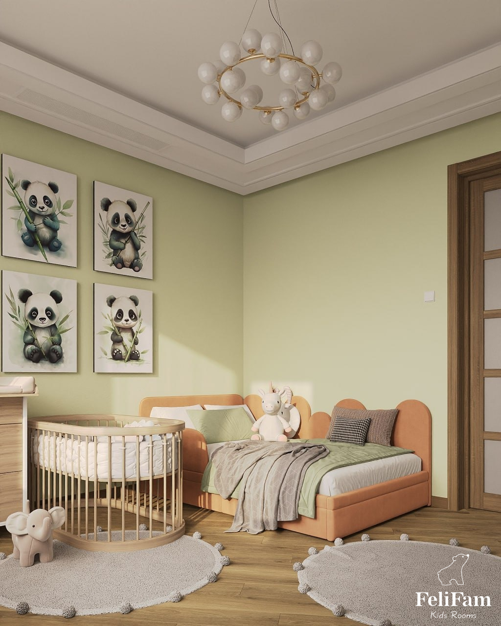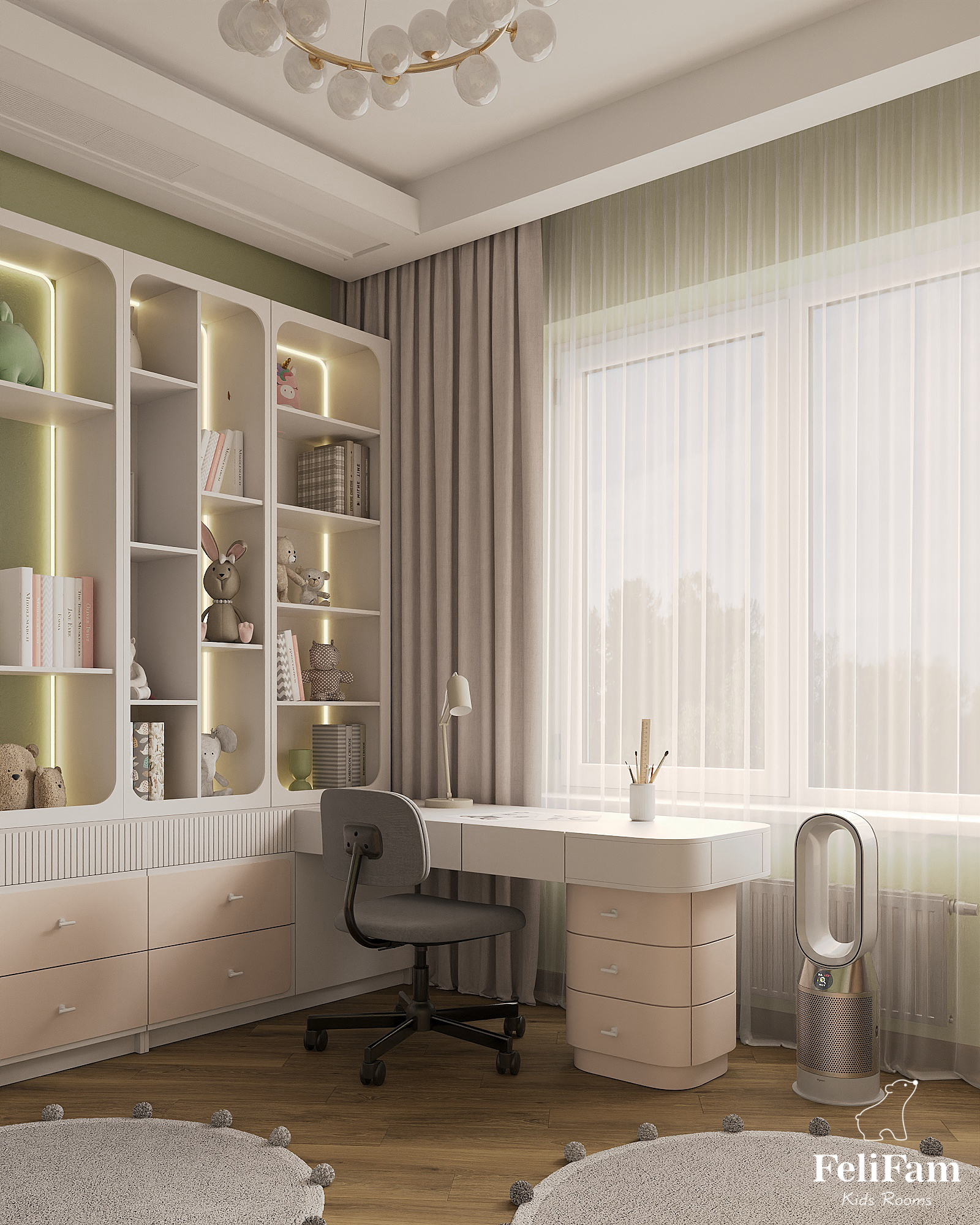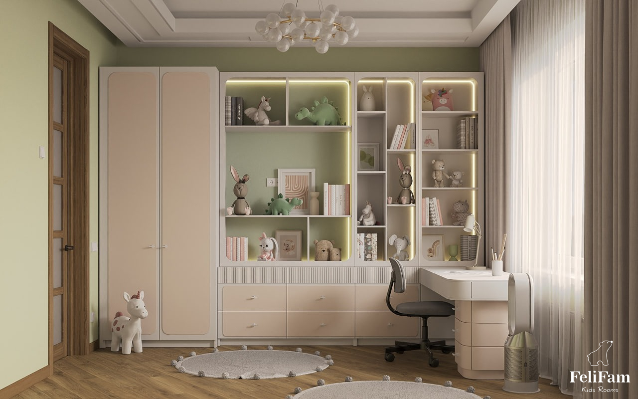A cozy room for a little girl in delicate shades of beige with accents of peach and olive. The shelf is milled and illuminated, and the bed has a safety edge. The study area is designed for the future, so the space is ready for school.