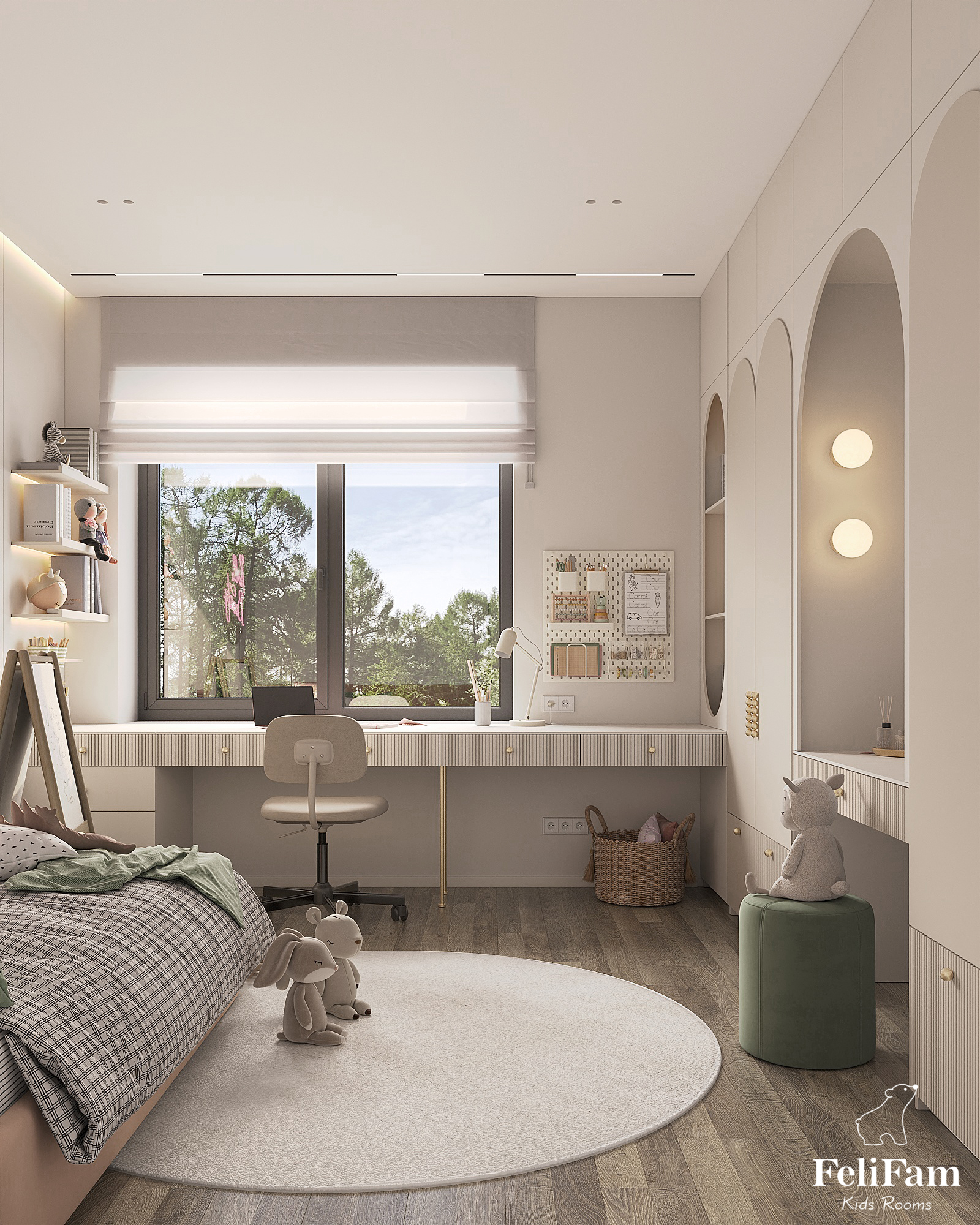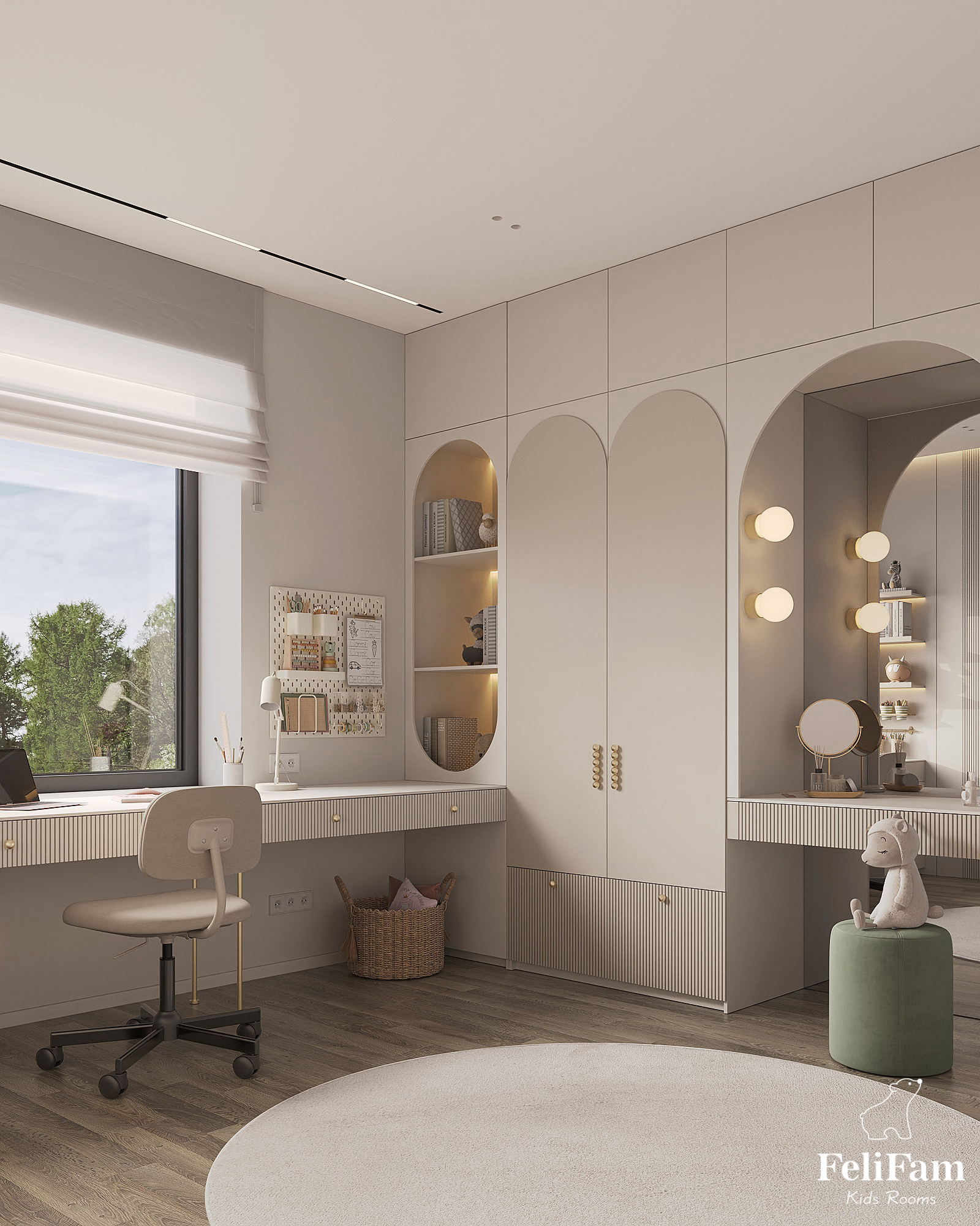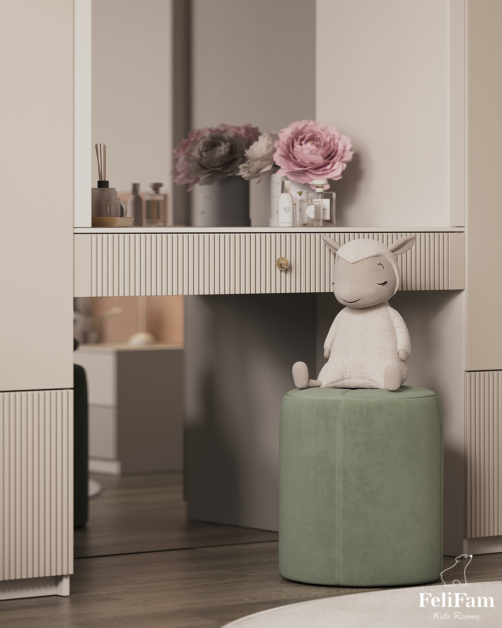 A pastel-colored room with a cozy space for sleeping, a built-in makeup area, a bright and spacious study area, and a spacious wardrobe. We also placed panels on the wall to create a special style.