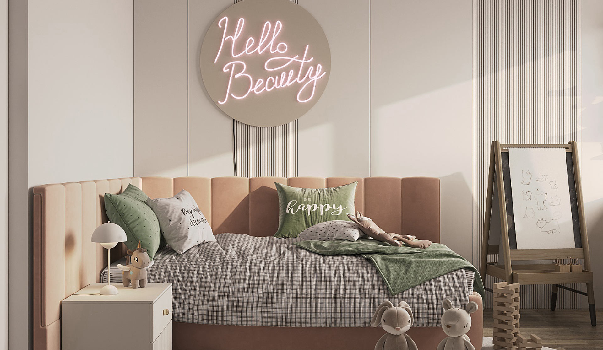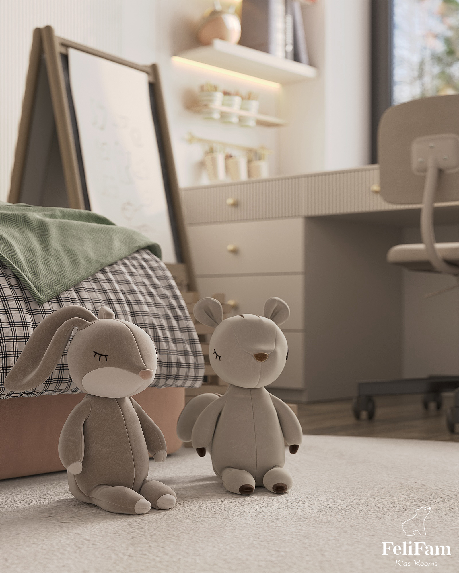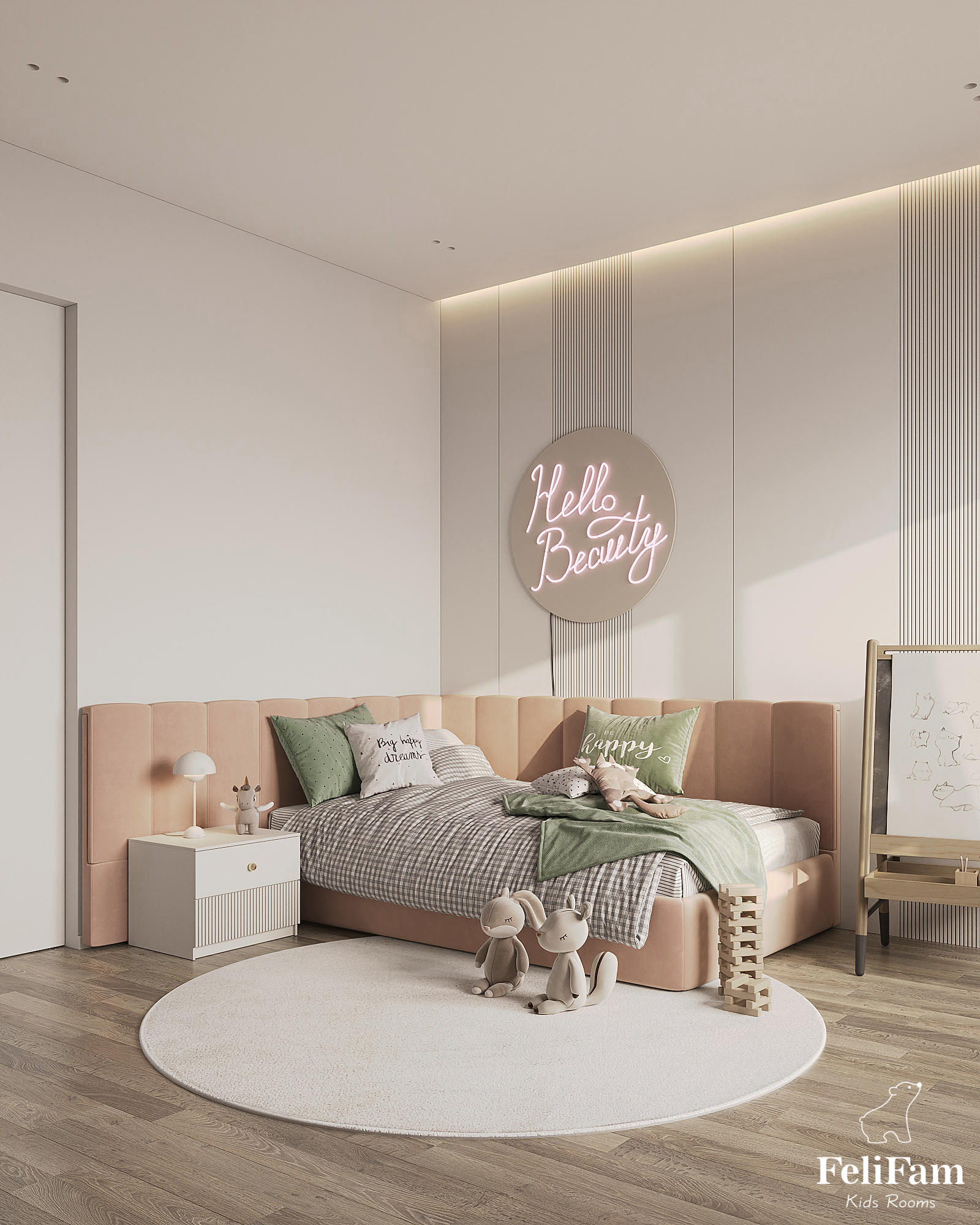 A pastel-colored room with a cozy space for sleeping, a built-in makeup area, a bright and spacious study area, and a spacious wardrobe. We also placed panels on the wall to create a special style.