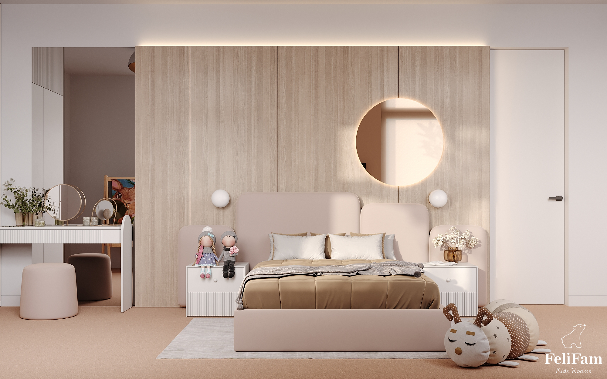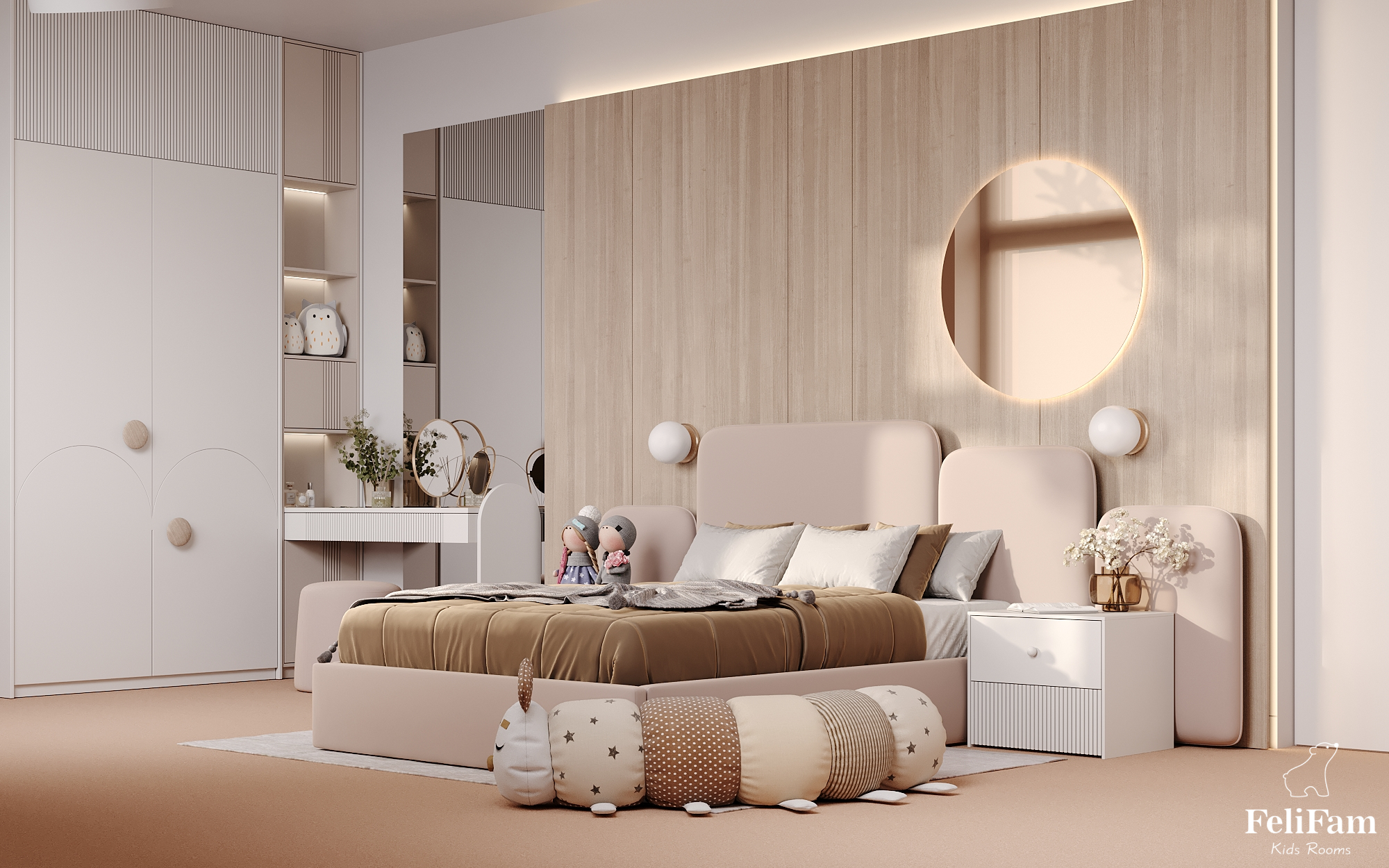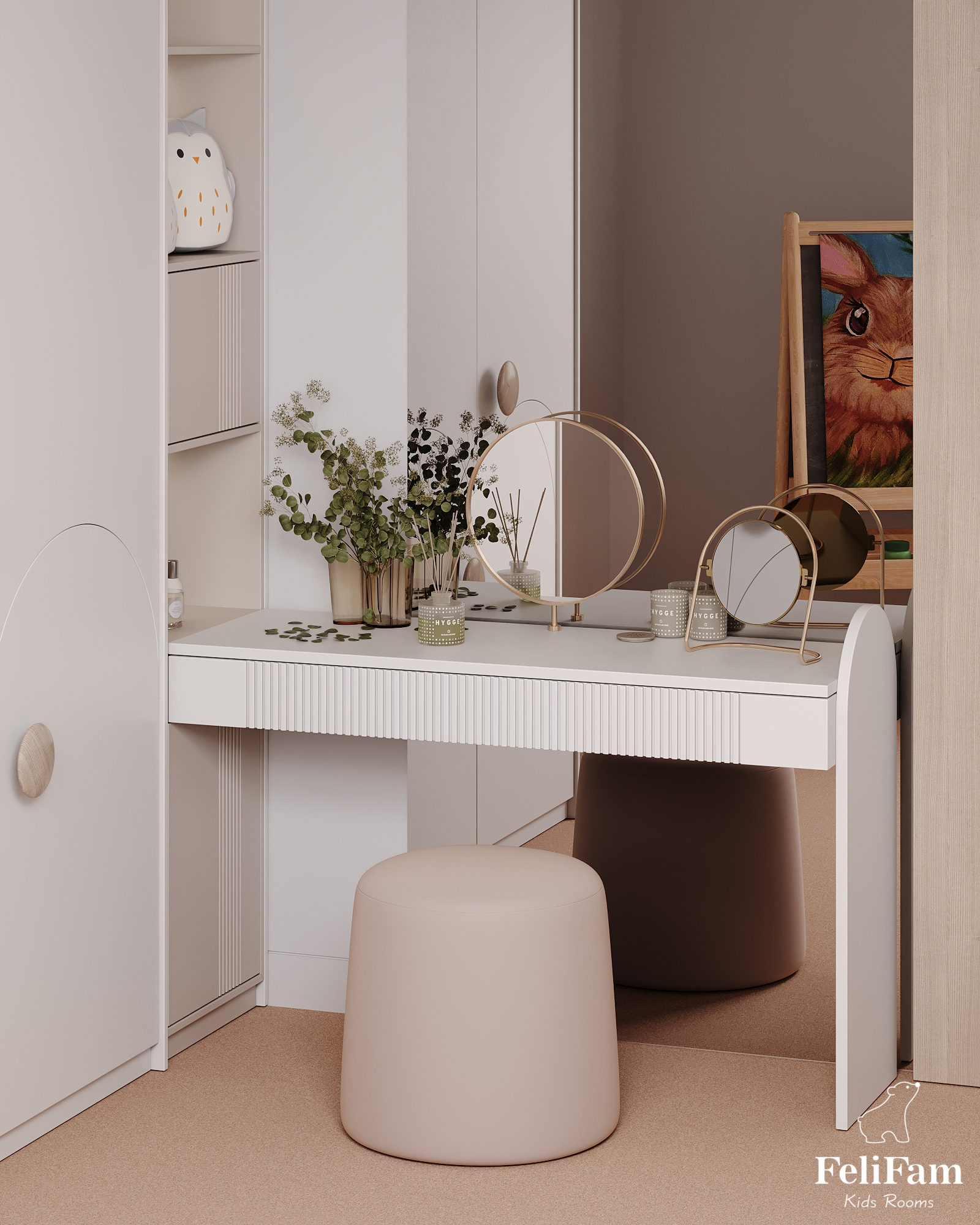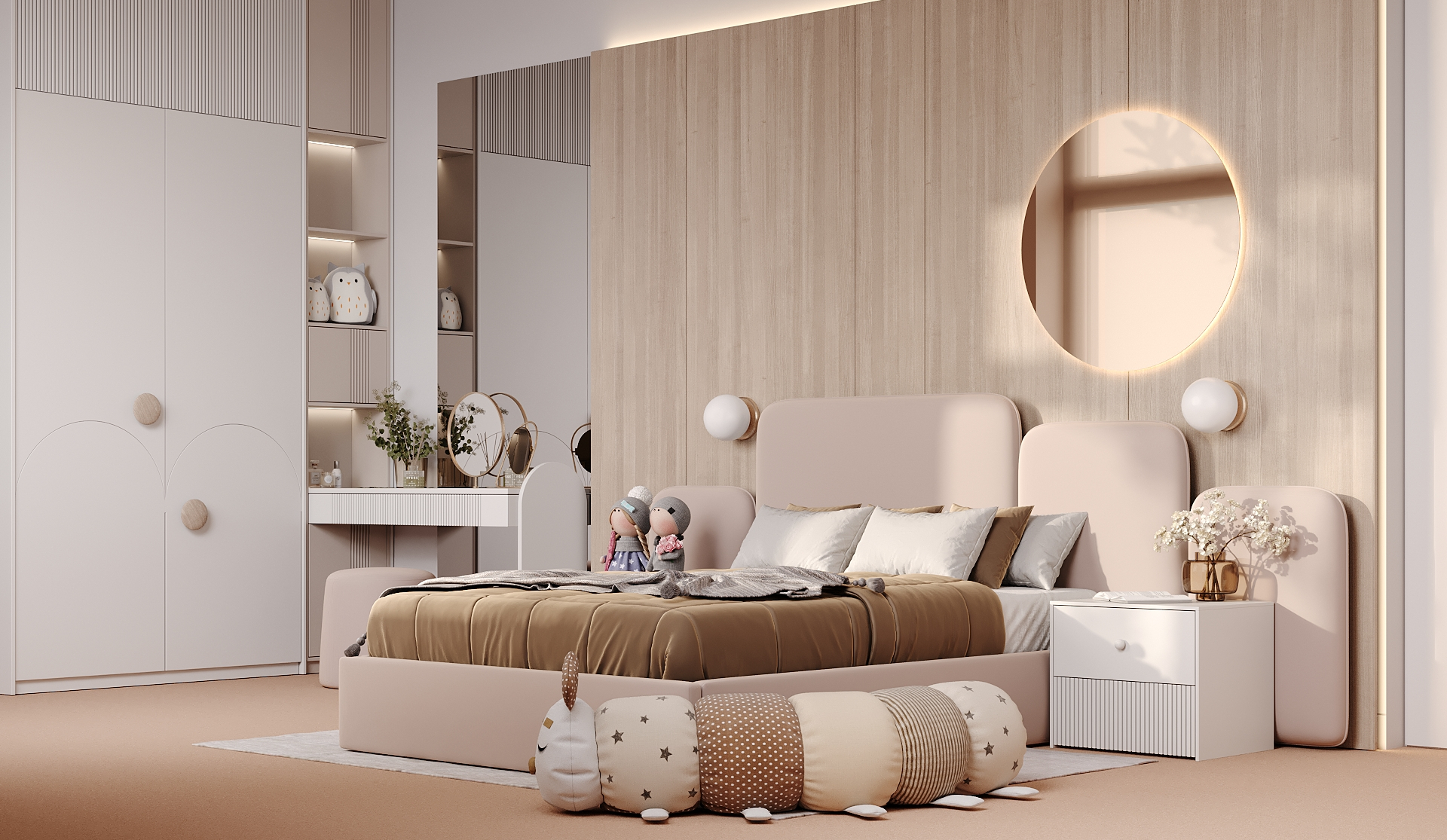 There is a double bed with upholstered panels and 2 bedside tables with milling. There is also a dressing table and a wardrobe. We also placed a comfortable study area.