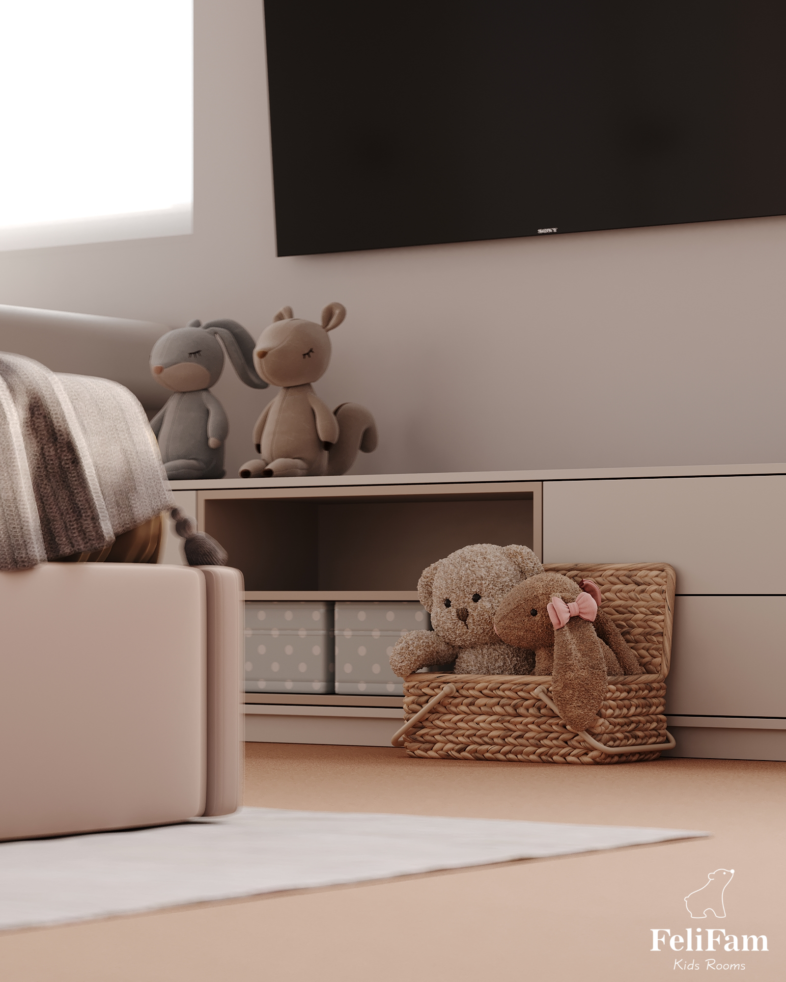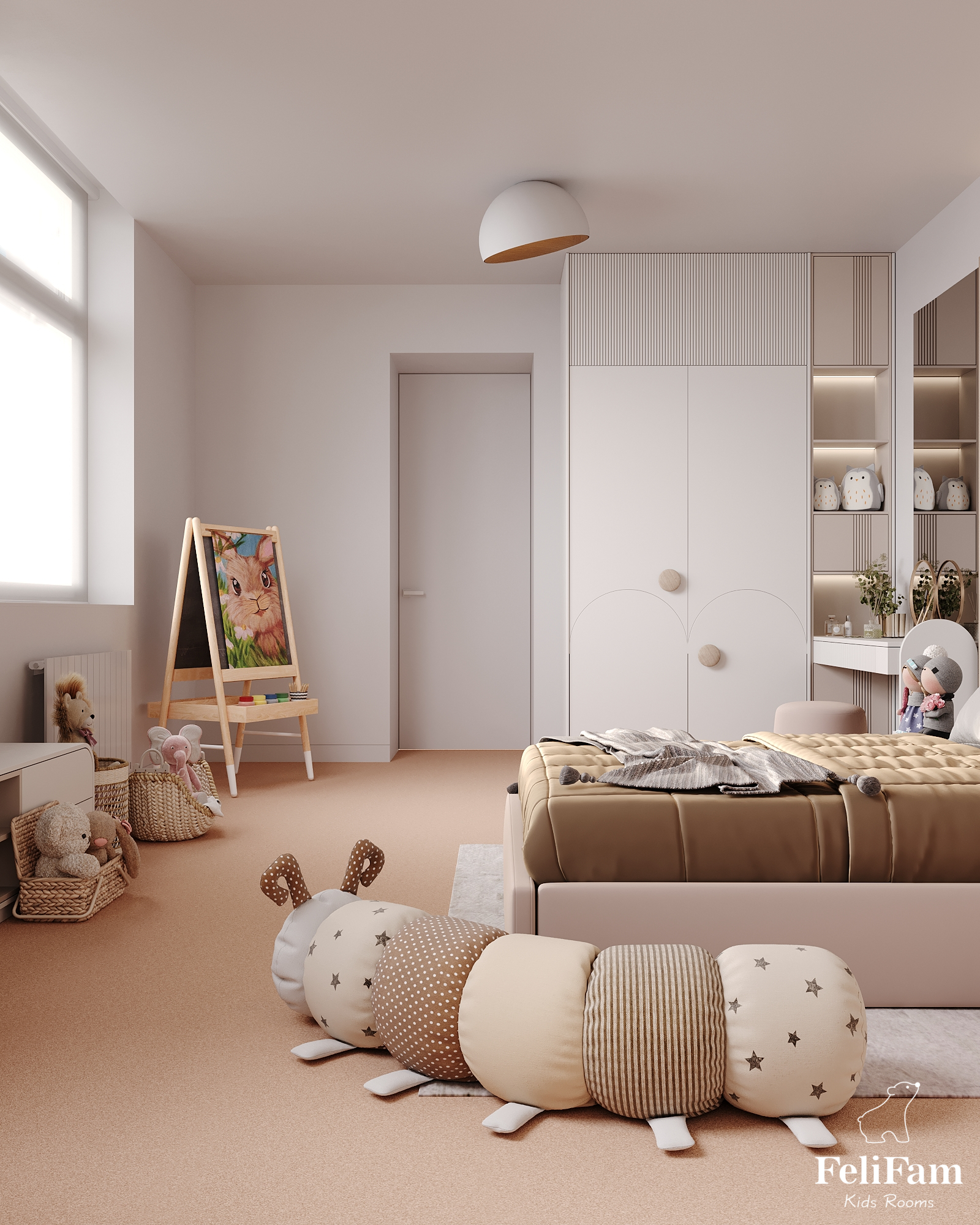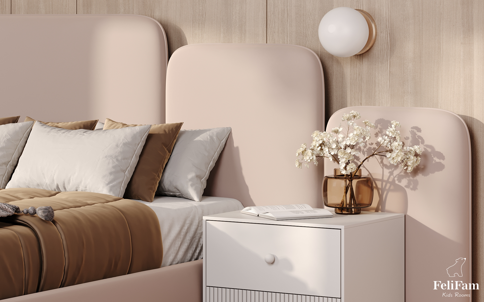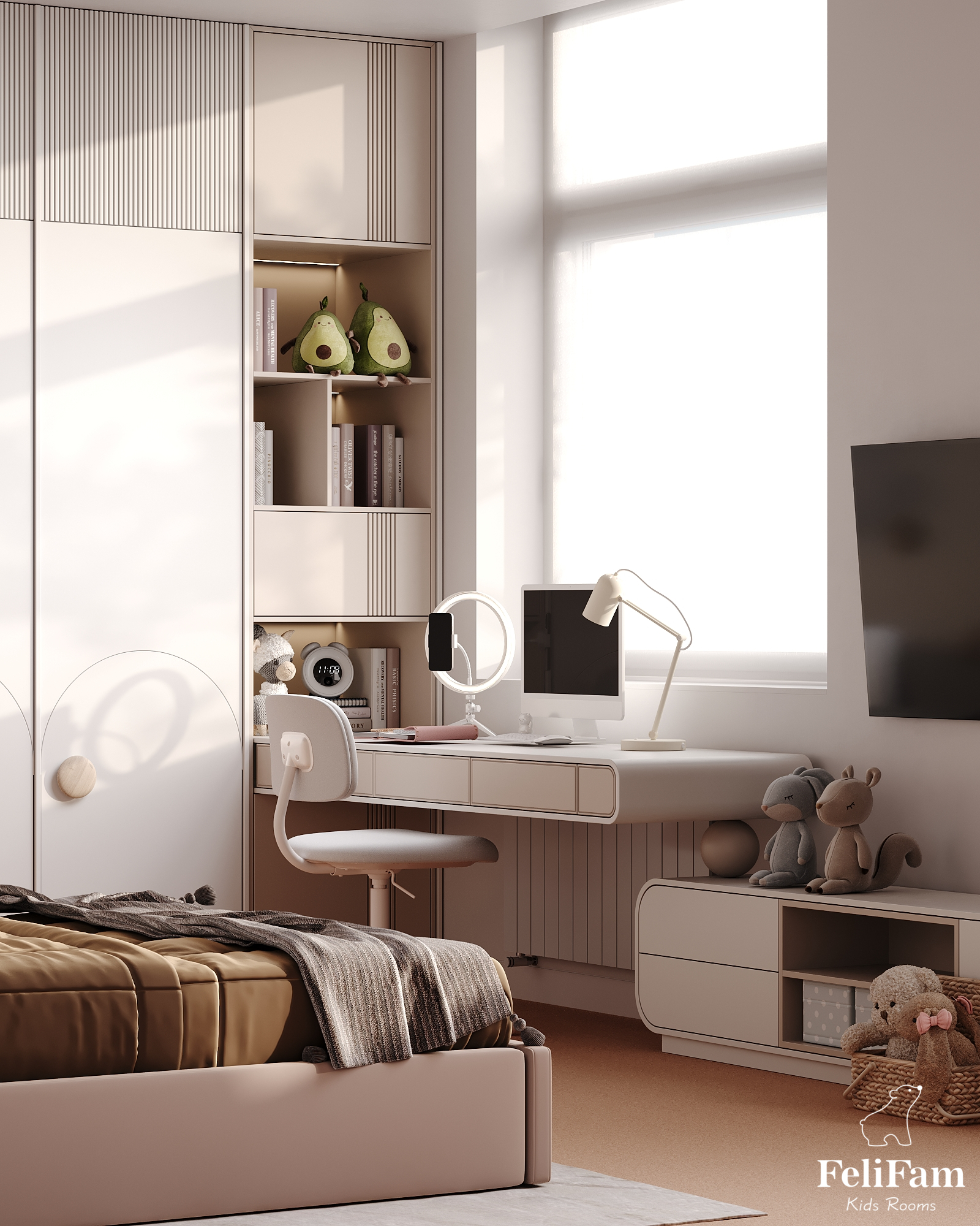 There is a double bed with upholstered panels and 2 bedside tables with milling. There is also a dressing table and a wardrobe. We also placed a comfortable study area.