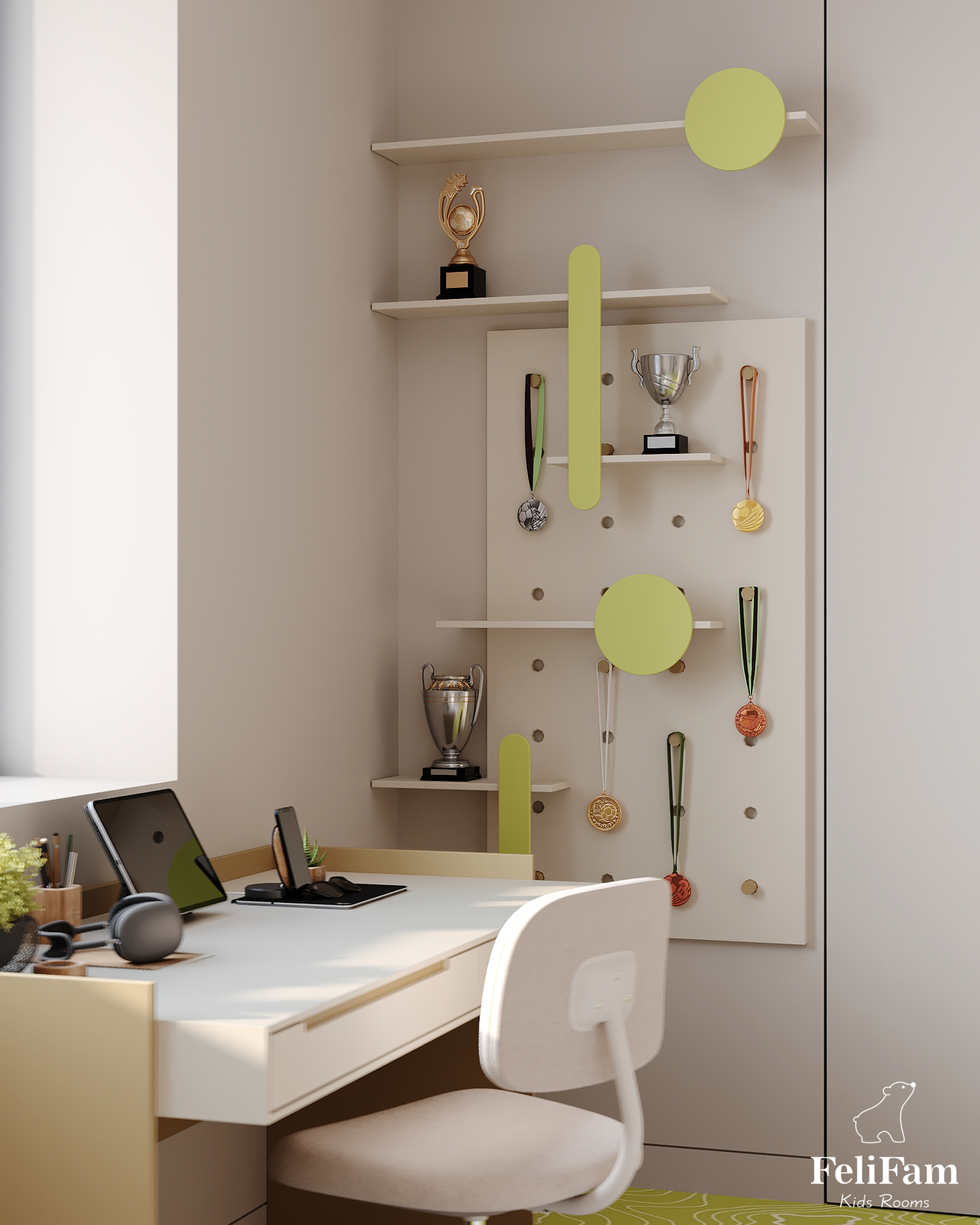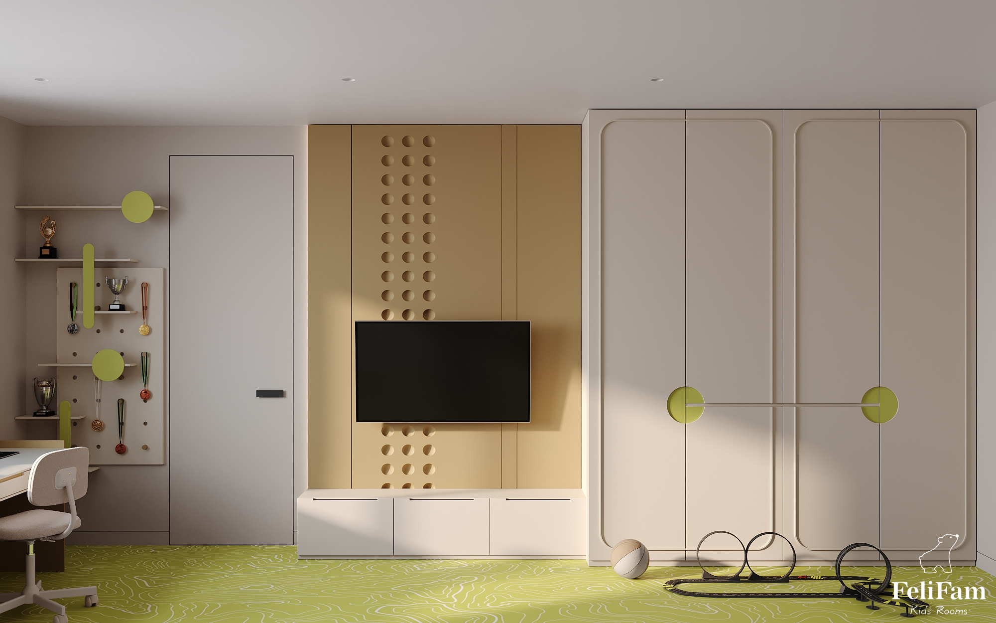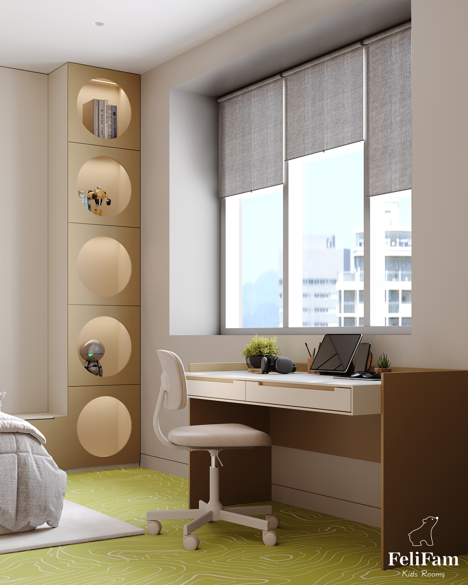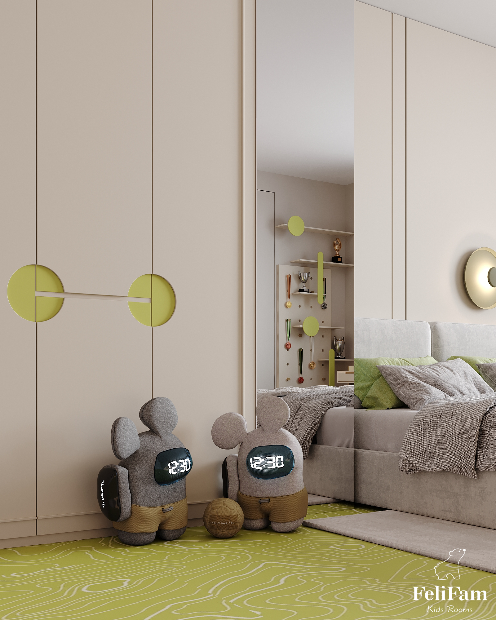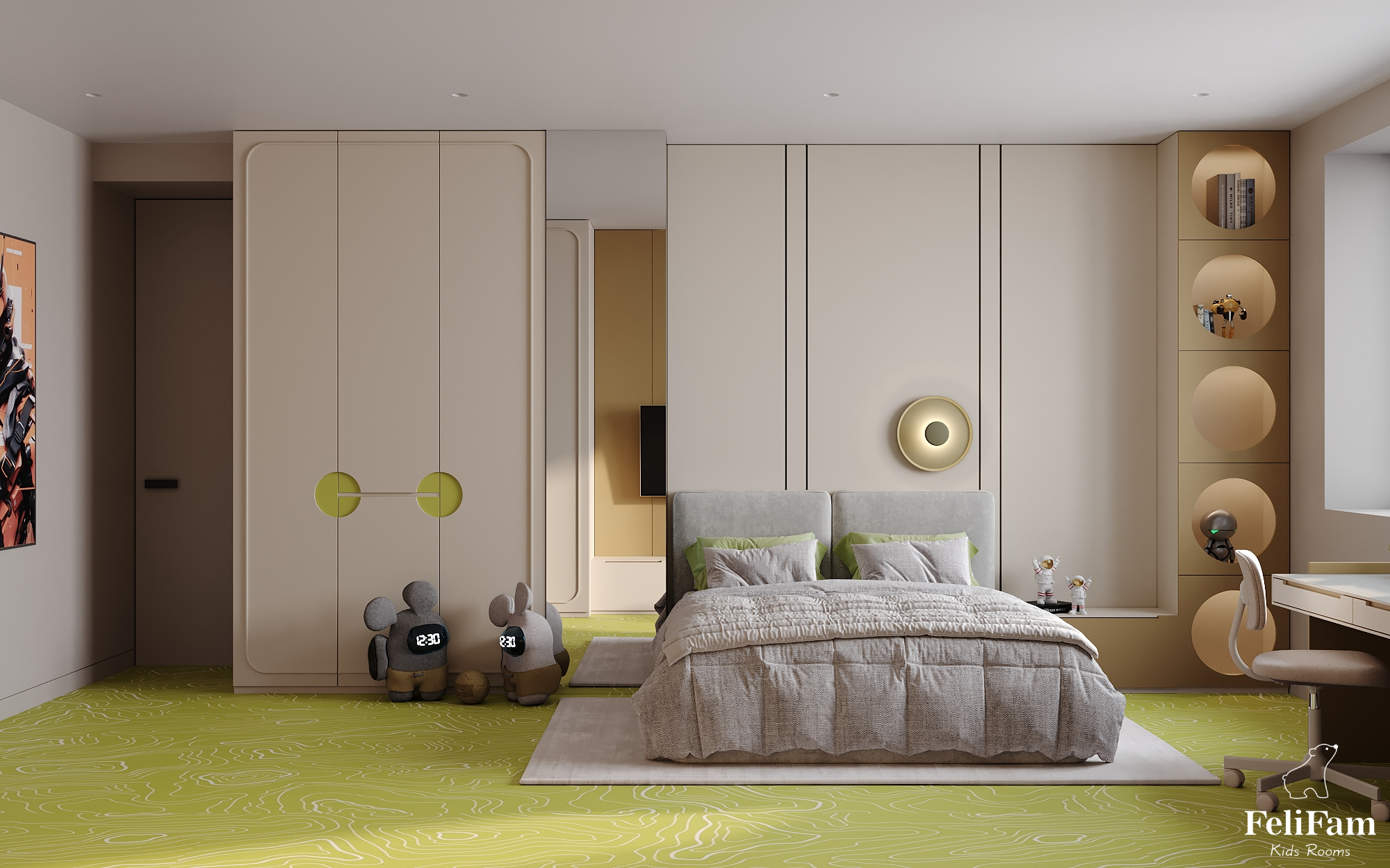 This is a boy’s room where he chose the floor color himself, so we created a design that will look balanced.