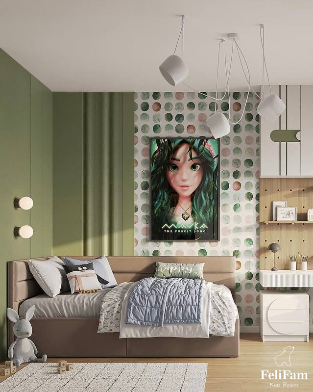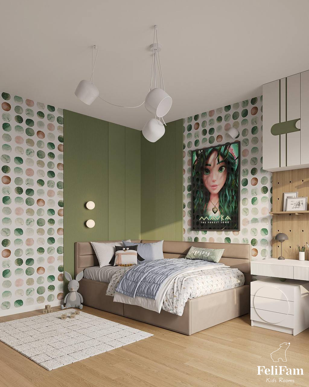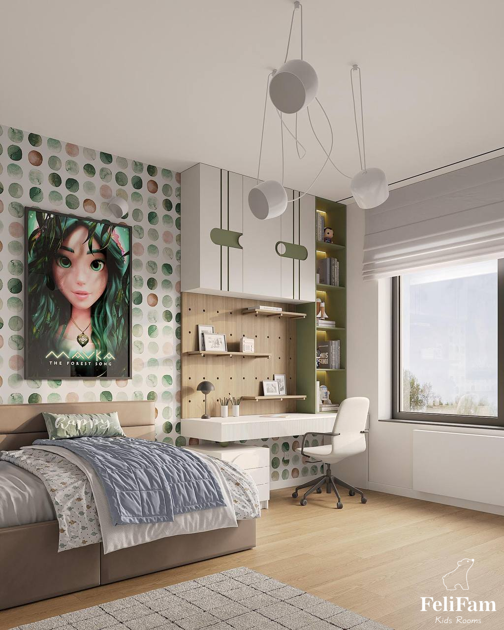 At the request of the parents, we used the space (17m2) as efficiently as possible, placing a comfortable bed, a functional study area and a large wardrobe with shelves for storing things, books and clothes. And above the bed, we placed a place for a poster where you can change the image depending on the child’s hobbies. Now it’s Mavka 🙂