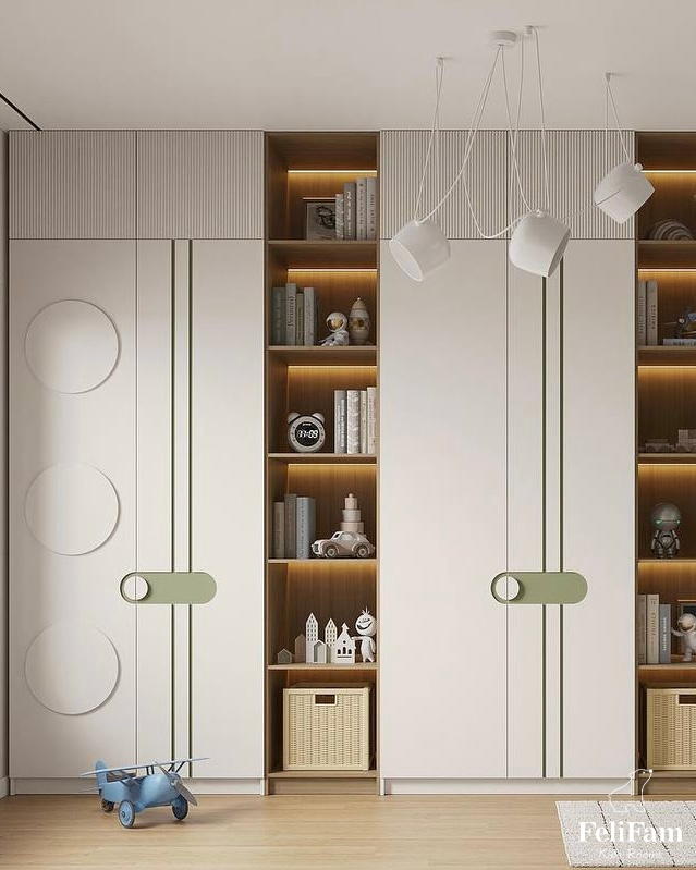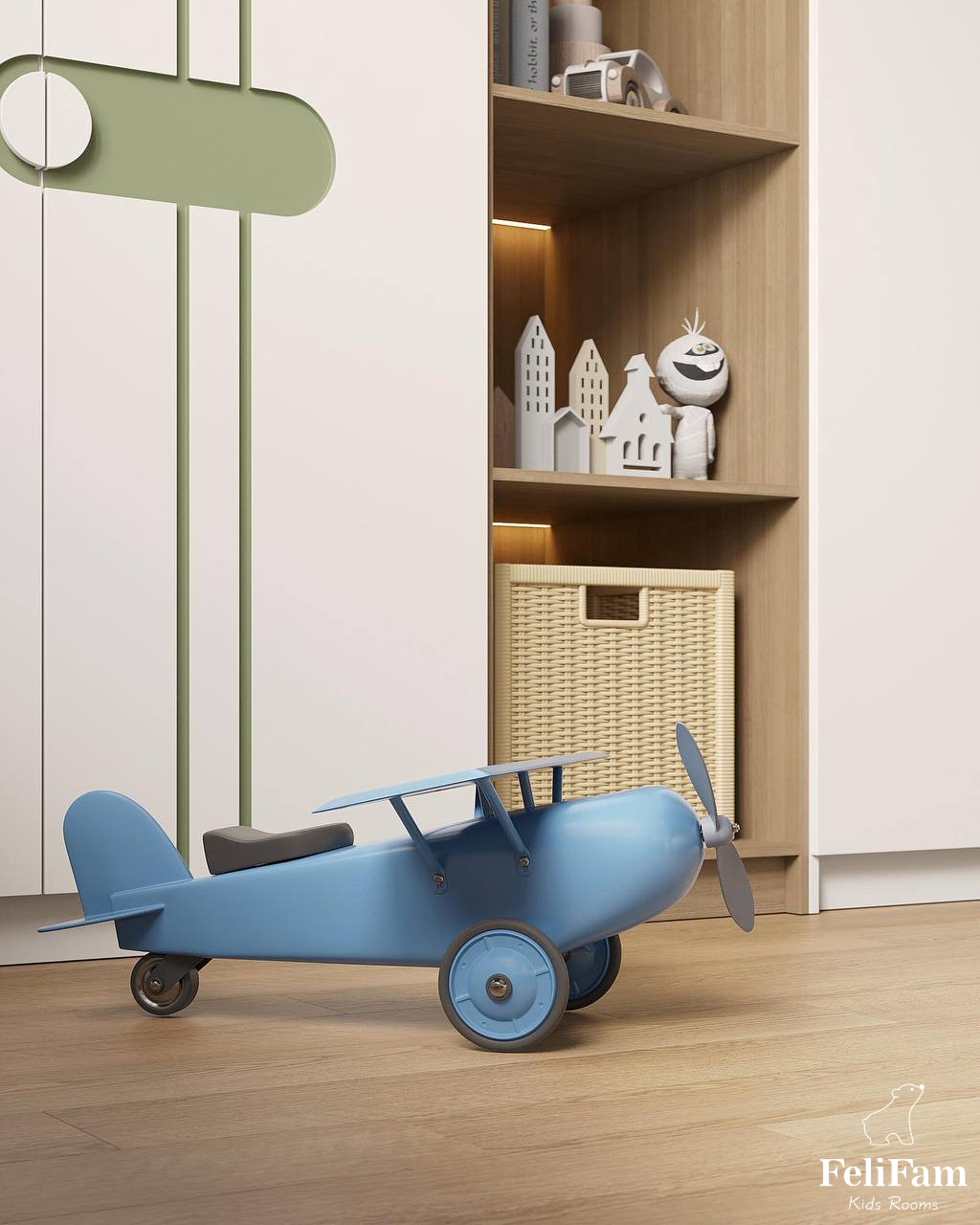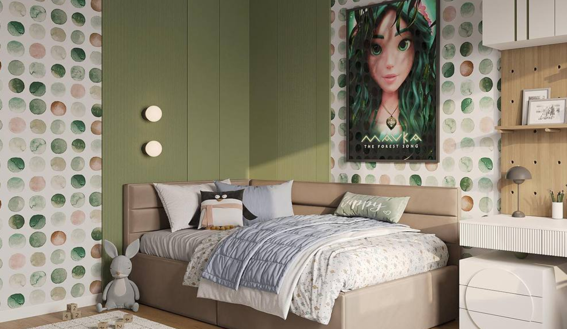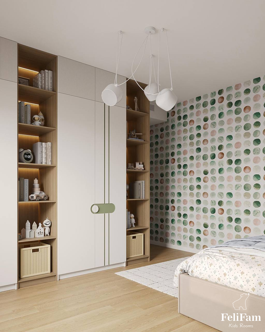 At the request of the parents, we used the space (17m2) as efficiently as possible, placing a comfortable bed, a functional study area and a large wardrobe with shelves for storing things, books and clothes. And above the bed, we placed a place for a poster where you can change the image depending on the child’s hobbies. Now it’s Mavka 🙂