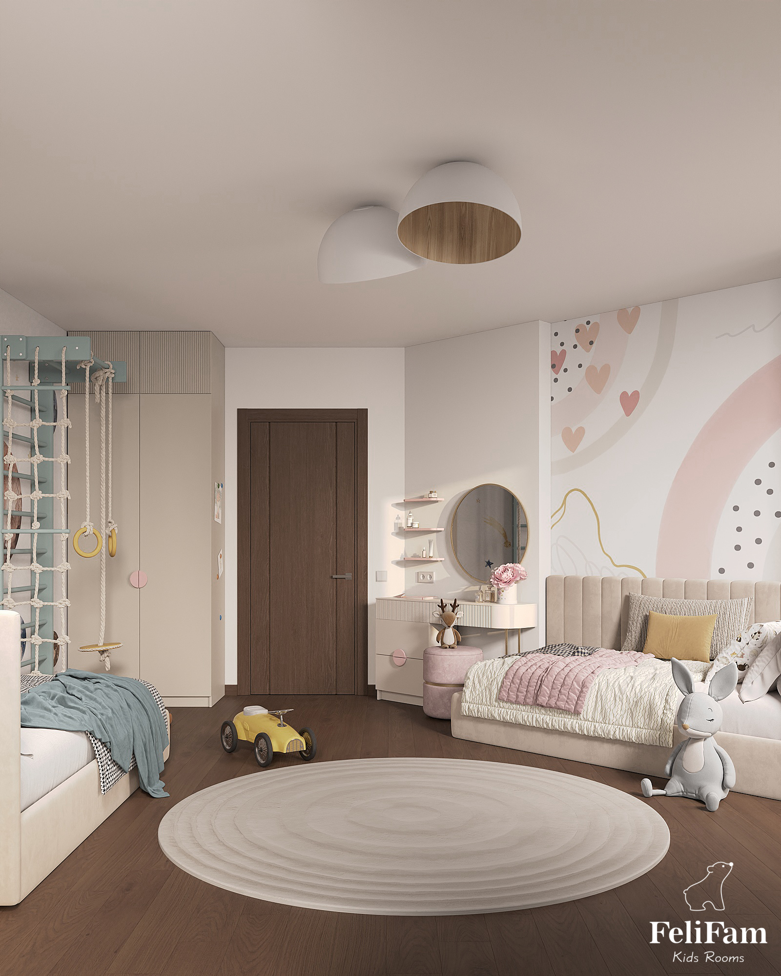 An important request was to make two separate beds, so we divided the room into a space for the boy with his own study area, a sports corner, and a space for the girl with a dressing table.