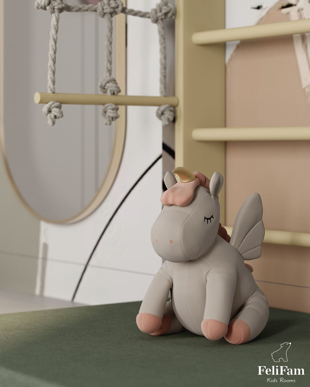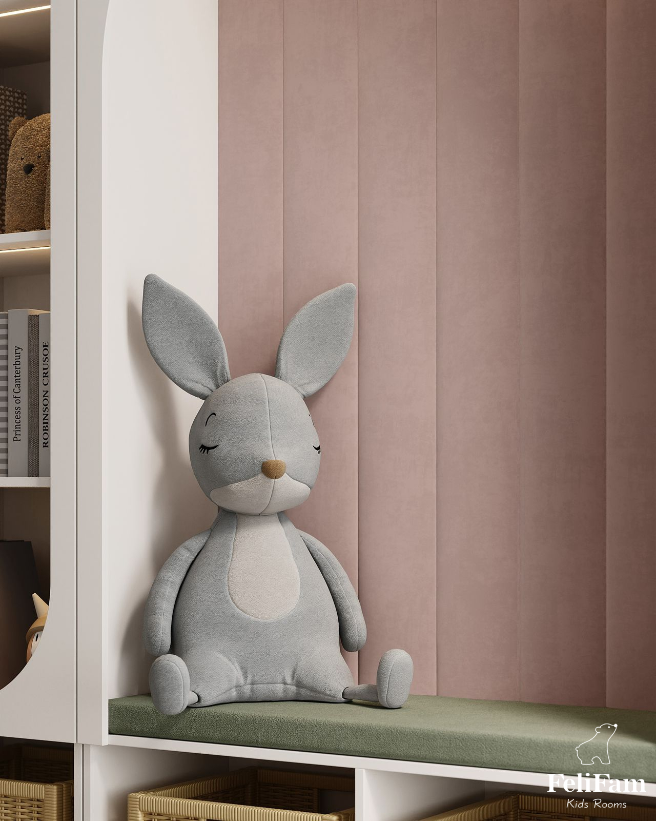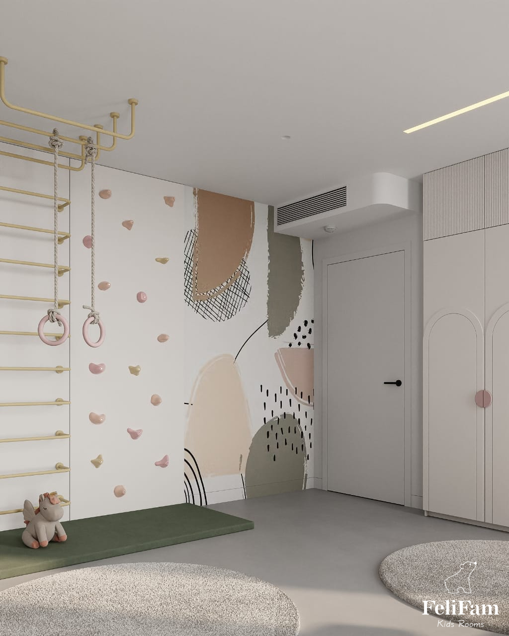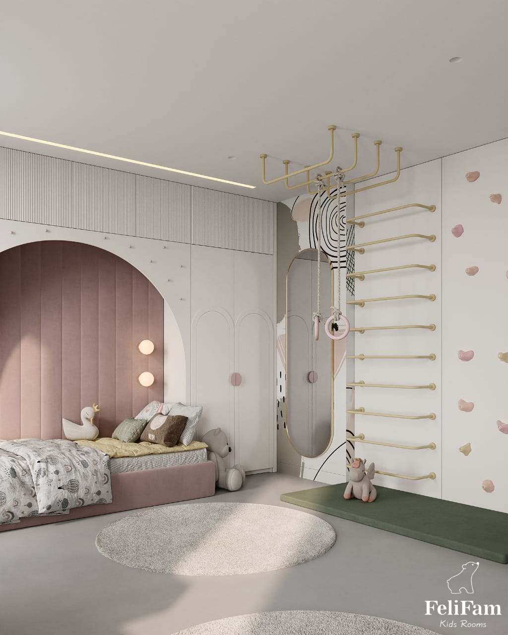 In this project, we used a shade of dusty rose and rich green as accent colors. The girl is active, and the room has handrails that look stylish and minimalistic.