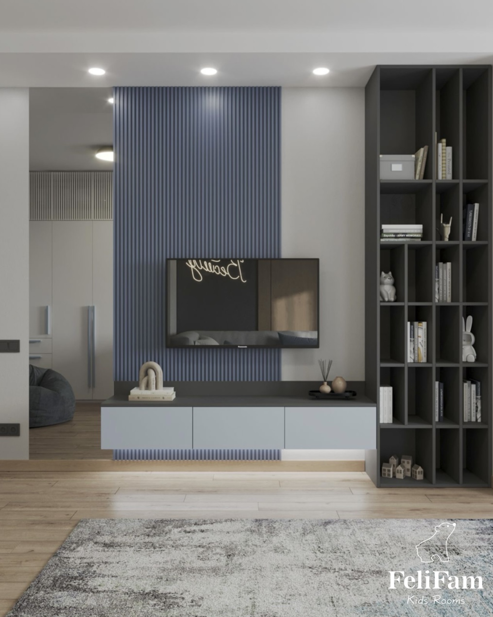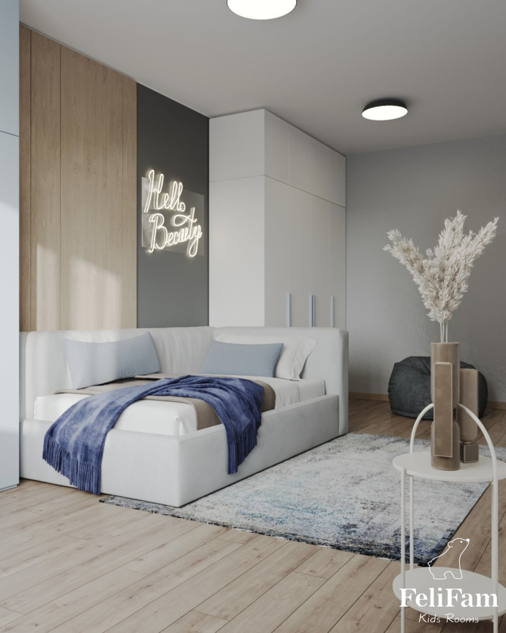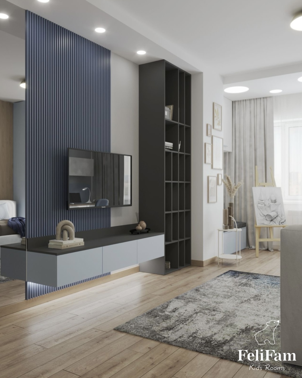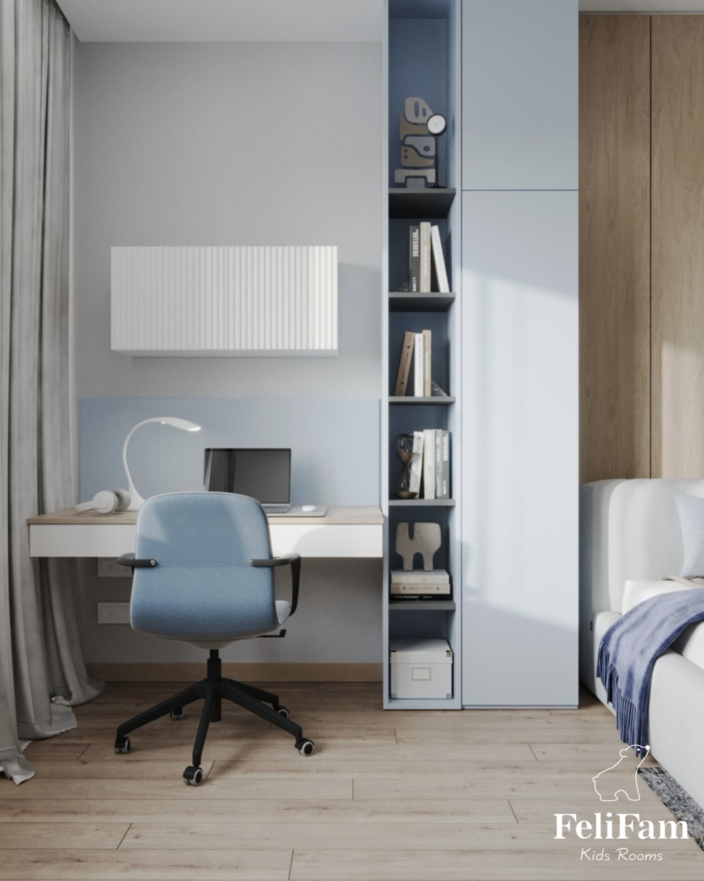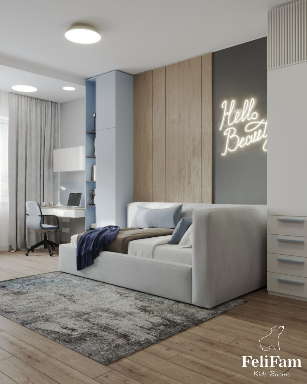 We placed two wall panels – one in the TV area and the other near the bed. Next to the window there is a place for relaxation and creativity, and opposite is a table for studying. In general, the room creates a cozy and warm atmosphere where the girl will enjoy spending time.