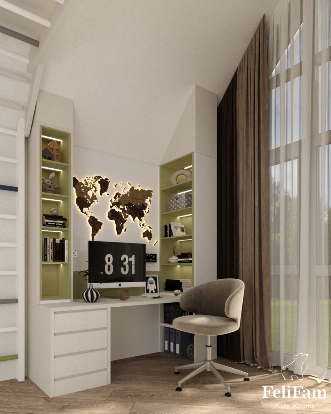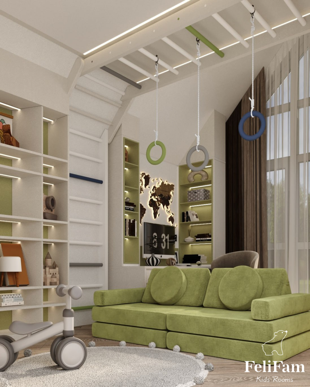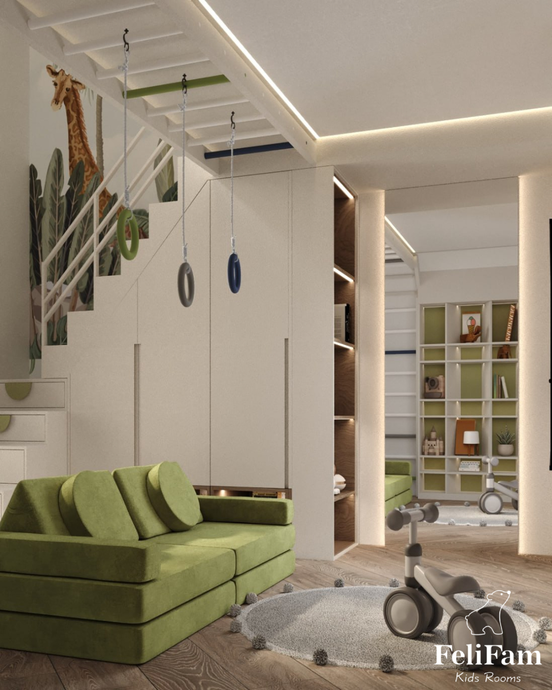 Take a look at this little boy’s nursery! It is designed for comfort, filled with light and energy. The accent green color helps to concentrate and have fun. We also added a second floor – a space for sleeping and relaxing.